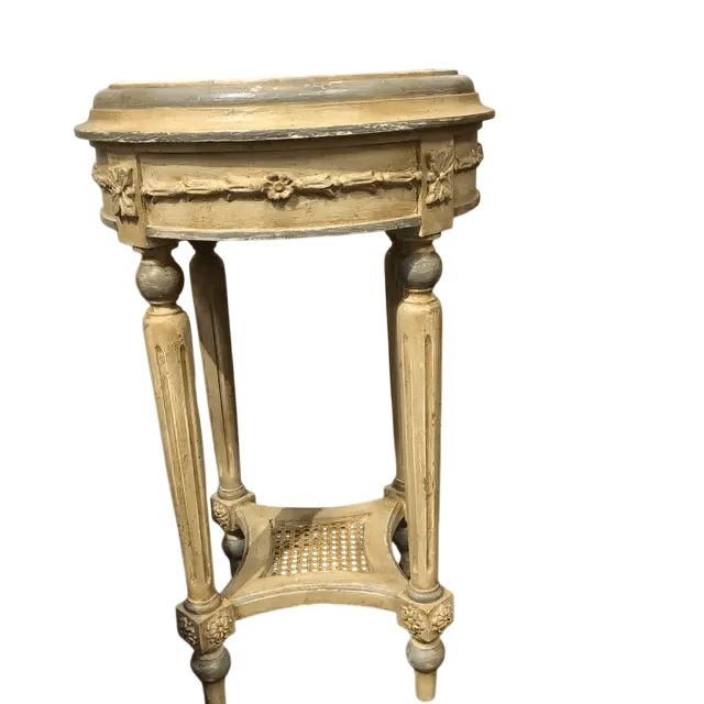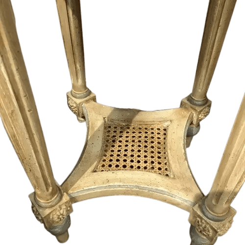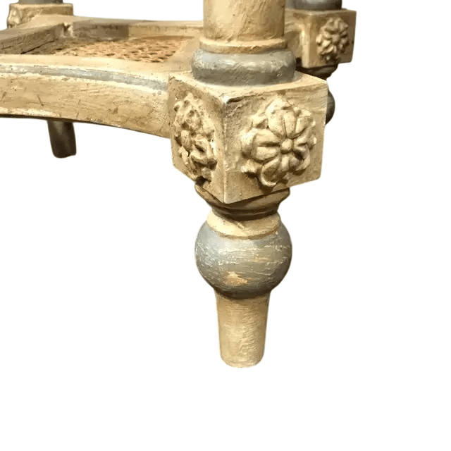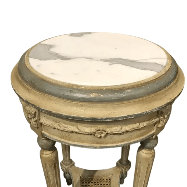 Four gracefully turned and fluted legs support the table, connected by a lower woven cane stretcher shelf that adds both function and visual charm. Created in Italy and offered in new condition, the harmonious combination of ivory marble, carved woodwork, and soft painted accents gives this table a timeless and sophisticated presence.