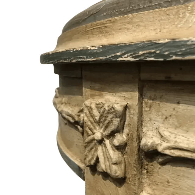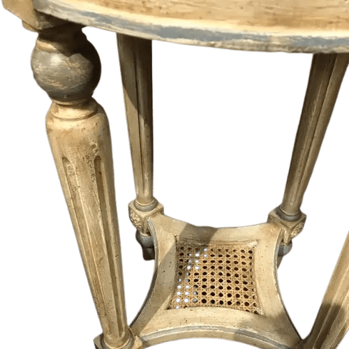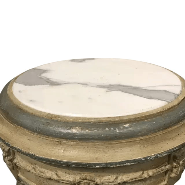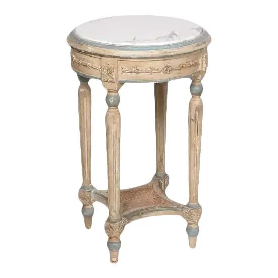 This elegant Italian hand-carved occasional table showcases classic European craftsmanship with a beautifully shaped round marble top in soft ivory tone. The hand-carved wooden frame is finished in antique cream with subtle blue-gray accents along the sides, giving the piece a refined old-world Italian character. The apron is richly detailed with hand-carved floral and ribbon motifs, highlighting the artistry and traditional techniques of Italian furniture making.