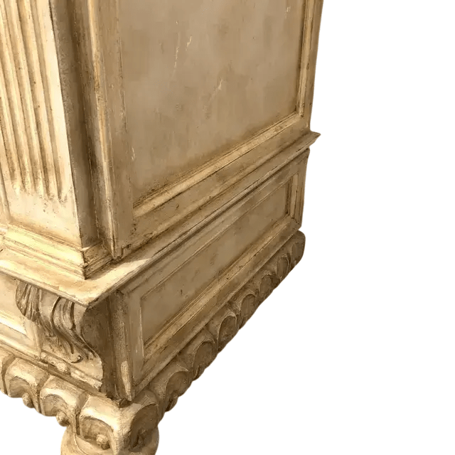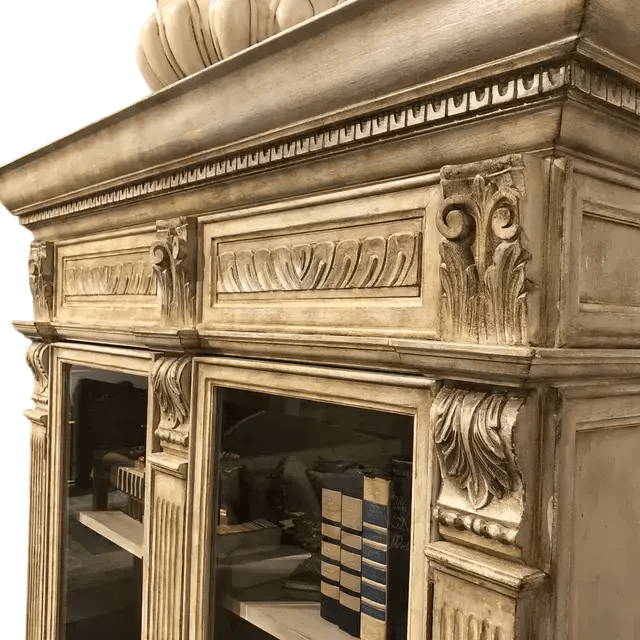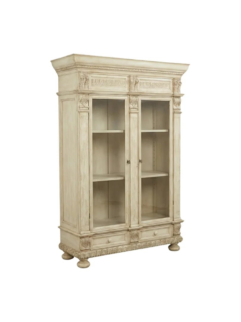 This hand-carved vitrine cabinet features a soft antiqued white finish with light distressing, blending classic elegance with timeless craftsmanship. The piece showcases elegantly carved wooden detailing throughout, including acanthus leaves and crown molding, reflecting skilled artisan work.