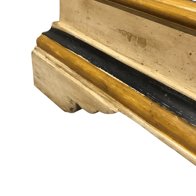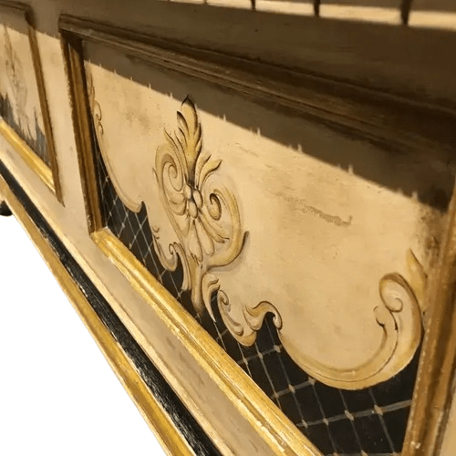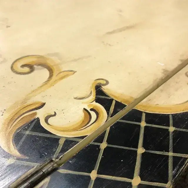 This Italian hand-painted wooden trunk is a striking example of vintage Italian decorative craftsmanship. The piece features a hinged lid and a beautifully painted exterior in ivory, black, and gold tones, creating a bold yet elegant contrast. Its wooden construction highlights the traditional artistry associated with Italian hand-painted furniture, making it both functional and visually distinctive.