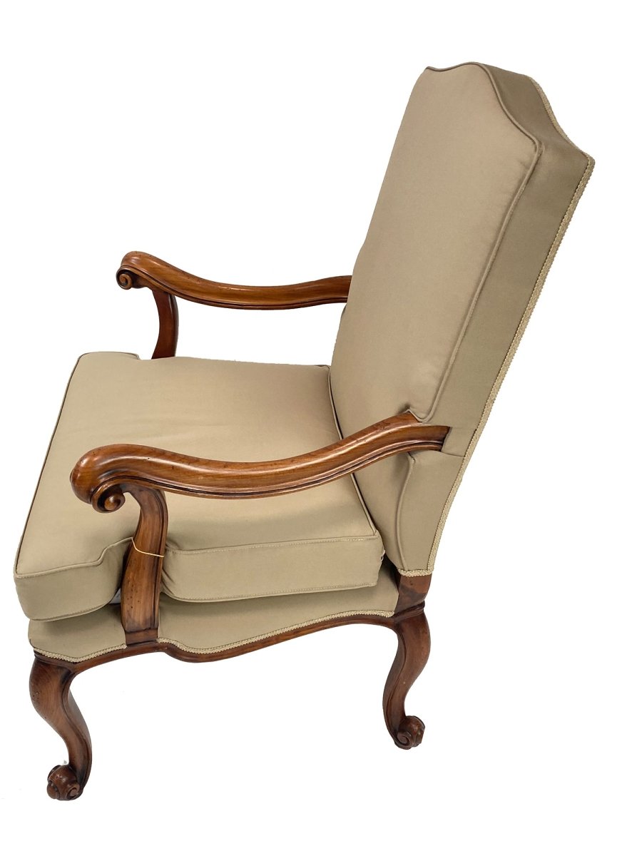 This Italian walnut arm chair features a classic wooden frame with gently curved cabriole legs. The design is simple yet traditional, highlighting the natural warmth of walnut and the subtle elegance of its silhouette. With its straightforward form and comfortable arm supports, the chair is elegant to match any interior choice.