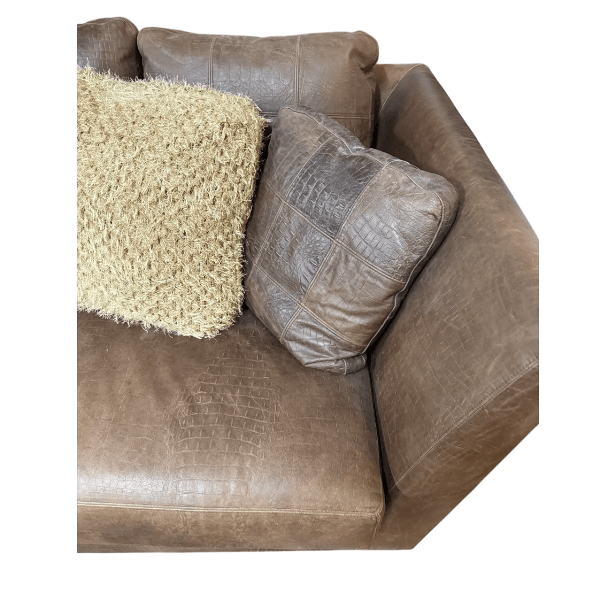 This Italian tuxedo-style sofa makes a bold and sophisticated statement with its rich chocolate brown cowhide leather upholstery embossed with an elegant crocodile pattern. The clean tuxedo silhouette features straight lines with squared arms that align with the back, creating a sleek and structured profile. A single deep seat cushion provides generous seating, while the throw-pillow back arrangement in matching embossed leather adds layered comfort and visual texture.