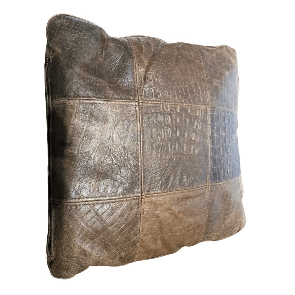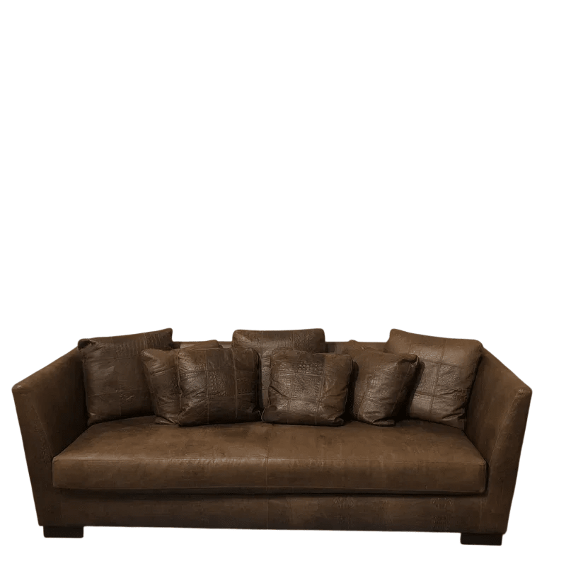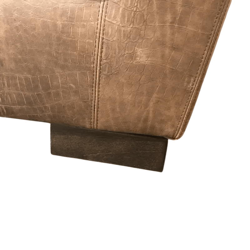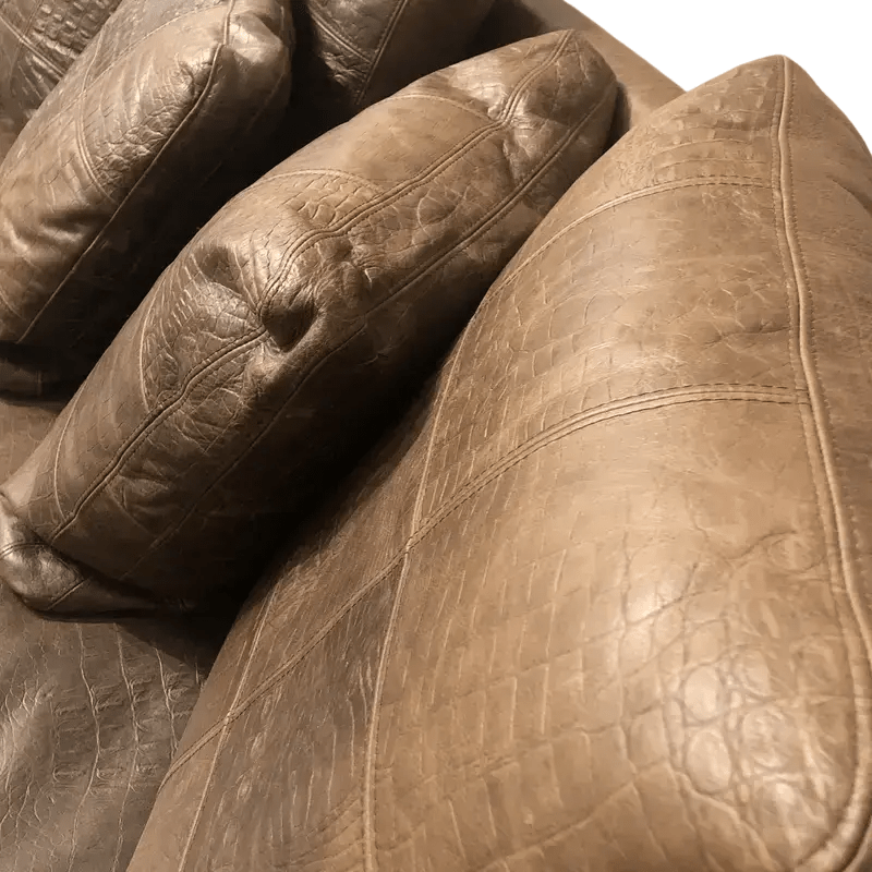 Low dark wooden block feet support the sofa with a sturdy and understated base, allowing the luxurious embossed leather to remain the focal point. Crafted in Italy from premium cowhide leather, the crocodile pattern adds depth and character, giving the piece a distinctive and timeless appeal.