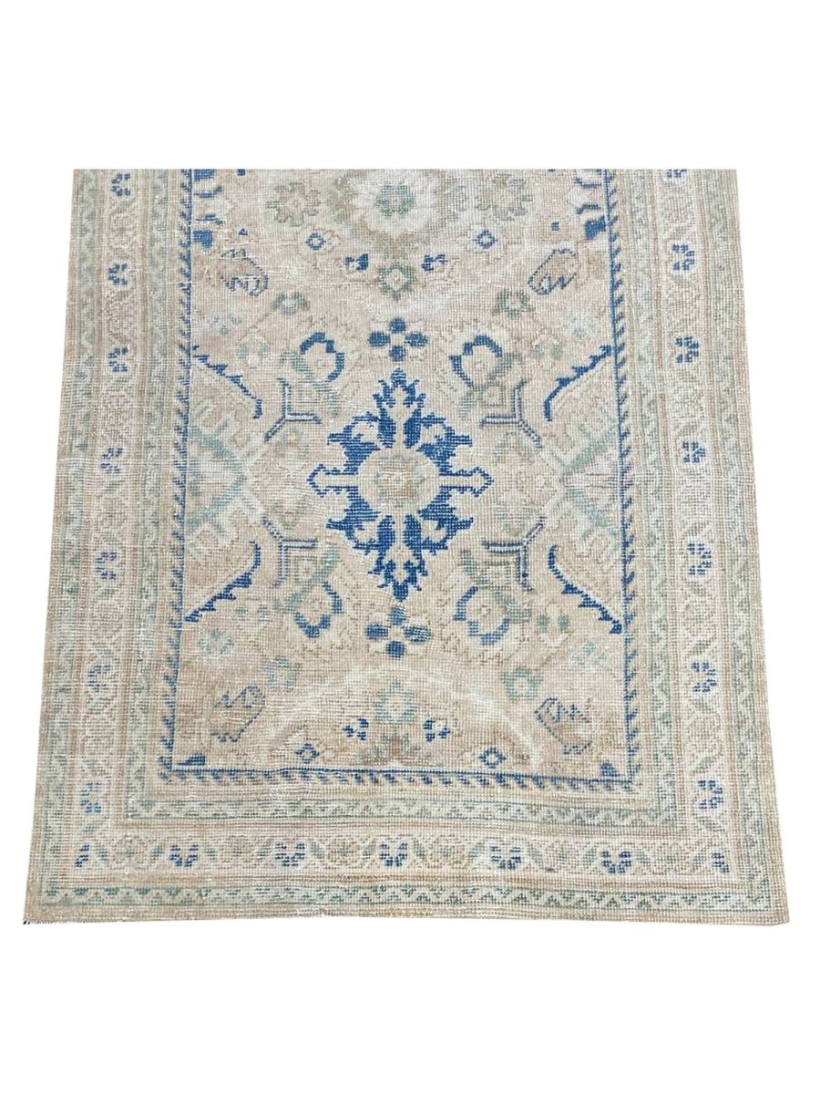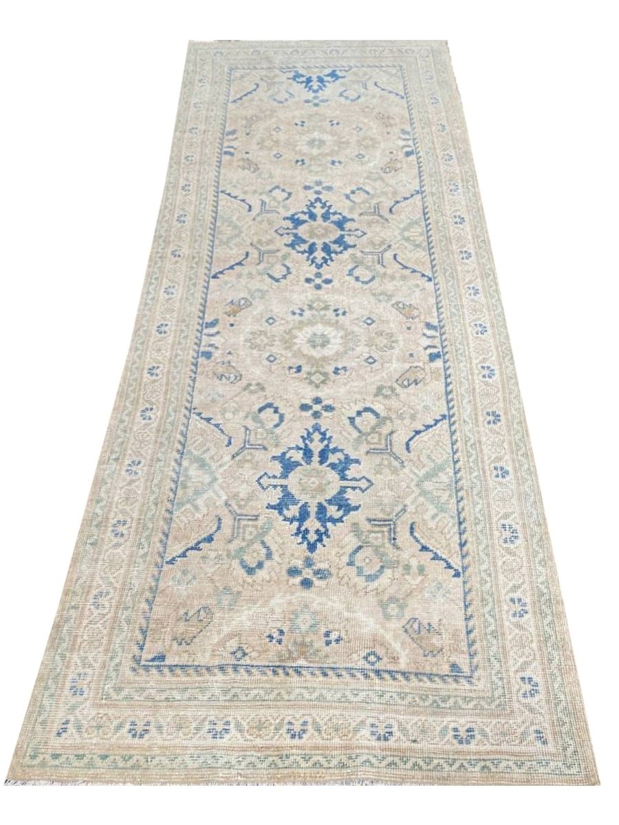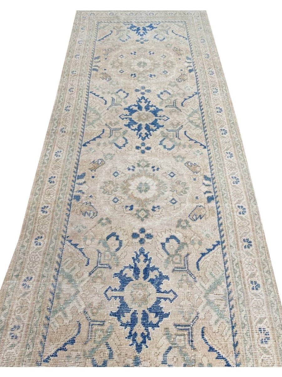 Enhance your home with the timeless charm of this 4x11 Old Persian Mahal Runner Rug. Handwoven in Persia, this rug showcases the enduring craftsmanship of Persian weaving. Its versatile size is perfect for hallways, entryways, and other narrow spaces, adding a touch of traditional elegance to your decor. The geometric pattern offers a classic and sophisticated appeal. The color palette features a soft beige as the primary hue, beautifully contrasted by distinct blue geometric motifs and border accents. These colors work together to create a balanced and inviting aesthetic. Crafted from durable wool, this runner rug is designed for longevity, becoming a cherished element in your home for years. Enjoy the beauty and heritage of a handwoven Persian rug, plus free US shipping.