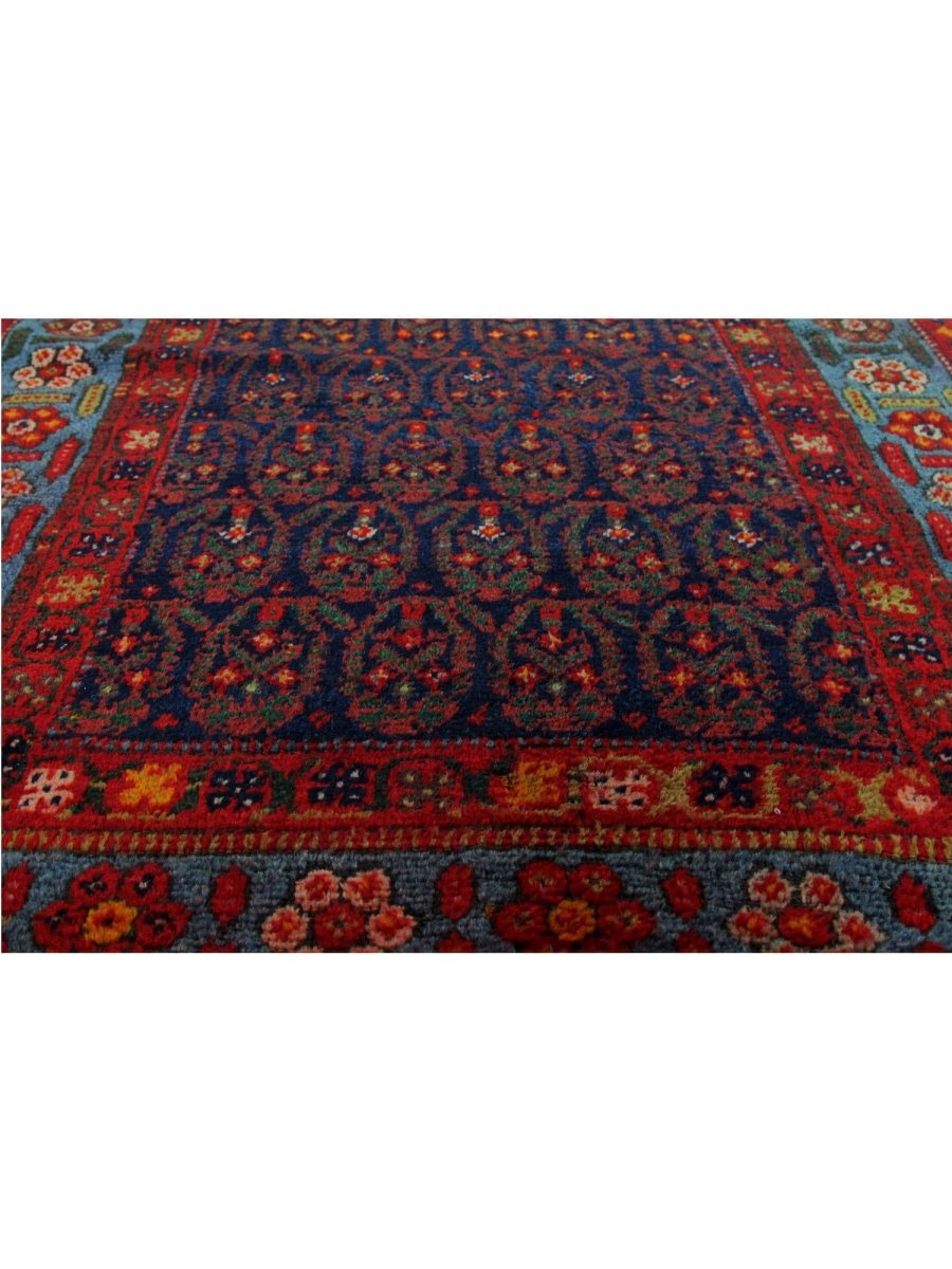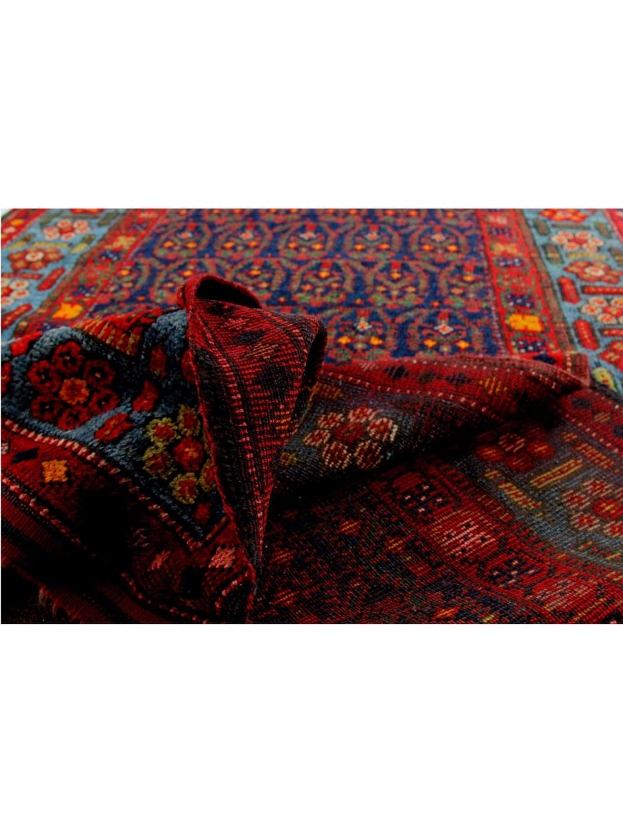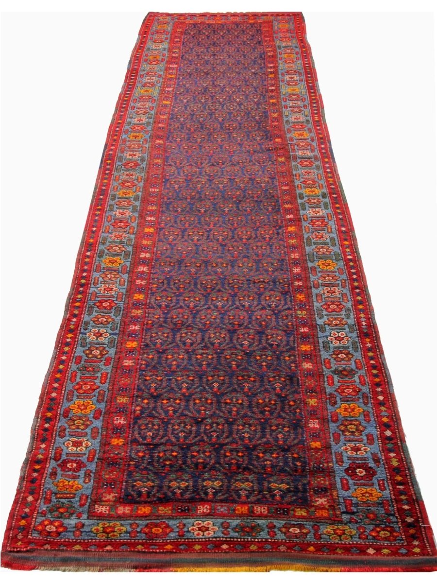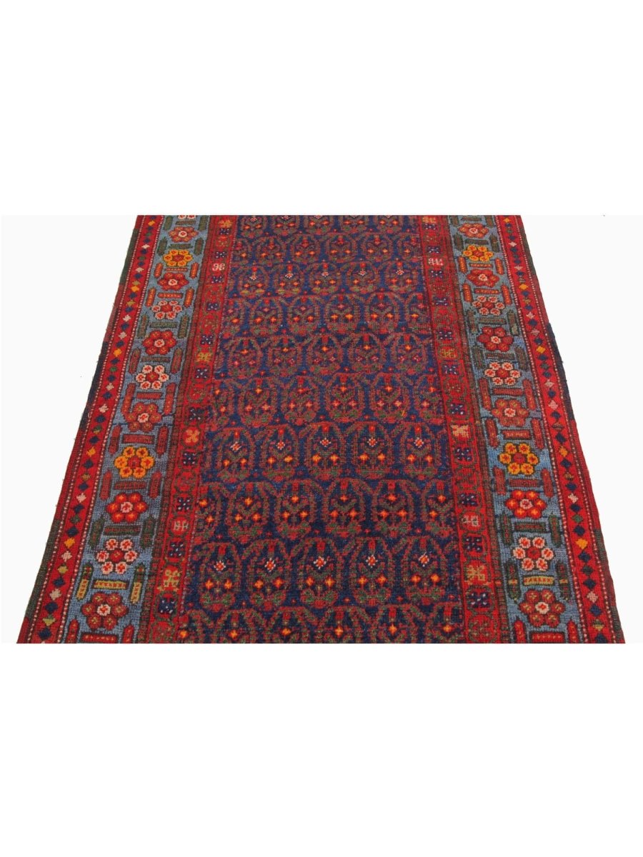 This 4x18 Old Persian Kurdish Runner Rug will add bold character and vivid color to any hallway or small area. Hand-knotted from fine wool, it features a geometric pattern in blue, red, and yellow. Its robust structure withstands everyday wear and tear, while the plush texture guarantees a comforting sensation underfoot. This versatile traditional runner is perfect for enhancing halls, corridors, and entryways, as it skillfully blends classic craftsmanship with a vibrant appearance. When you incorporate this delightful piece into your home, you can enjoy free delivery within the United States.