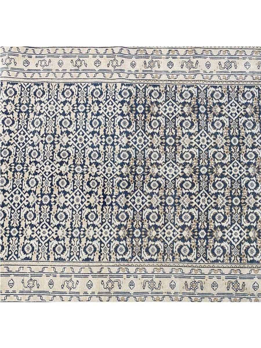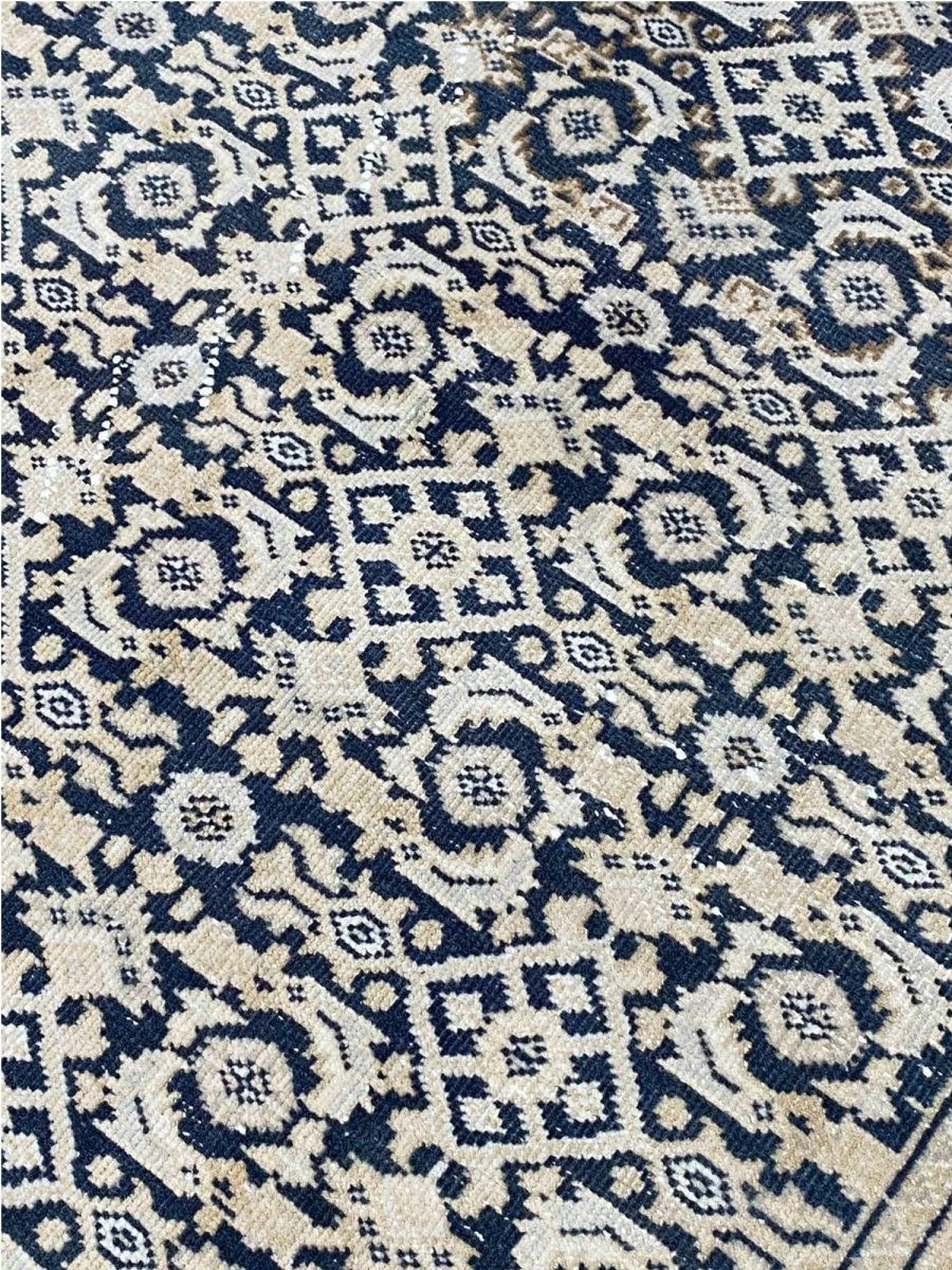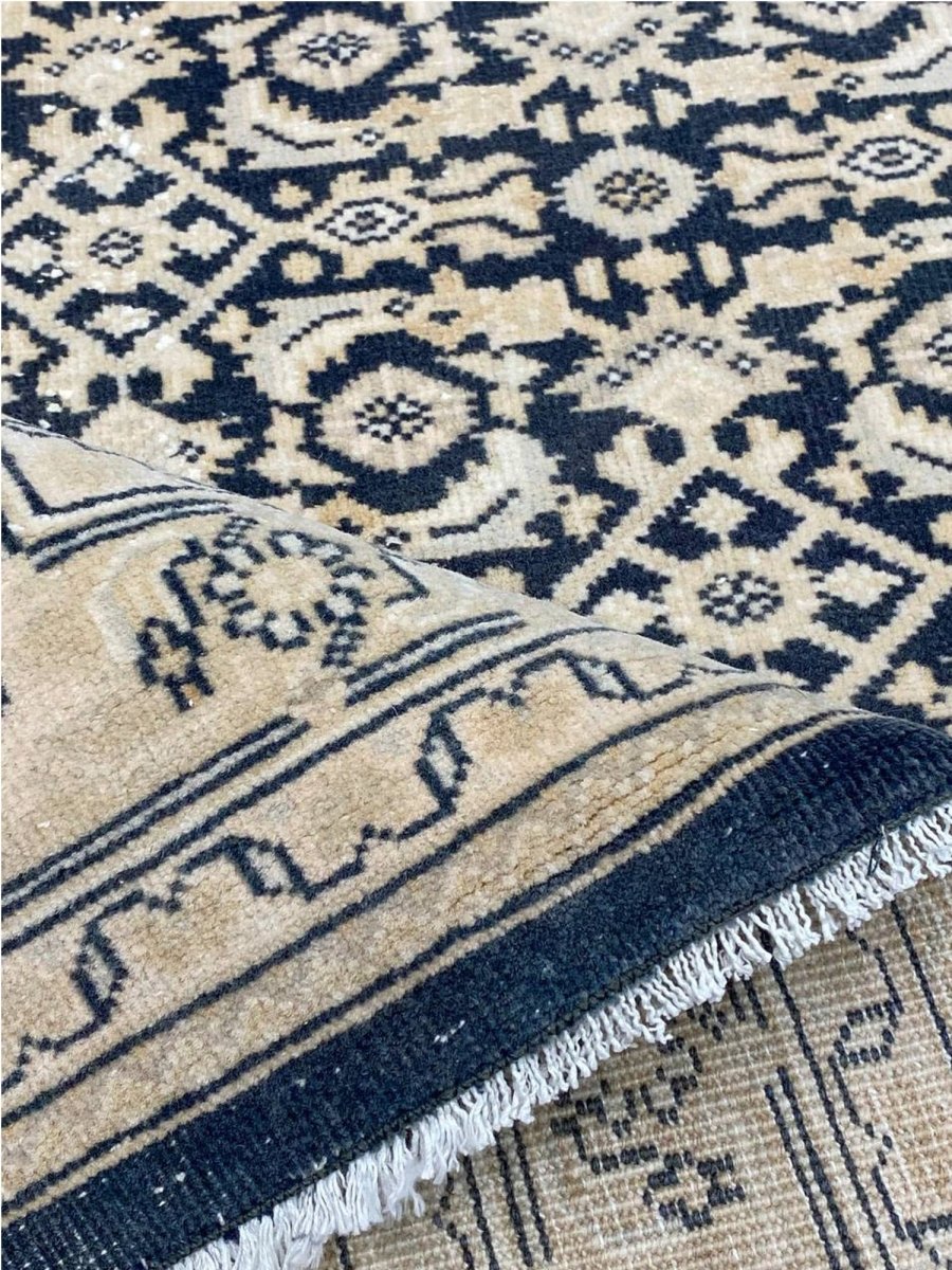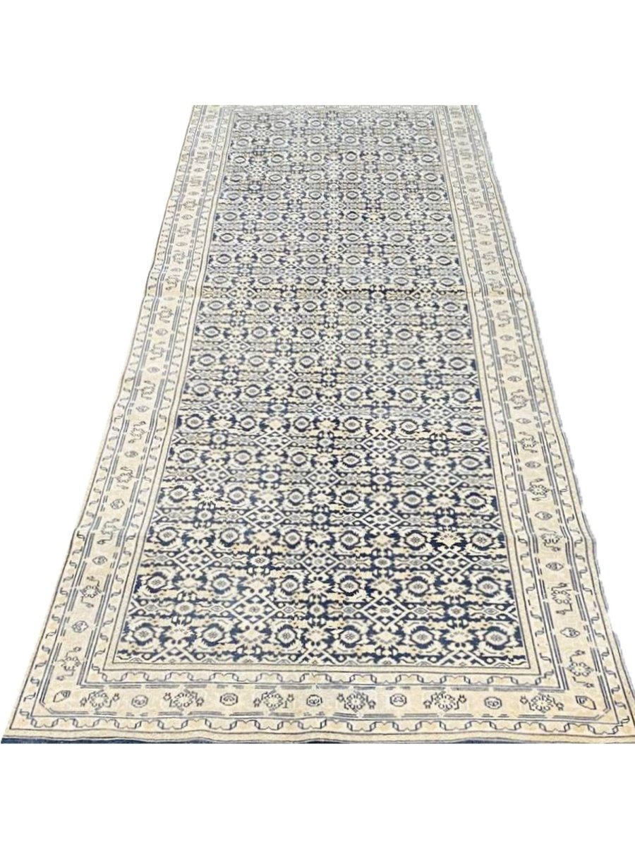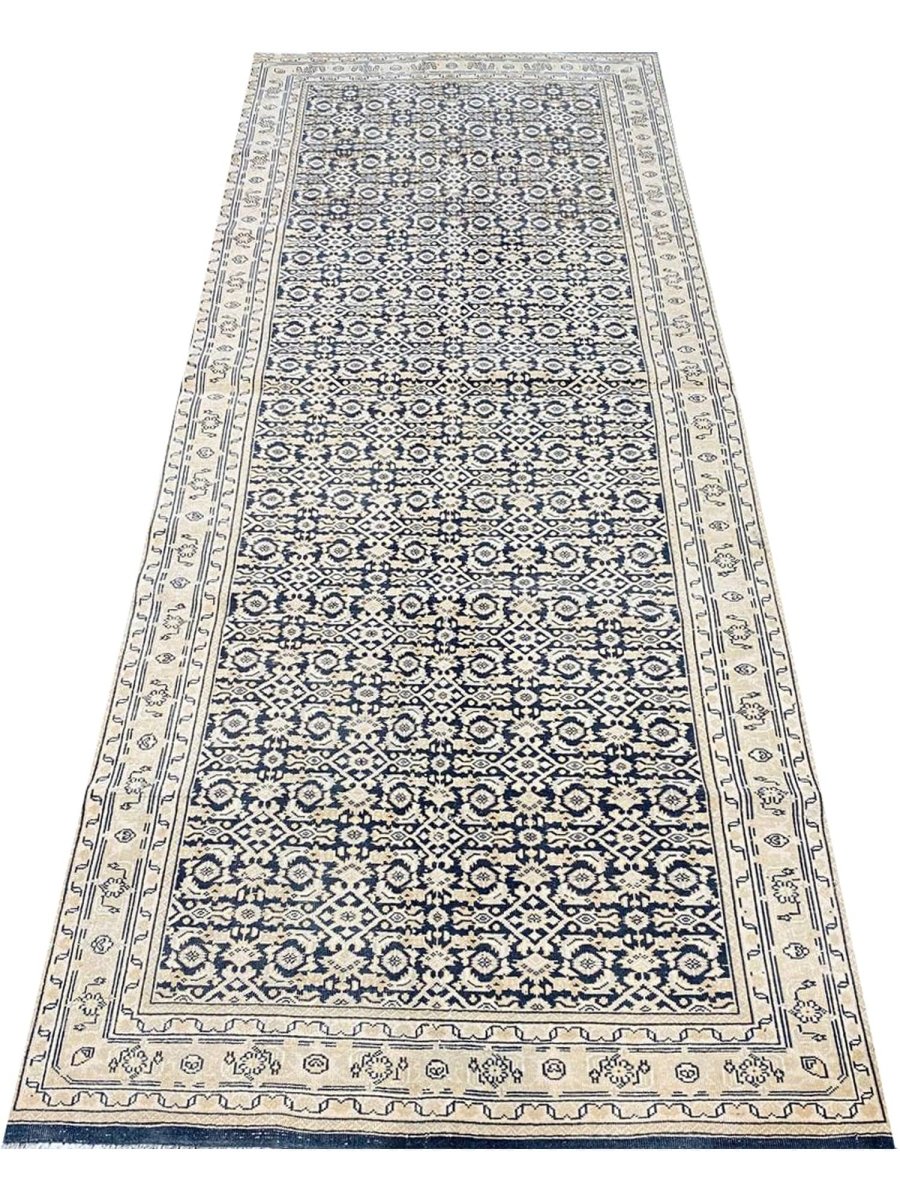 Elevate your space with the classic charm of this 4x10 Persian Style Runner Rug. This runner features a geometric pattern with intricate diamond and lattice designs, reminiscent of traditional Persian artistry. The deep navy blue background is complemented by natural and earthy tones of beige and hints of ivory, creating a balanced and elegant look. A detailed border with repeating motifs frames the rug, enhancing its sophisticated appeal. Handmade in India with premium wool, this rug offers durability and a soft texture. Ideal for hallways, entryways, or alongside furniture, it adds a touch of timeless beauty to any home.