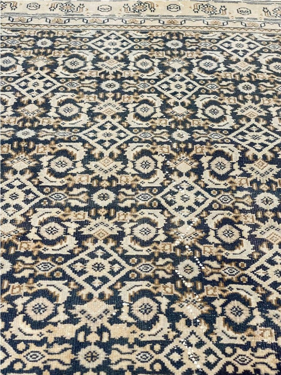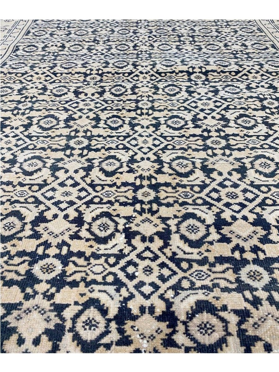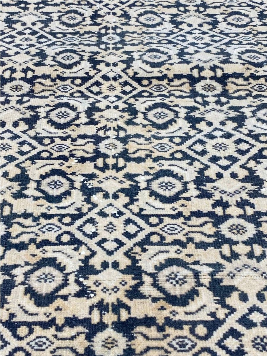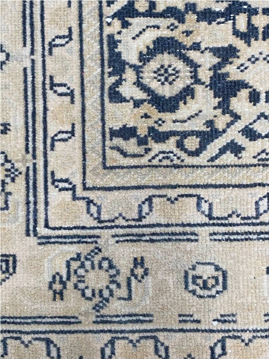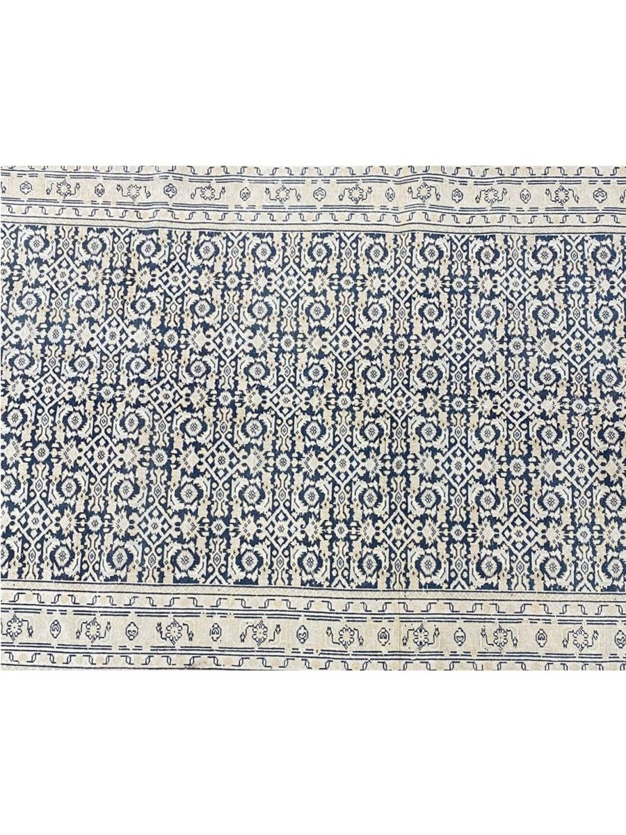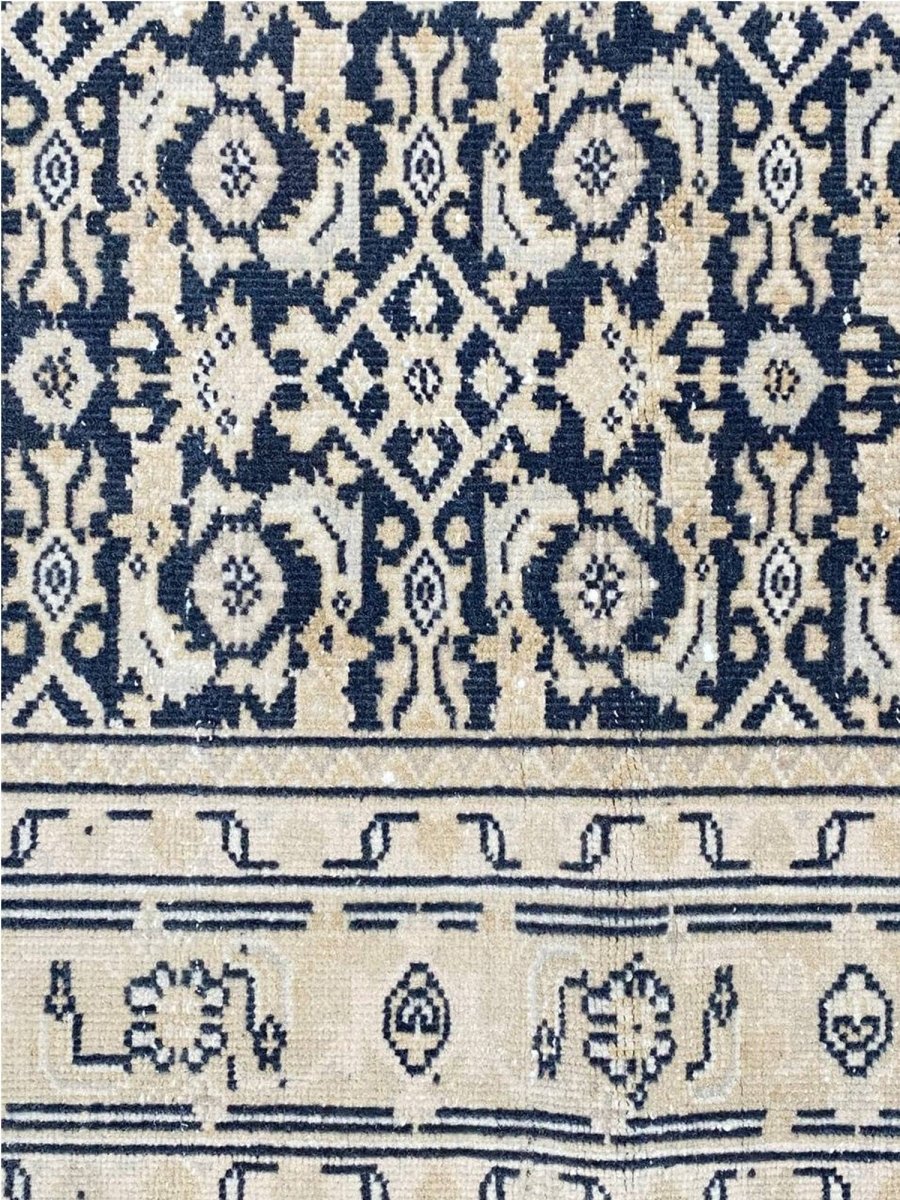 Elevate your space with the classic charm of this 4x10 Persian Style Runner Rug. This runner features a geometric pattern with intricate diamond and lattice designs, reminiscent of traditional Persian artistry. The deep navy blue background is complemented by natural and earthy tones of beige and hints of ivory, creating a balanced and elegant look. A detailed border with repeating motifs frames the rug, enhancing its sophisticated appeal. Handmade in India with premium wool, this rug offers durability and a soft texture. Ideal for hallways, entryways, or alongside furniture, it adds a touch of timeless beauty to any home.