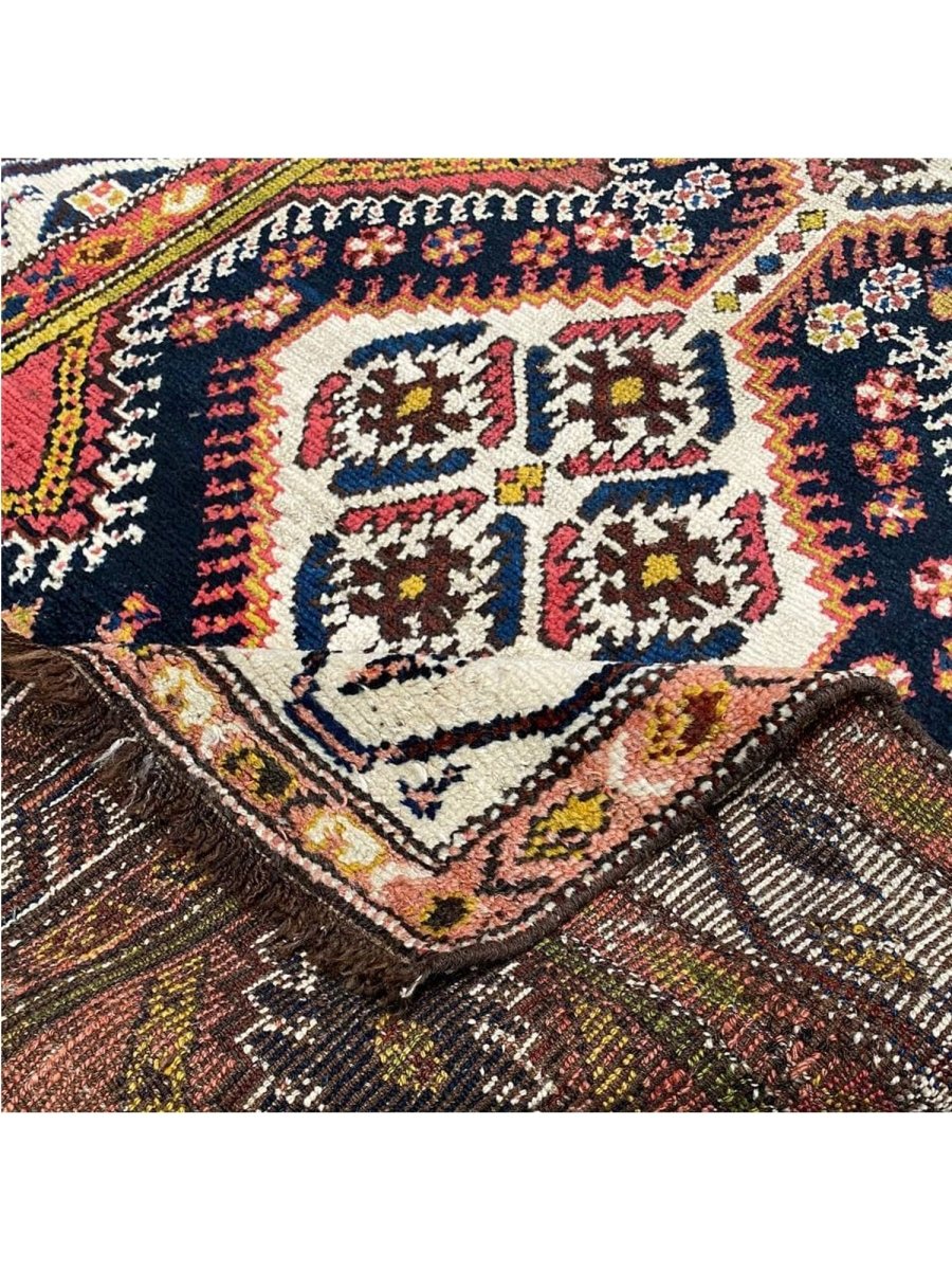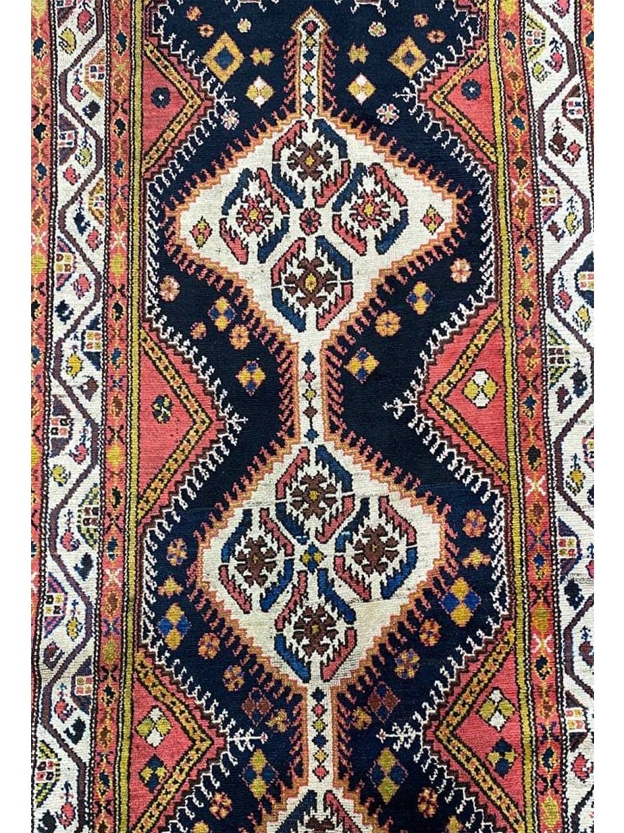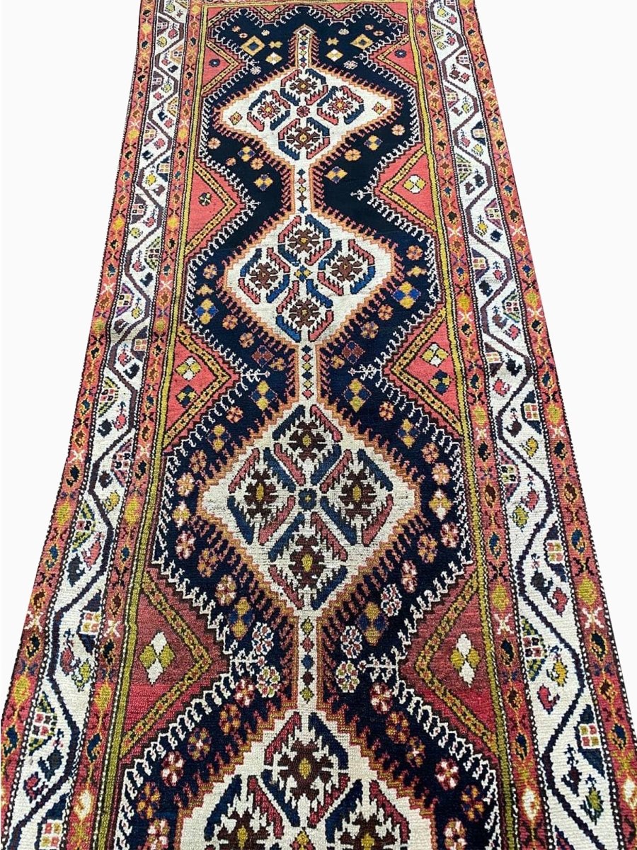Bring traditional beauty to your home with this 4x11 Antique Persian Bakhtiari Runner. This long, handcrafted rug from Persia features a distinctive medallion pattern. The design features diamond shapes that run the length of the rug, with flowers and other motifs incorporated within them. The primary colors are dark blue and brown, with some cream in the middle of the diamonds. You can also see small bits of yellow and green. These colors make the rug look rich and engaging. This runner is perfect for a hallway or an entryway. It will add a traditional and stylish touch to your floor. Free and fast delivery within the US.