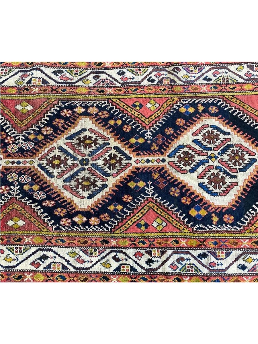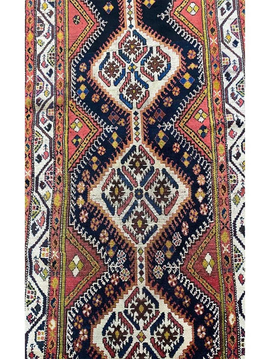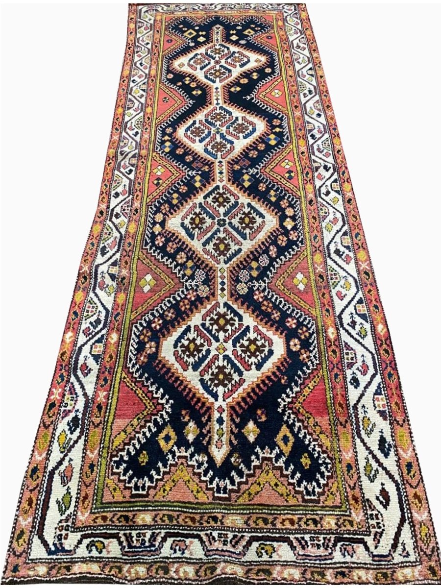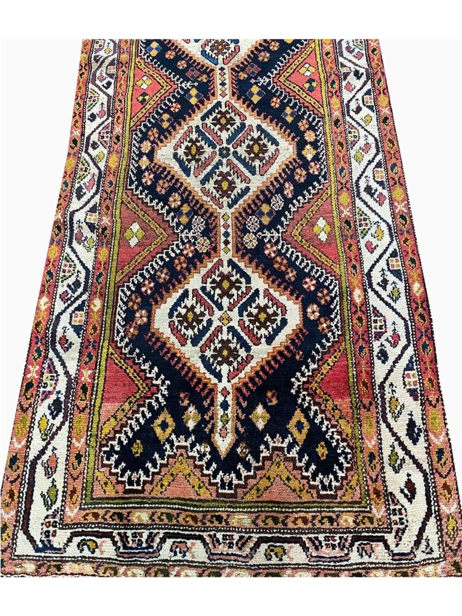 Bring traditional beauty to your home with this 4x11 Antique Persian Bakhtiari Runner. This long, handcrafted rug from Persia features a distinctive medallion pattern. The design features diamond shapes that run the length of the rug, with flowers and other motifs incorporated within them. The primary colors are dark blue and brown, with some cream in the middle of the diamonds. You can also see small bits of yellow and green. These colors make the rug look rich and engaging. This runner is perfect for a hallway or an entryway. It will add a traditional and stylish touch to your floor. Free and fast delivery within the US.