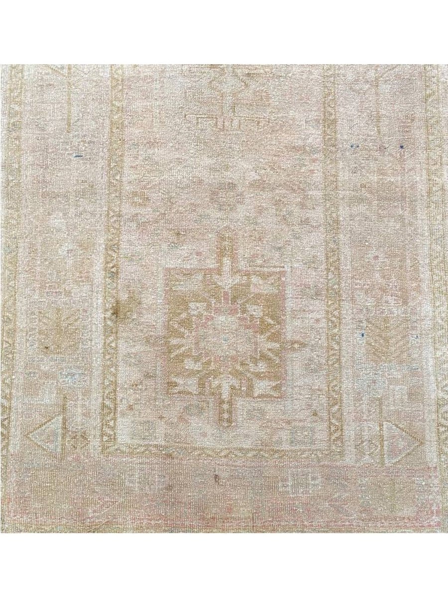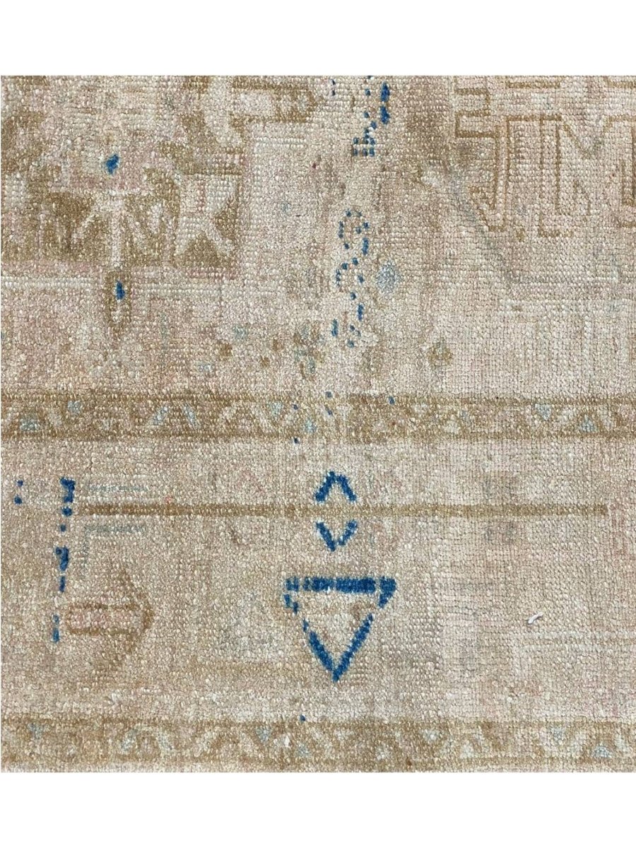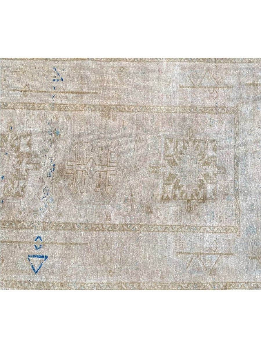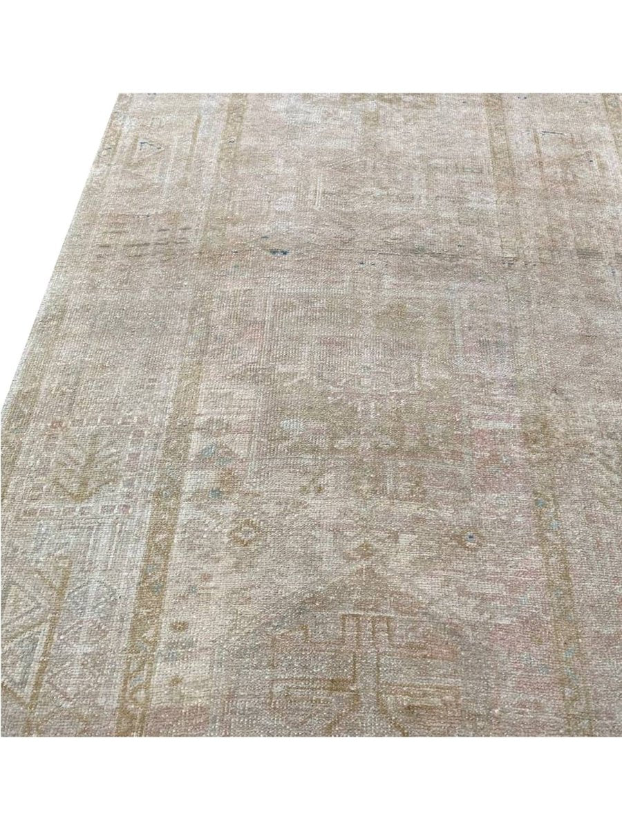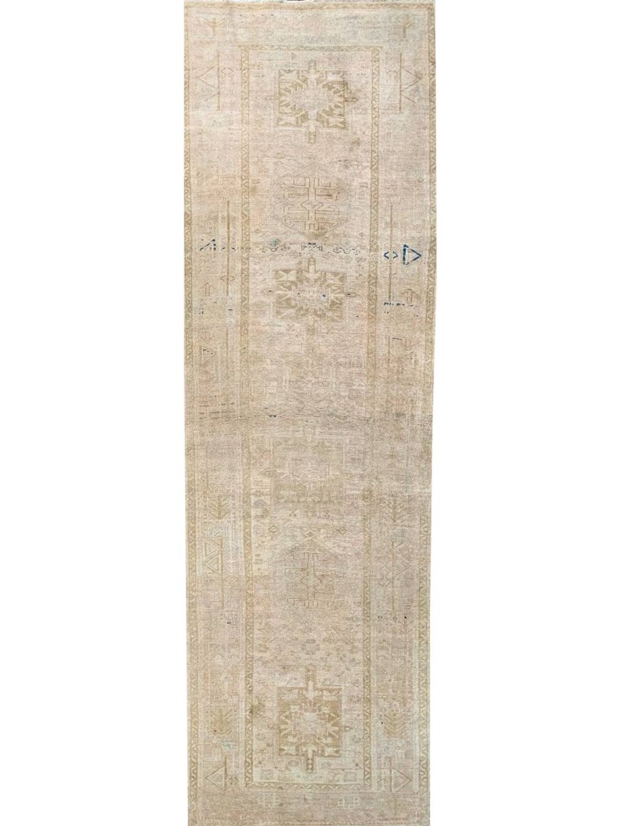 Enhance your space with the classic beauty of this 4x11 Antique Persian Heriz Runner. This runner features a geometric pattern with intricate floral and diamond motifs, reflecting the rich heritage of Persian craftsmanship. The soft beige background is complemented by natural tones of brown, gray, and hints of blue, creating a warm and elegant look. A detailed border adds to its traditional charm. This rug is handmade in Persia with premium wool and offers durability and a luxurious texture. Perfect for hallways, entryways, or alongside furniture, it brings a touch of authentic Persian heritage to your home.
