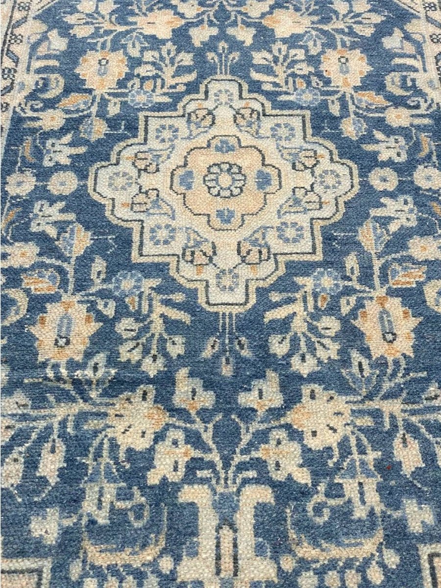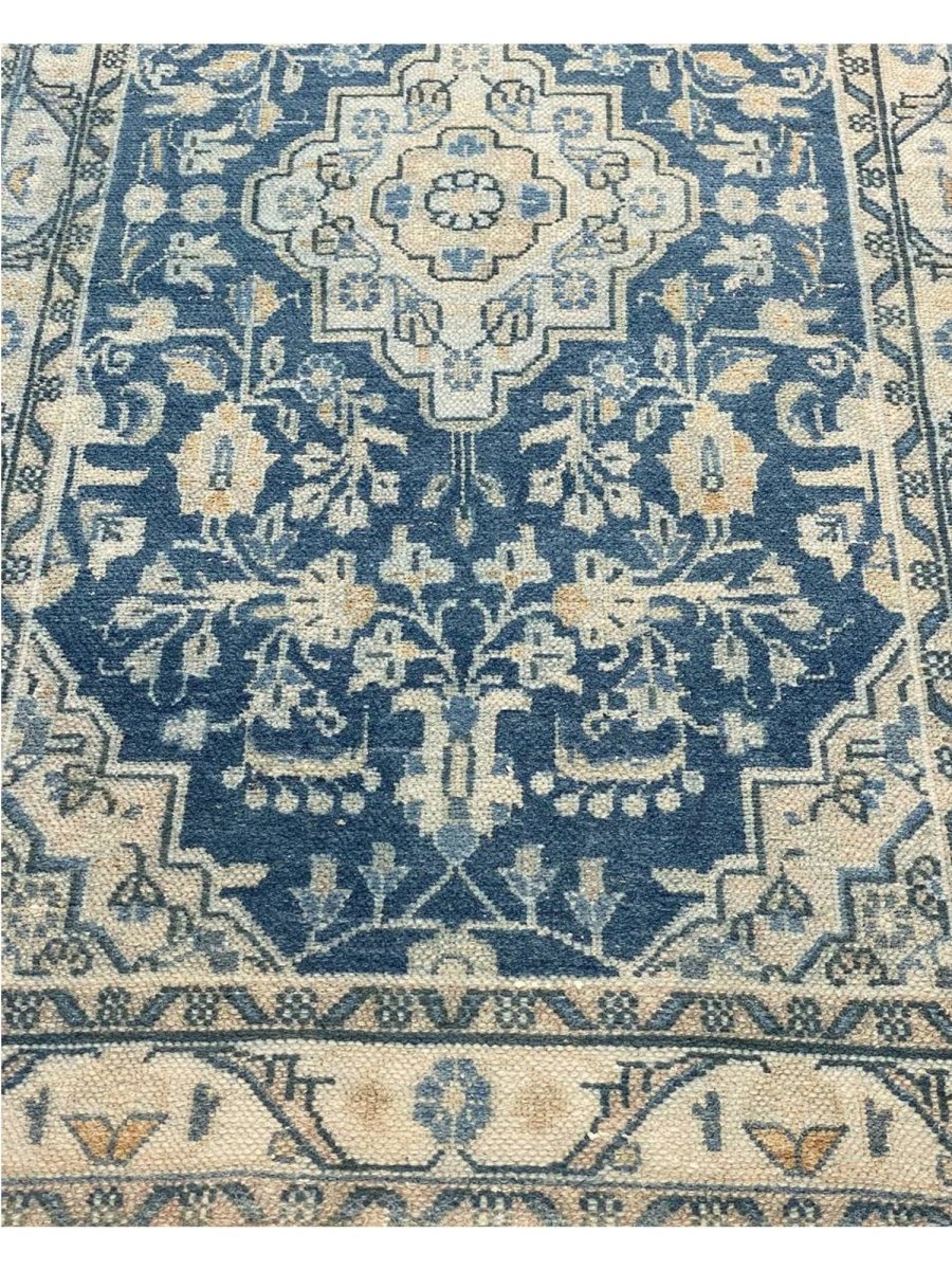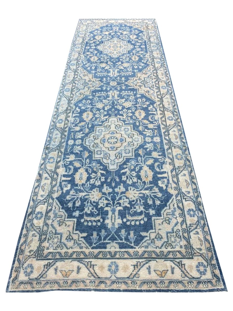 This exquisite 4x11 Old Persian Hamedan Runner Rug enhances your hallway. Showcasing a classic medallion pattern filled with intricate floral and geometric designs, this rug reflects the esteemed weaving heritage of Persia. The rich, deep blue background is beautifully contrasted with lighter shades of blue and accents of ivory and beige in the patterns and borders, creating a sophisticated and timeless appeal. Handwoven in Persia from premium wool, this runner offers durability and a soft texture underfoot. Its elongated size adds warmth and style to hallways, entryways, or narrow spaces, bringing authentic Persian artistry to your home.