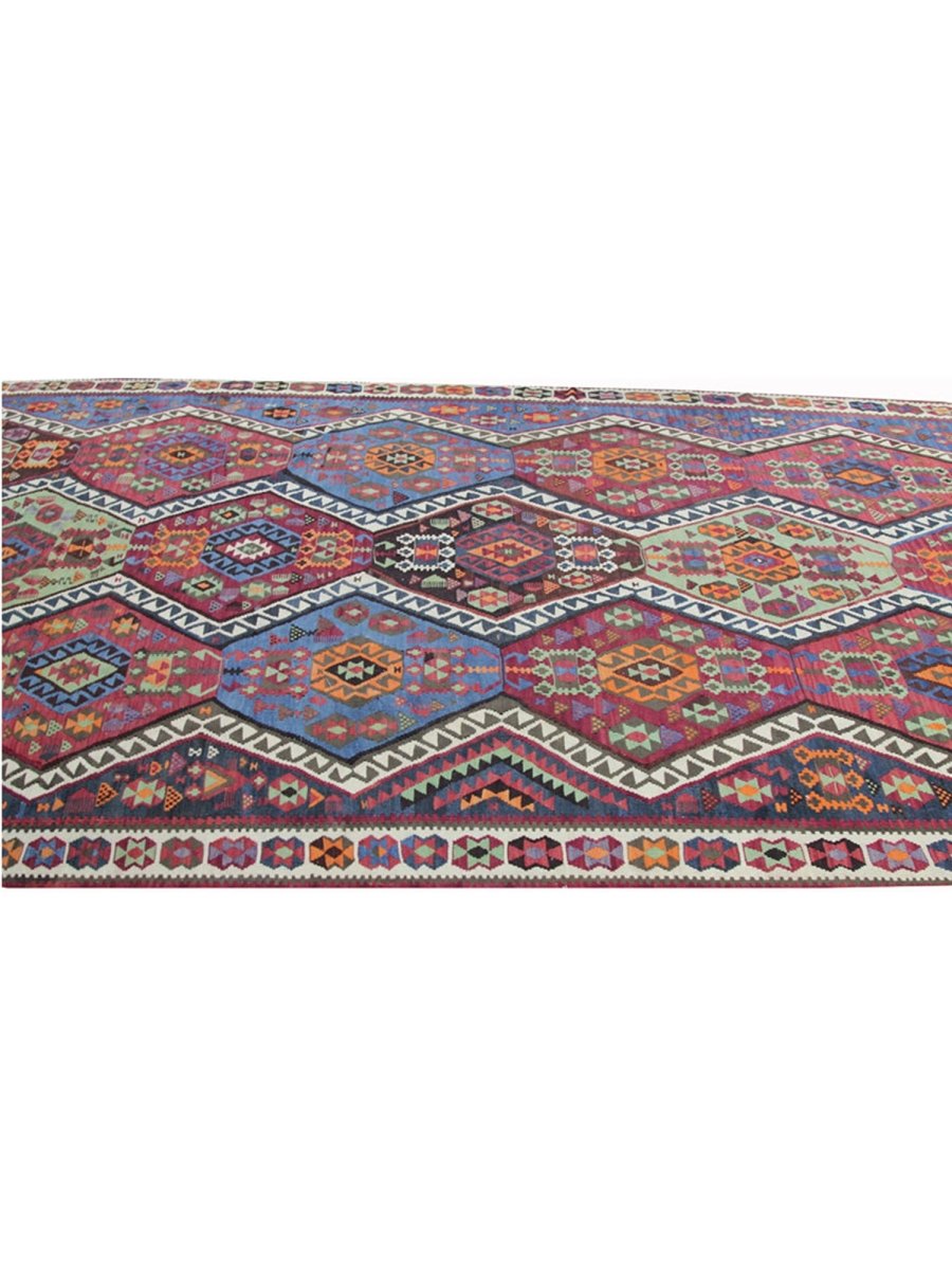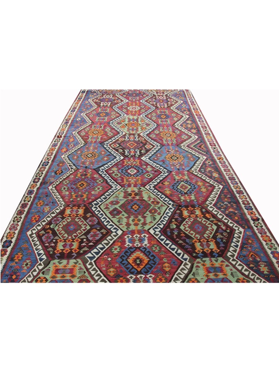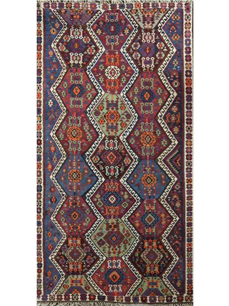 Enhance your hallway with this stunning 6x14 Persian Kilim runner, meticulously hand-knotted from premium wool. Featuring an intricate geometric pattern, this rug blends white, rust, blue, and green hues to create a timeless statement adding warmth and texture to your space. Its durable craftsmanship ensures long-lasting beauty, making it a functional and stylish addition to your home. Free shipping within the US.