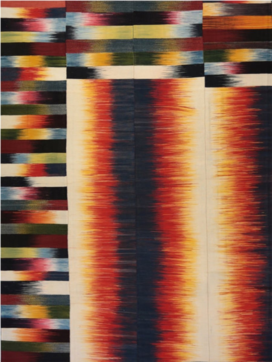 This captivating wool rug features dramatic gradient patterns and bold stripes, resulting in a striking visual statement. The 10x13 rectangular format presents an artistic interplay of vertical gradient bands alongside striped segments, creating a dynamic composition that brings refined sophistication to any indoor space.