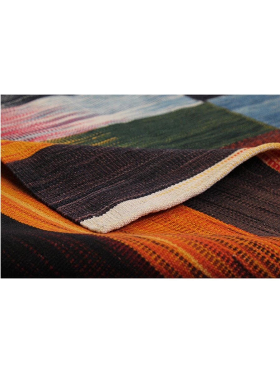 The design features a bold contrast between flowing gradient sections and structured striped elements, with warm orange and red tones into deep blacks and cool blues. One side of the rug showcases a rhythmic pattern of shorter bands. At the same time, the other displays dramatic vertical gradient stripes, creating an intriguing asymmetrical balance that adds visual interest and depth.