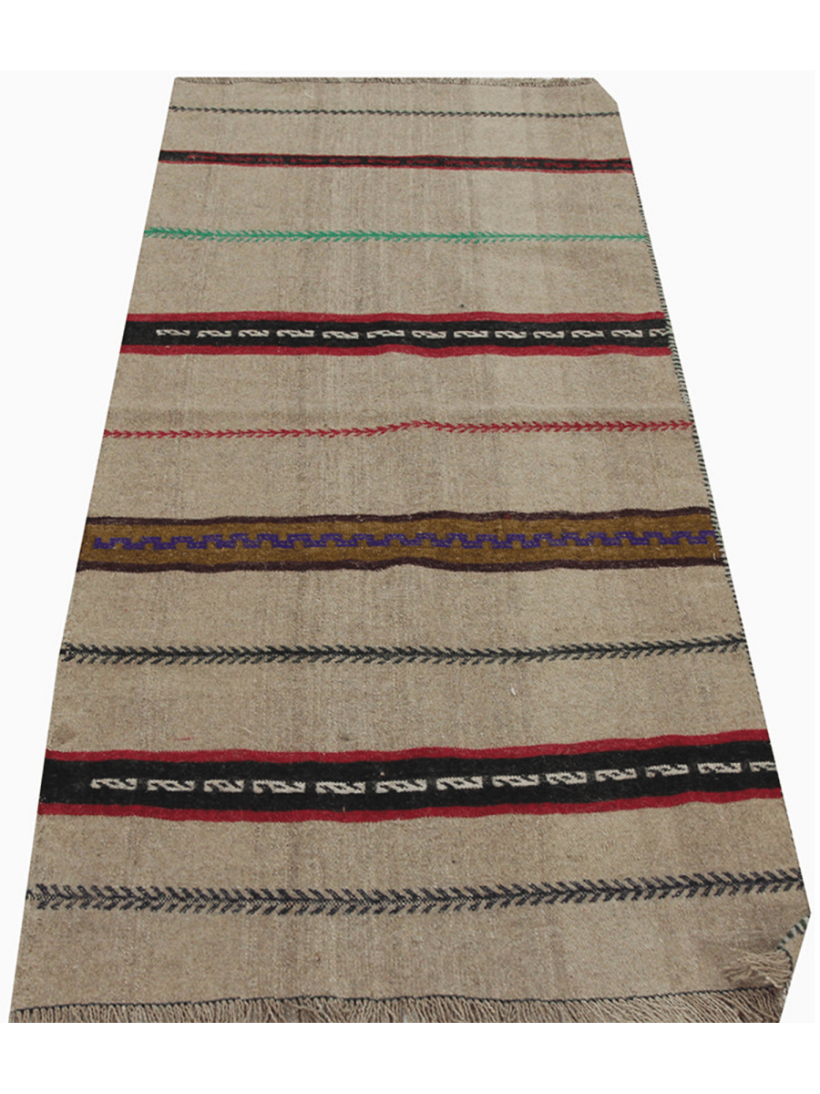 This 2x6 Persian Kilim runner rug showcases a timeless striped design on a neutral beige background, enhanced by thin horizontal lines in red, green, and dark brown. Some stripes feature intricate woven details, adding texture and depth to the rug’s handcrafted aesthetic. Made from premium wool, this flat-weave Kilim offers both durability and lightweight flexibility. Its understated charm makes it a versatile choice for various interiors. The rug’s artisanal craftsmanship reflects the rich heritage of Persian weaving, ensuring a unique and elegant addition to any home.