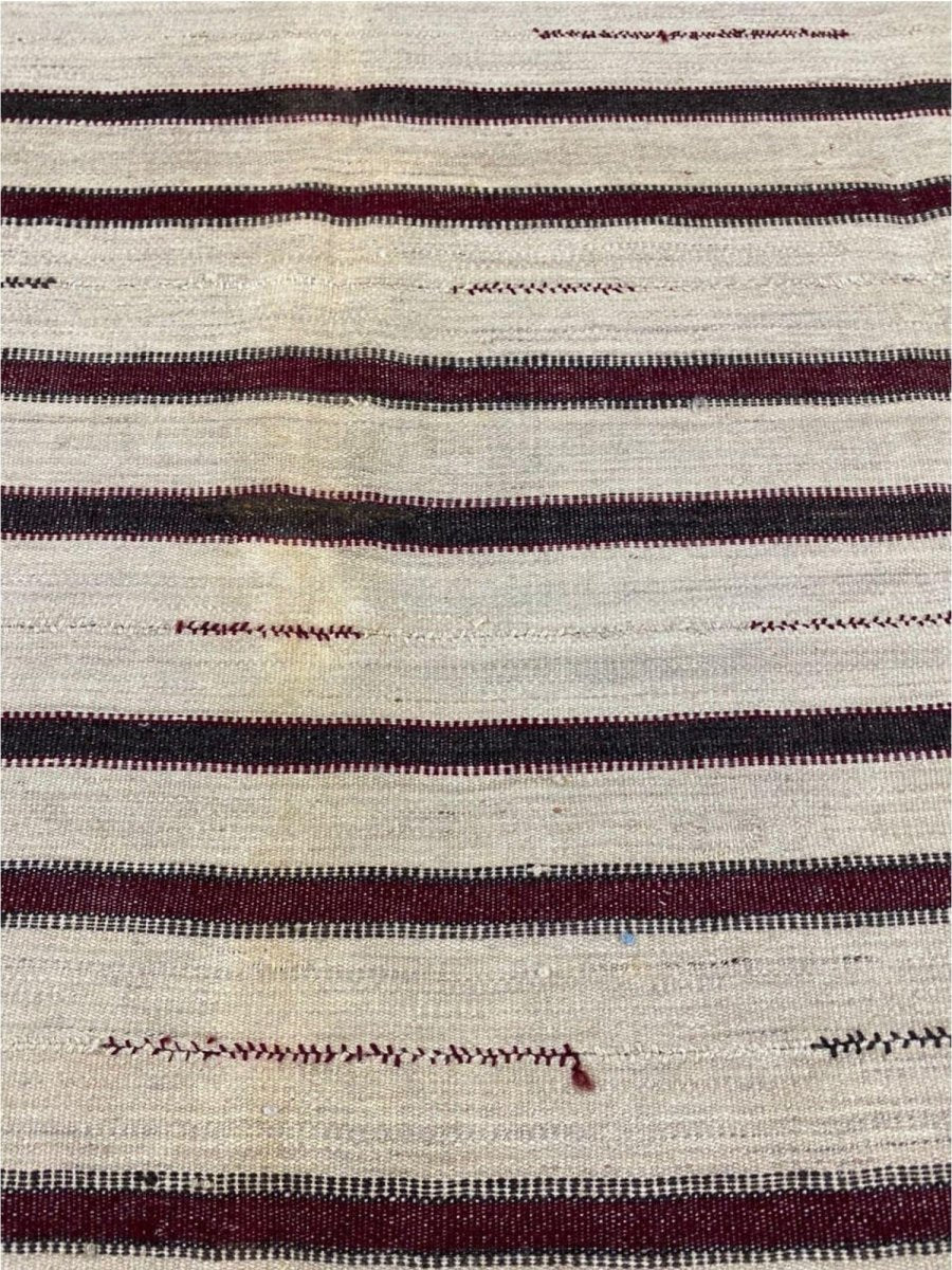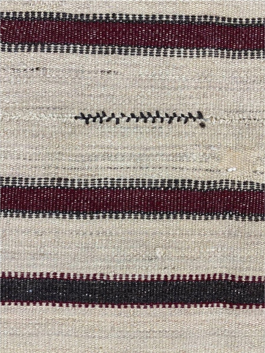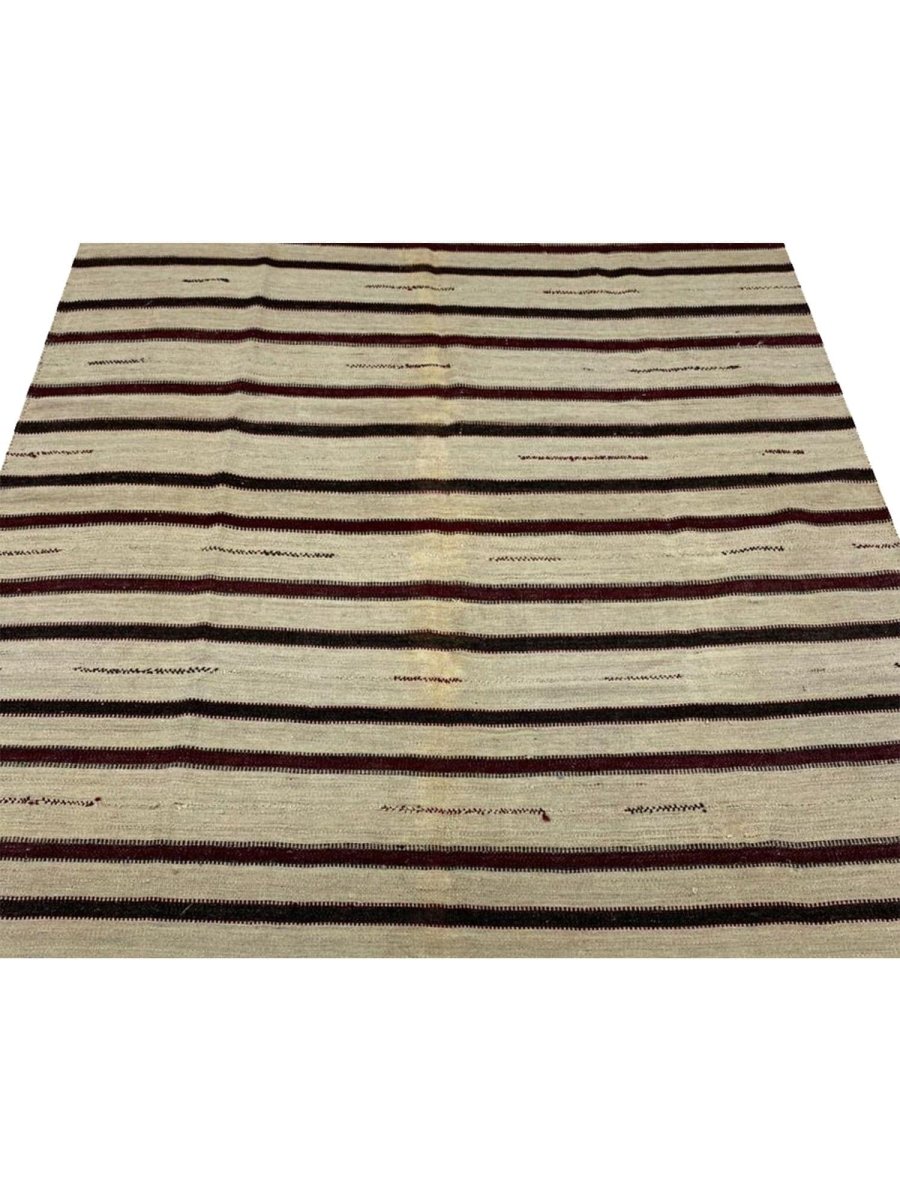 The 6x6 Old Persian Kilim Rug is a sophisticated yet understated piece that adds elegance to your home. Handwoven in Persia from durable wool, this rug features a minimalist striped design with a neutral beige base accented by slim black and deep red stripes. The delicate stitched motifs woven within the stripes provide a subtle decorative touch, enhancing its timeless appeal. The warm beige tones create a soft, earthy feel, while the darker stripes offer bold contrast. This versatile rug complements classical and chic interiors, making it suitable for living rooms, bedrooms, or offices. The wool construction ensures durability and comfort underfoot, while the flat-weave texture allows for easy maintenance and long-lasting quality.