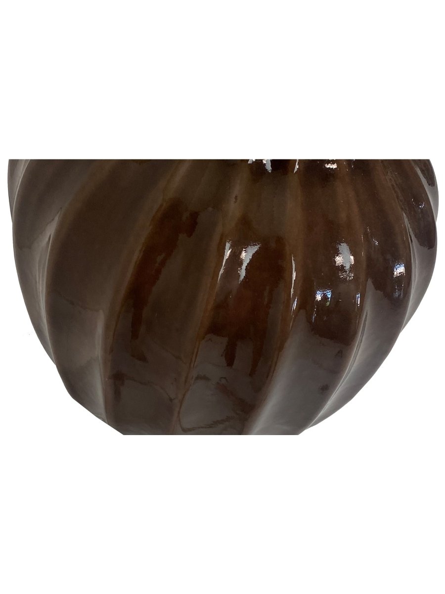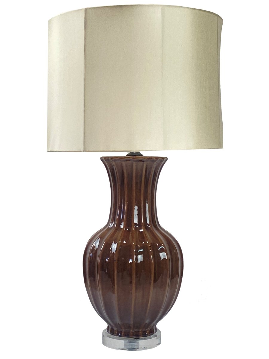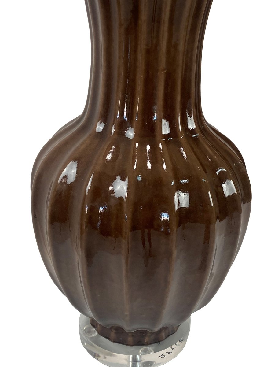 Introduce a warm, refined accent to your interior with this brown ceramic table lamp set on a clear acrylic base and finished with a classic linen shade. The sculptural ceramic body features a softly ribbed silhouette and a rich brown glazed finish with subtle tonal depth, lending the piece an understated elegance. The transparent acrylic base adds a modern touch while visually lightening the form, and the neutral linen shade provides a soft, ambient glow, making this lamp a versatile addition to both traditional and contemporary settings.