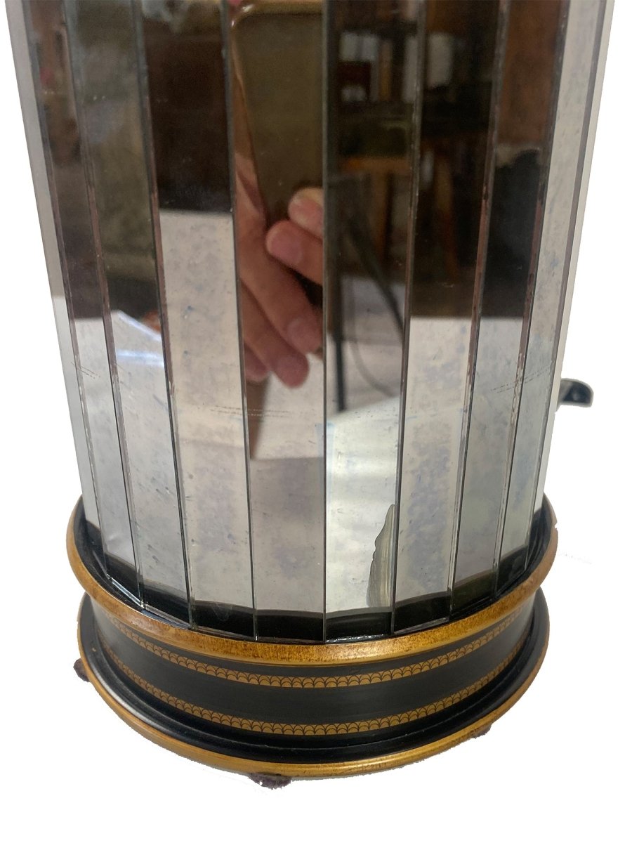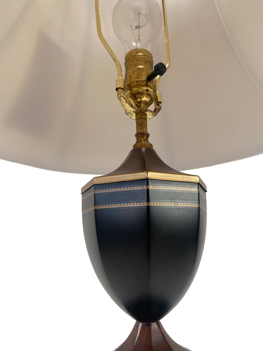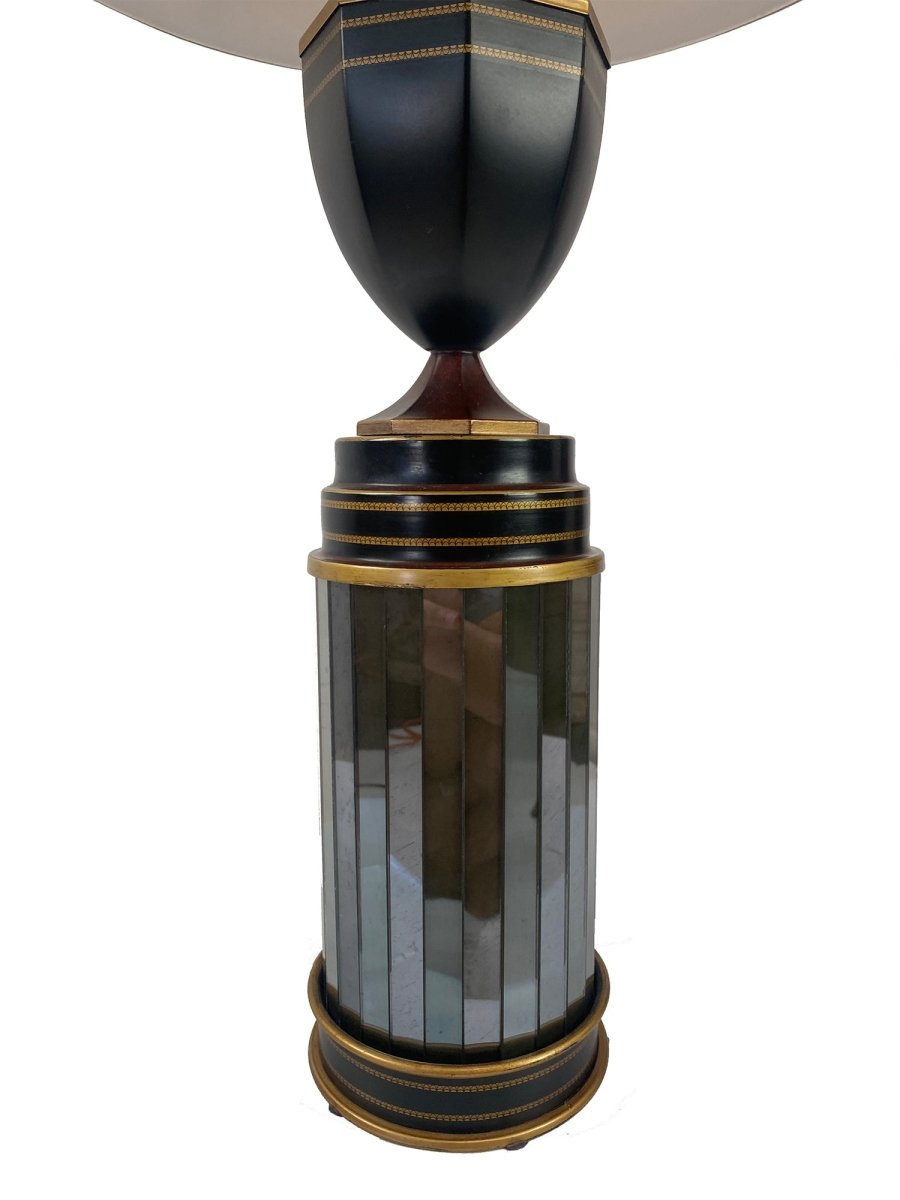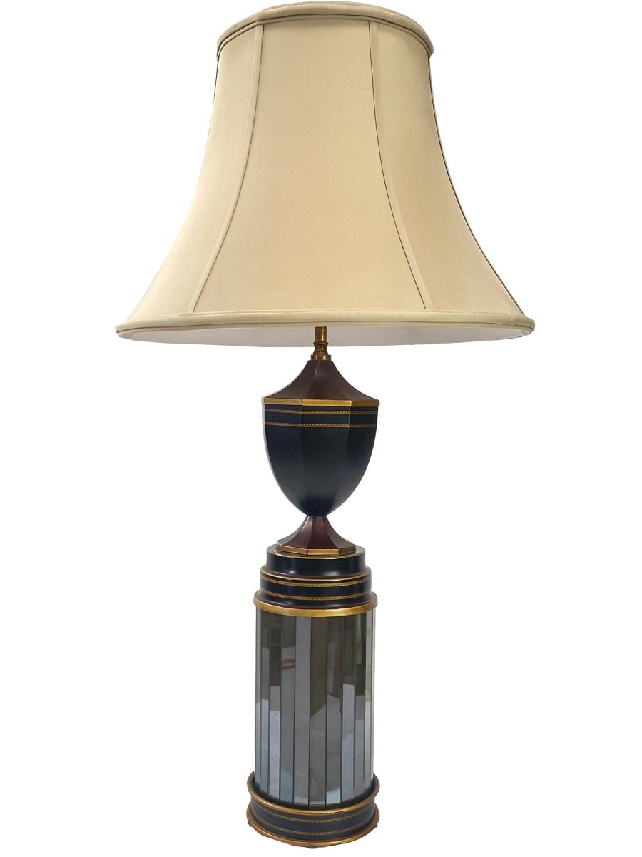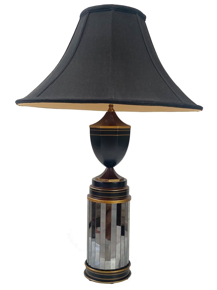 Elevate your interior with the sophisticated elegance of this Italian hand-painted tole lamp, a graceful fusion of neoclassical form and reflective glamour. The sleek black urn-shaped upper body is accented with fine hand-painted gold banding and delicate dot detailing, sitting atop a cylindrical mirrored pedestal. Vertical mirror panels encased within dark tole rings accented with gold beading create a luminous, multi-dimensional effect that beautifully catches and reflects light.