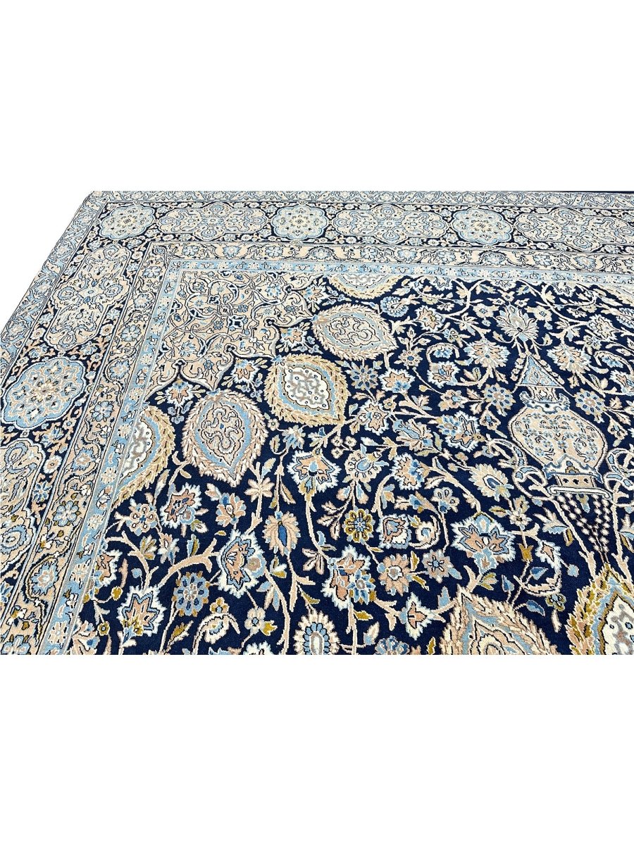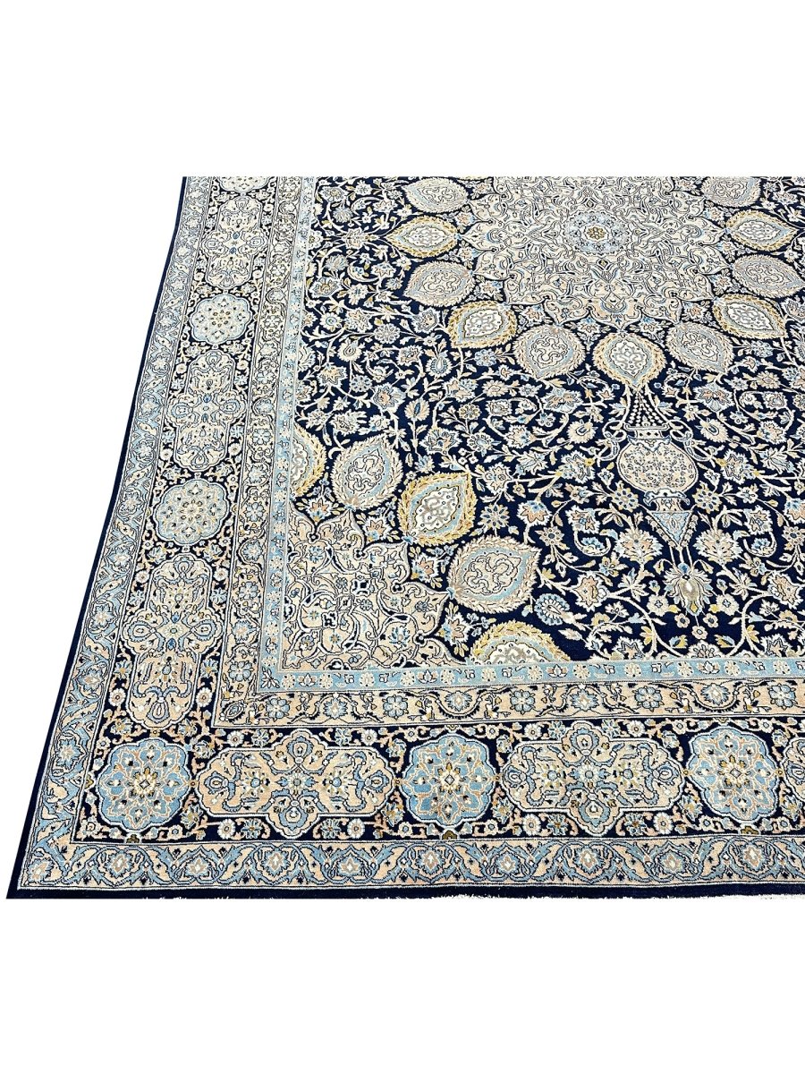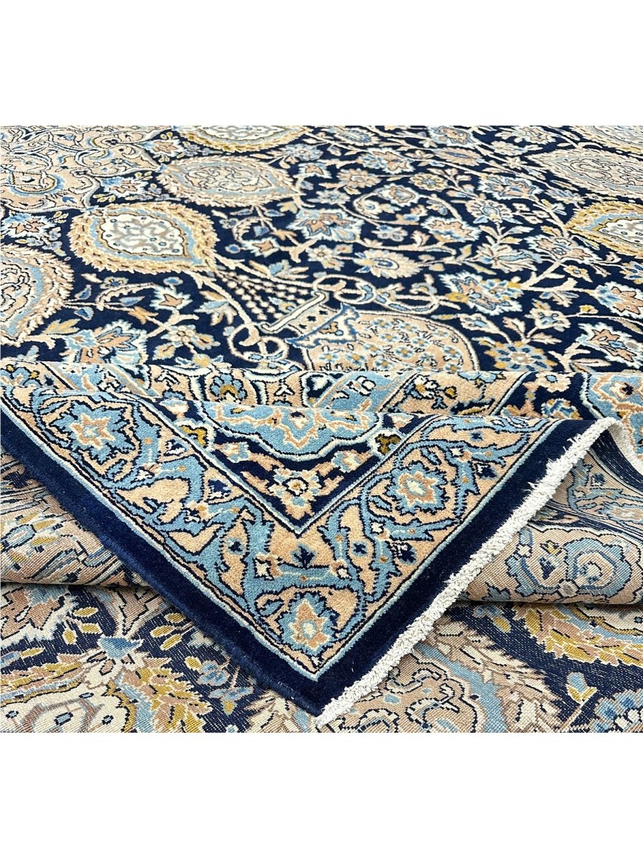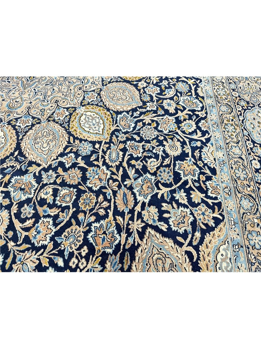 Hand-knotted in Persia, this 10x16 Kerman area rug adds a touch of loveliness and charm to a room. With an intricate floral pattern, there is a subtle blend of navy, beige, and ivory hues, making this rug beautiful. The dramatic center medallion and the balance refinement offered by the border are the icing on the cake. Crafted with superior wool, this rug is a pleasure to walk on and will last a lifetime.
