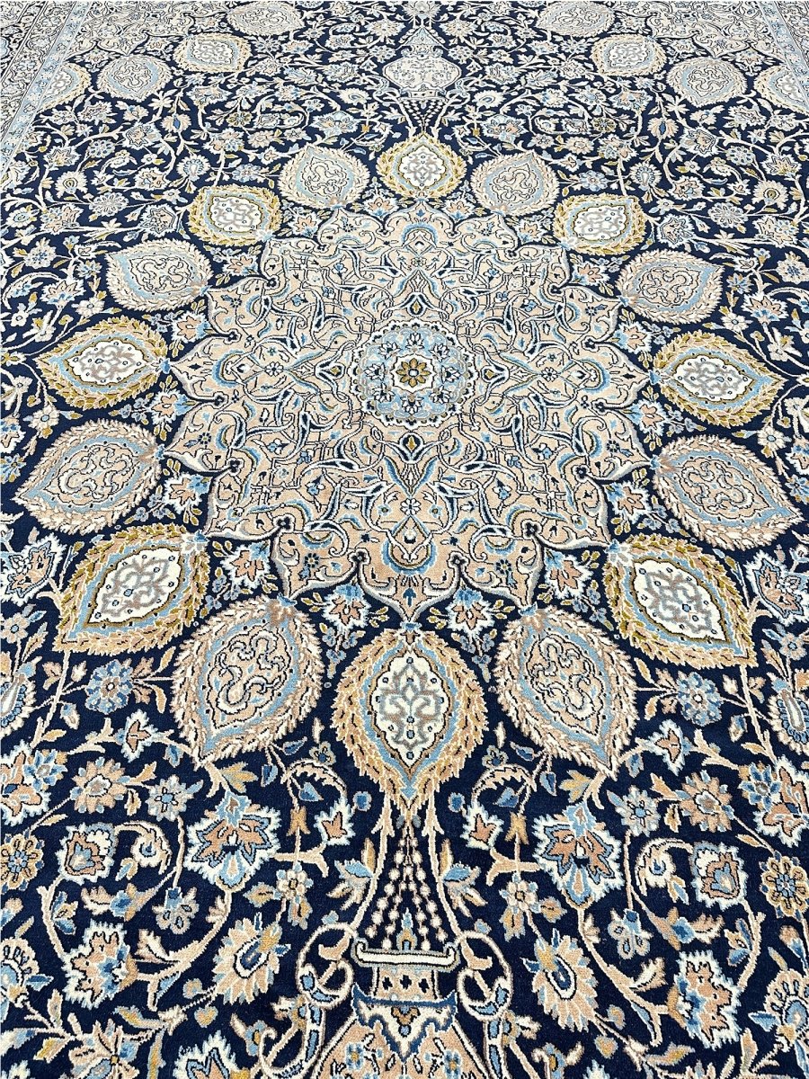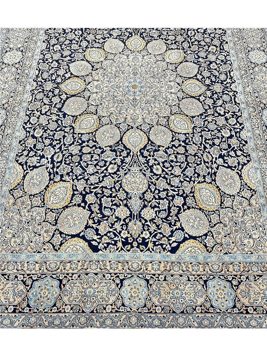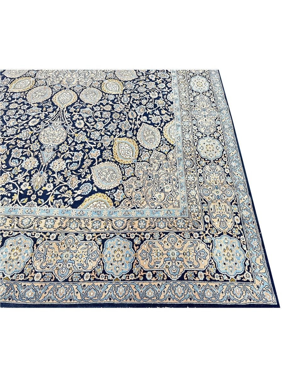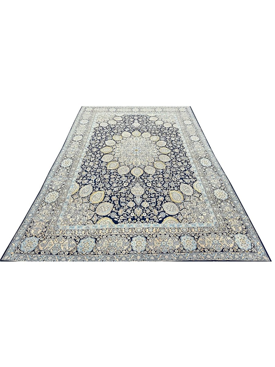 Hand-knotted in Persia, this 10x16 Kerman area rug adds a touch of loveliness and charm to a room. With an intricate floral pattern, there is a subtle blend of navy, beige, and ivory hues, making this rug beautiful. The dramatic center medallion and the balance refinement offered by the border are the icing on the cake. Crafted with superior wool, this rug is a pleasure to walk on and will last a lifetime.