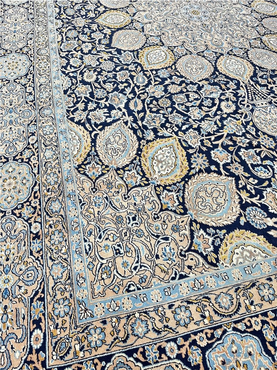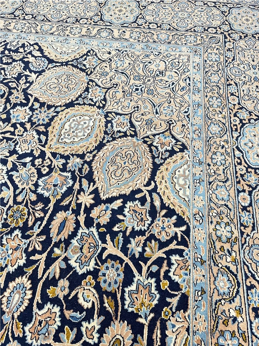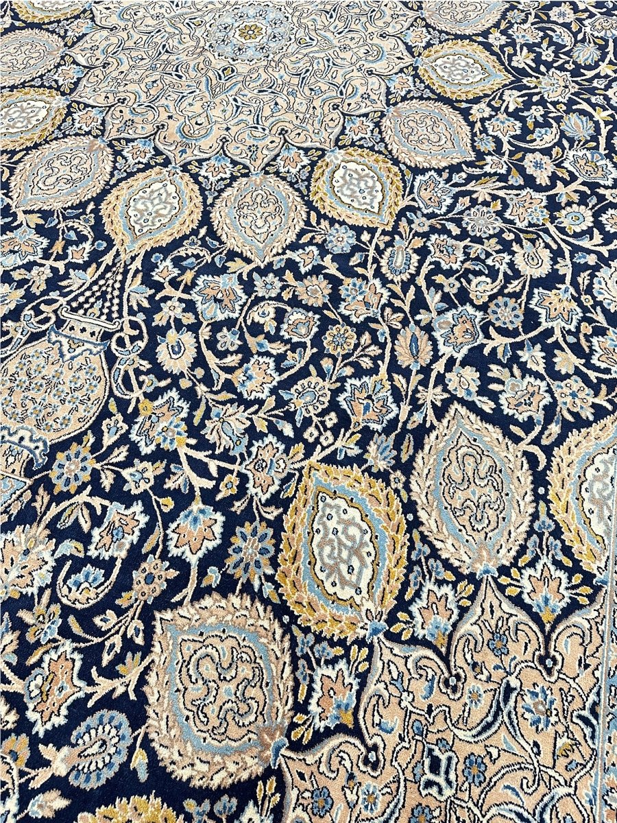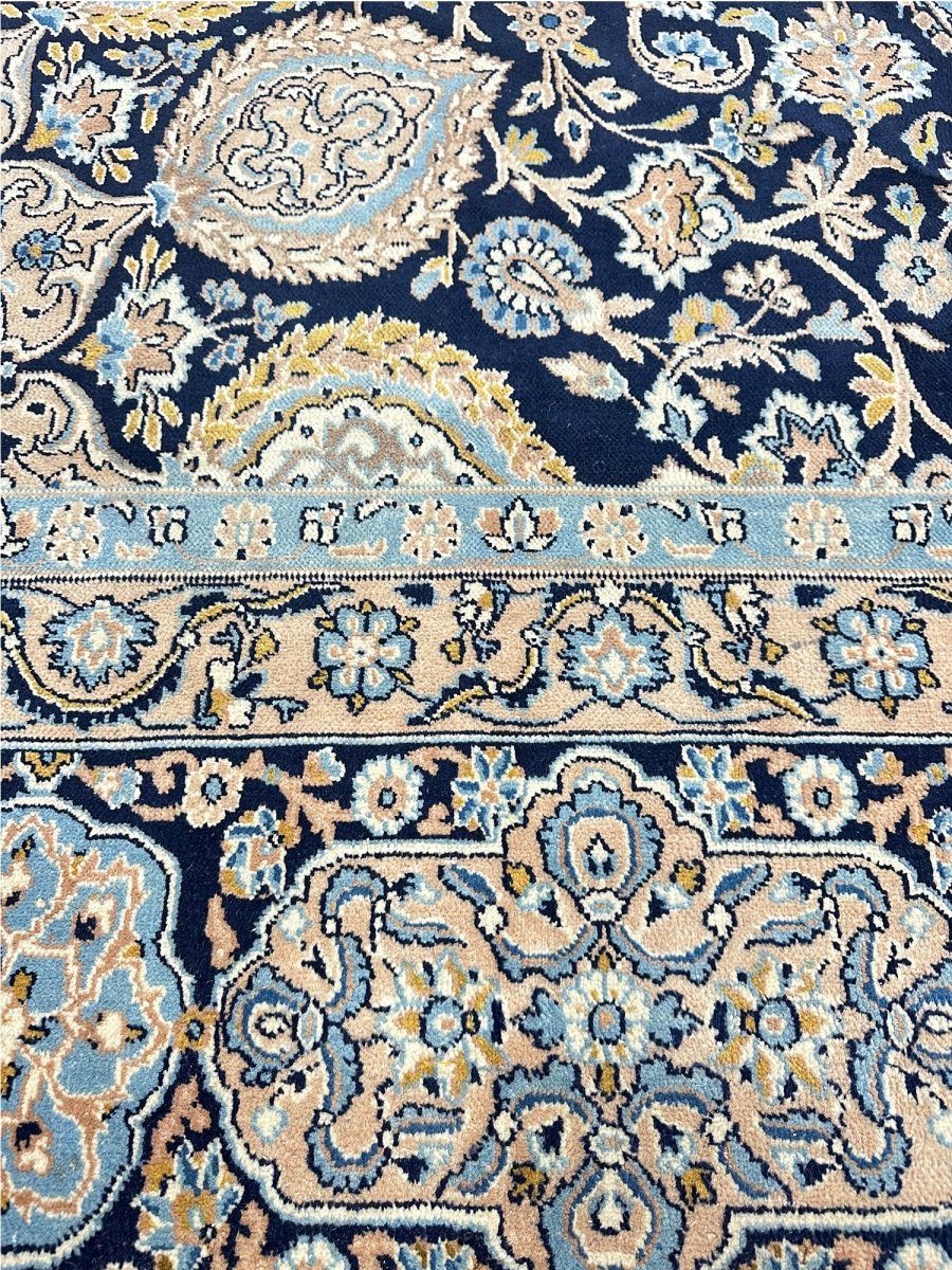 Hand-knotted in Persia, this 10x16 Kerman area rug adds a touch of loveliness and charm to a room. With an intricate floral pattern, there is a subtle blend of navy, beige, and ivory hues, making this rug beautiful. The dramatic center medallion and the balance refinement offered by the border are the icing on the cake. Crafted with superior wool, this rug is a pleasure to walk on and will last a lifetime.