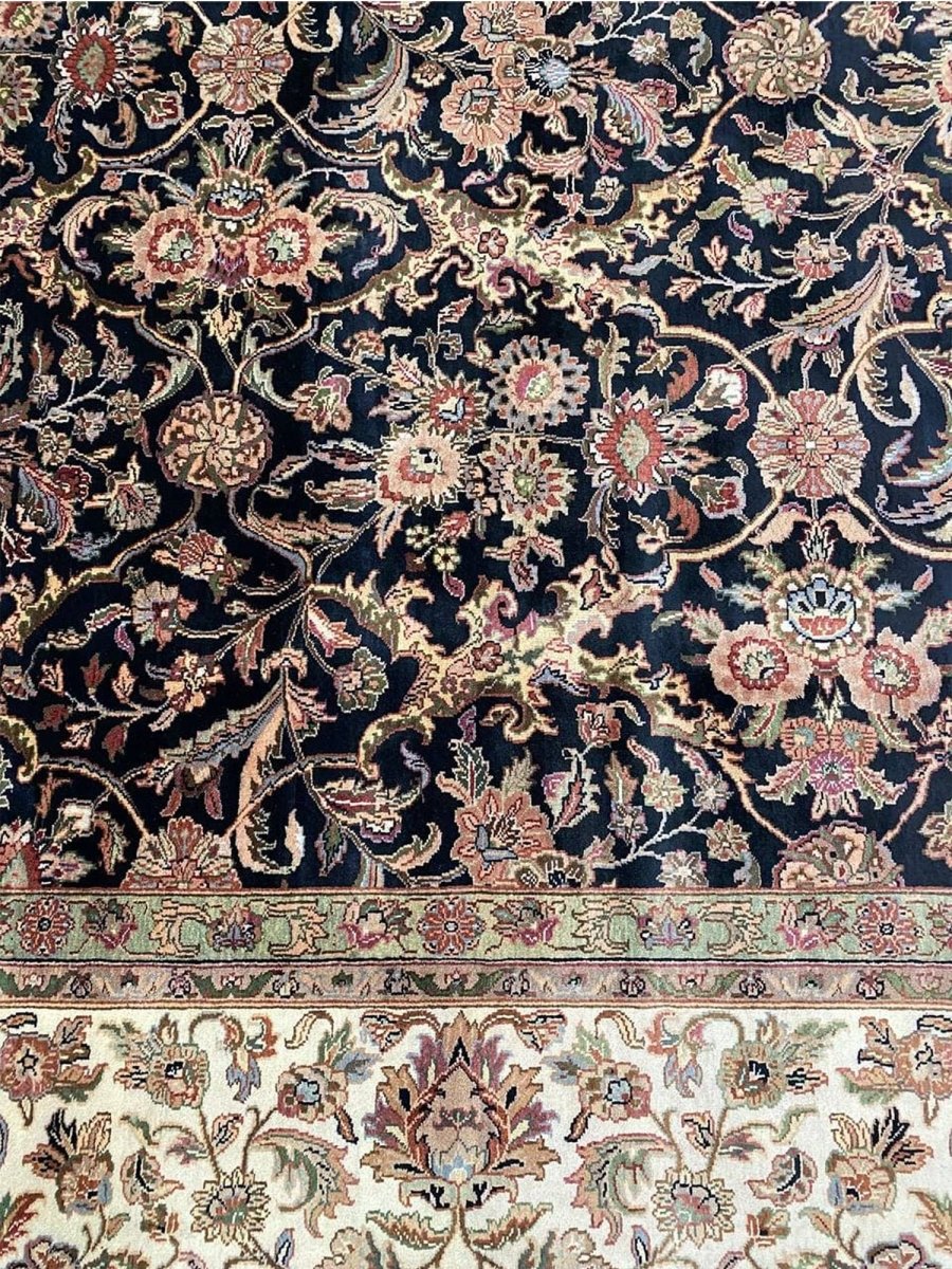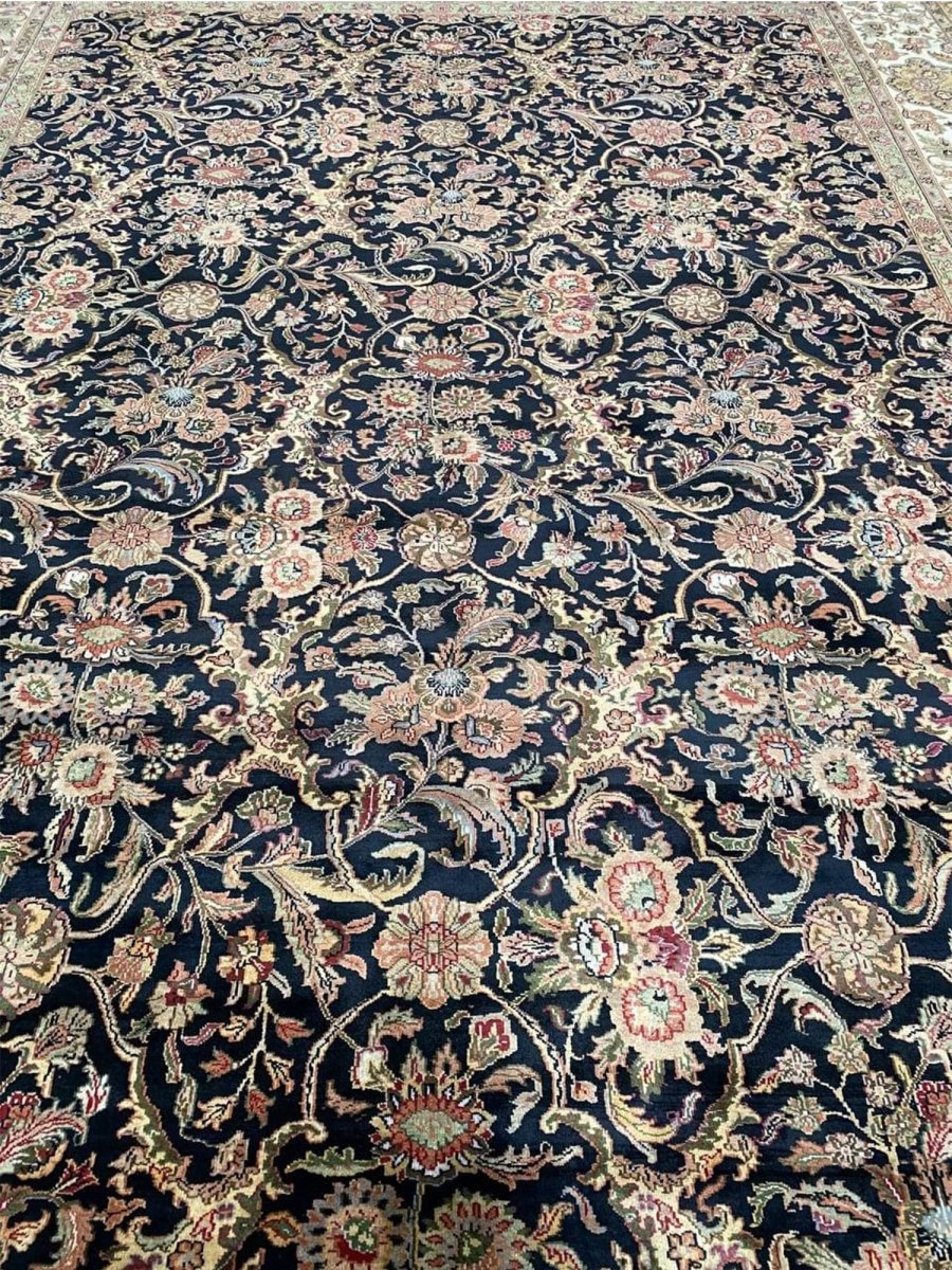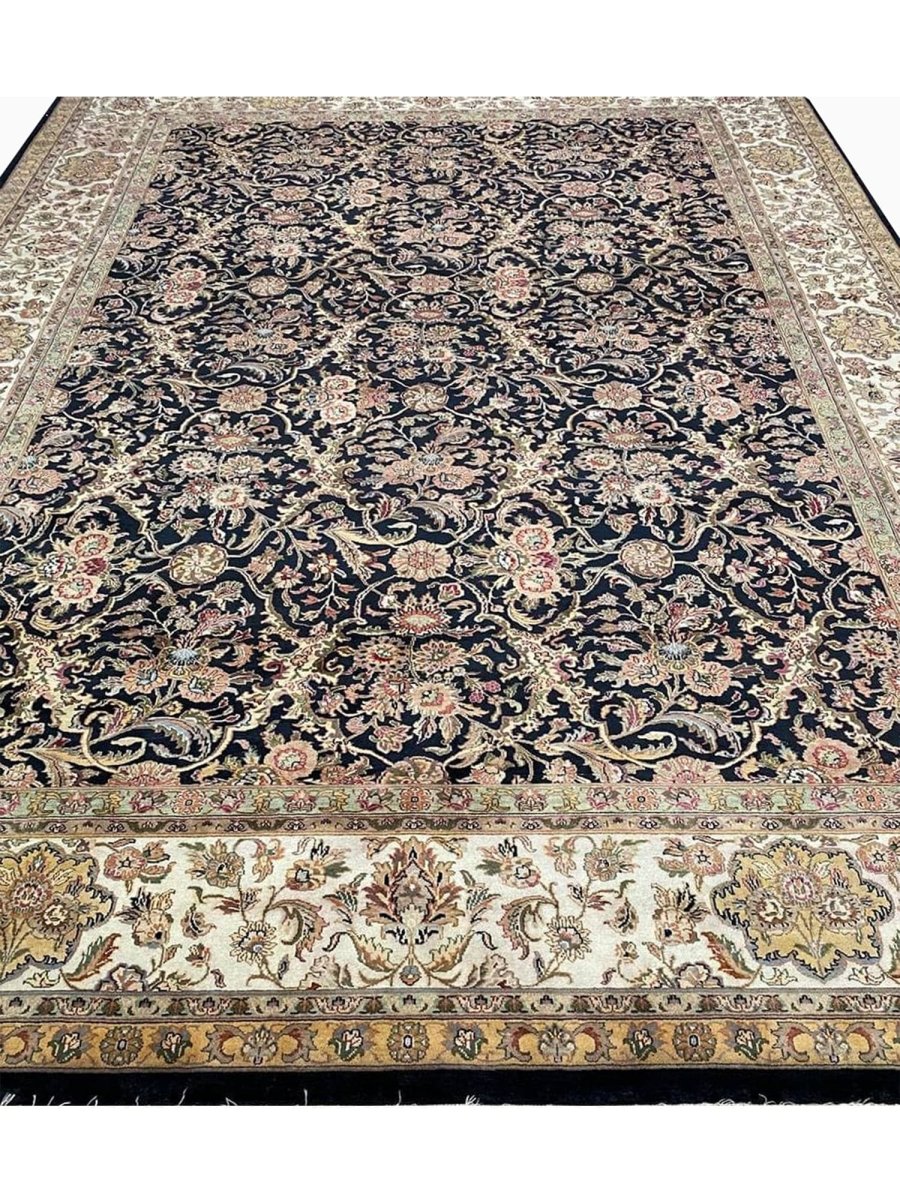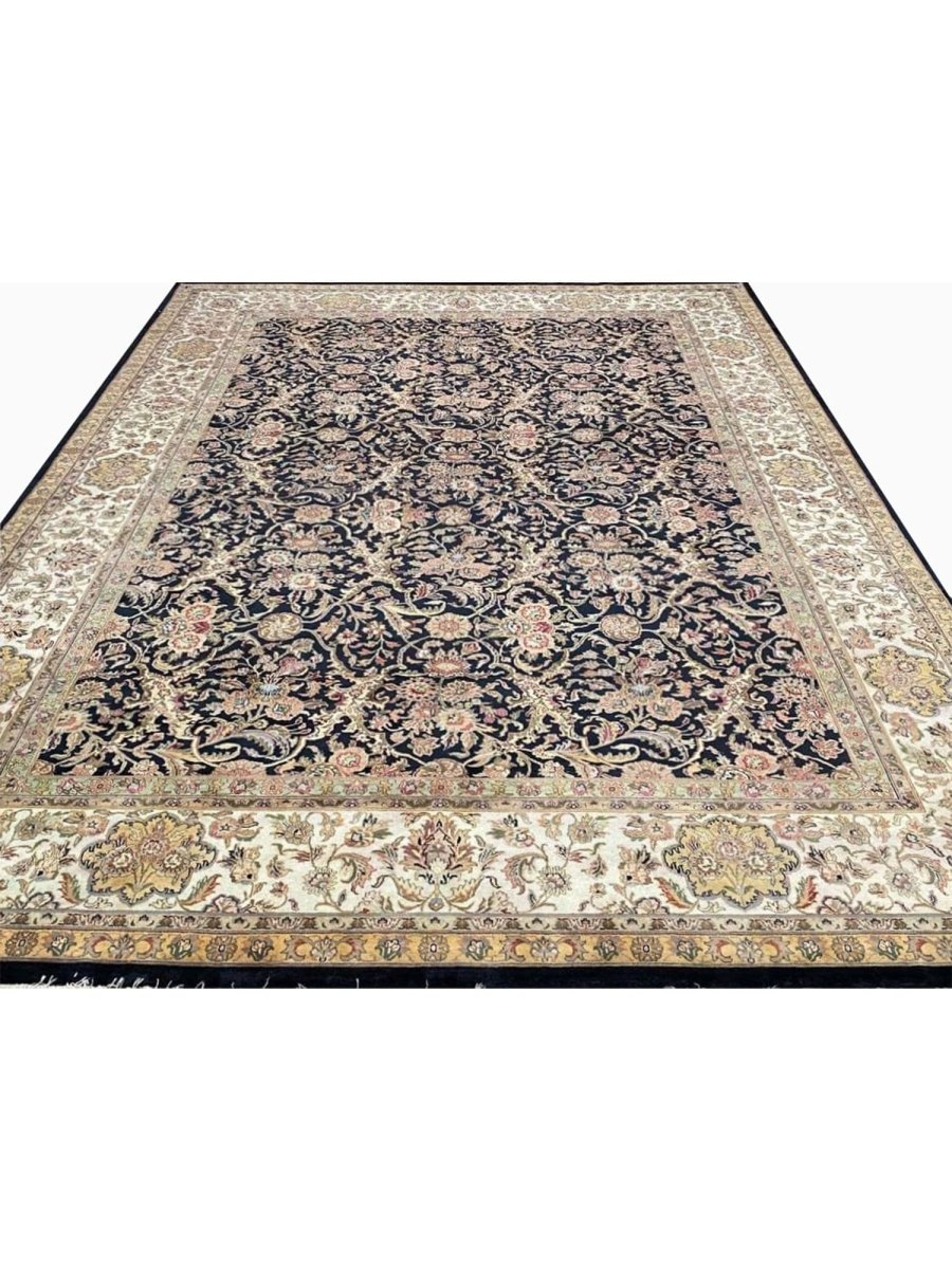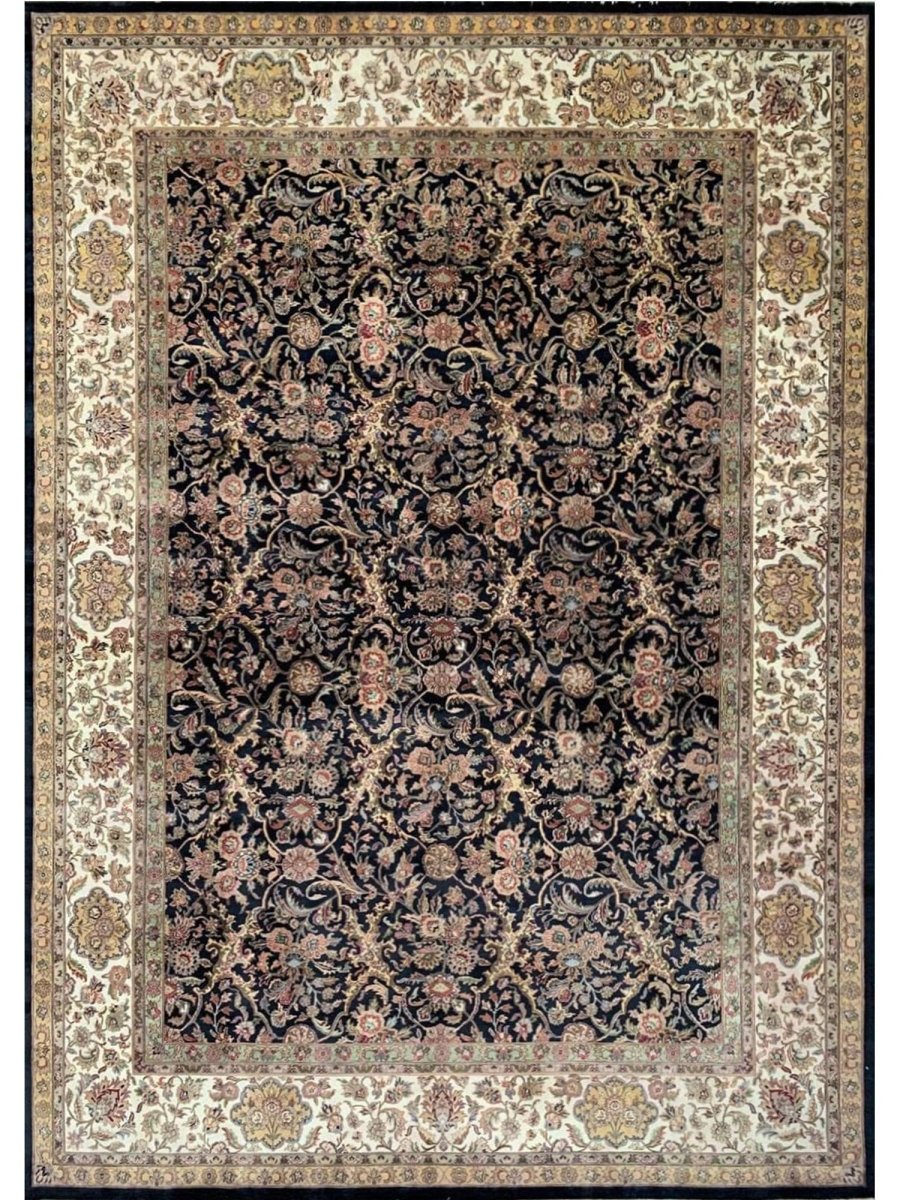 Enhance your space with the captivating beauty of this 10x14 Handwoven Indian Agra Area Rug. Handwoven in the Agra region of India, this rug displays a stunning all-over geometric pattern, reflecting the rich weaving traditions of India. The color palette features a deep blue background, beautifully contrasted with intricate geometric motifs and borders in beige and subtle accents of gold. Crafted from premium wool, this Indian area rug offers substantial density and lasting quality, perfect for high-traffic areas. Its impressive 10x14 size is ideal for anchoring large rooms such as spacious living rooms, dining rooms, or bedrooms, bringing timeless elegance and authentic Indian craftsmanship to your home.