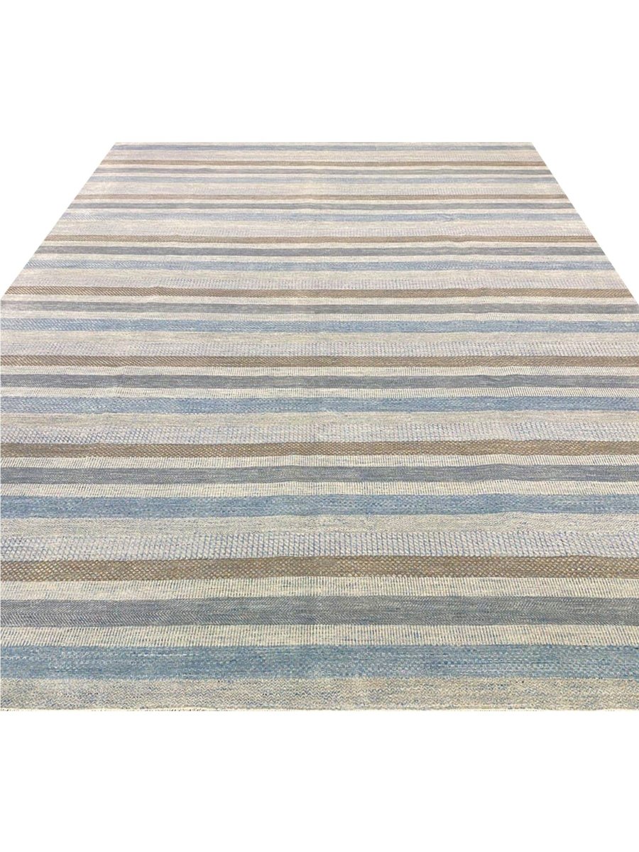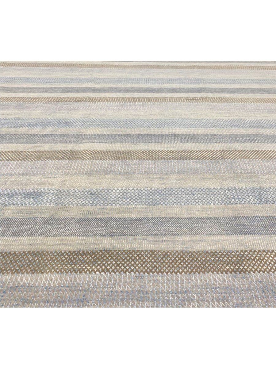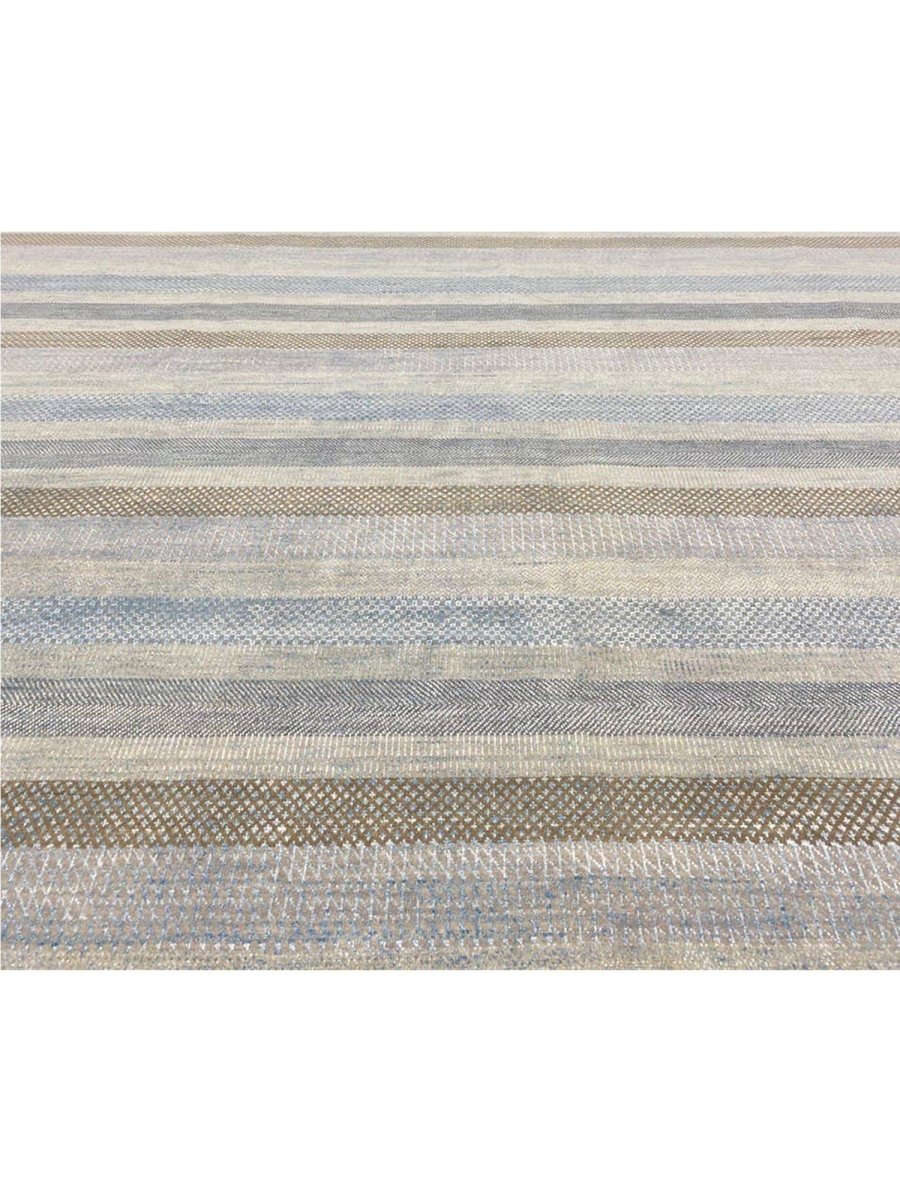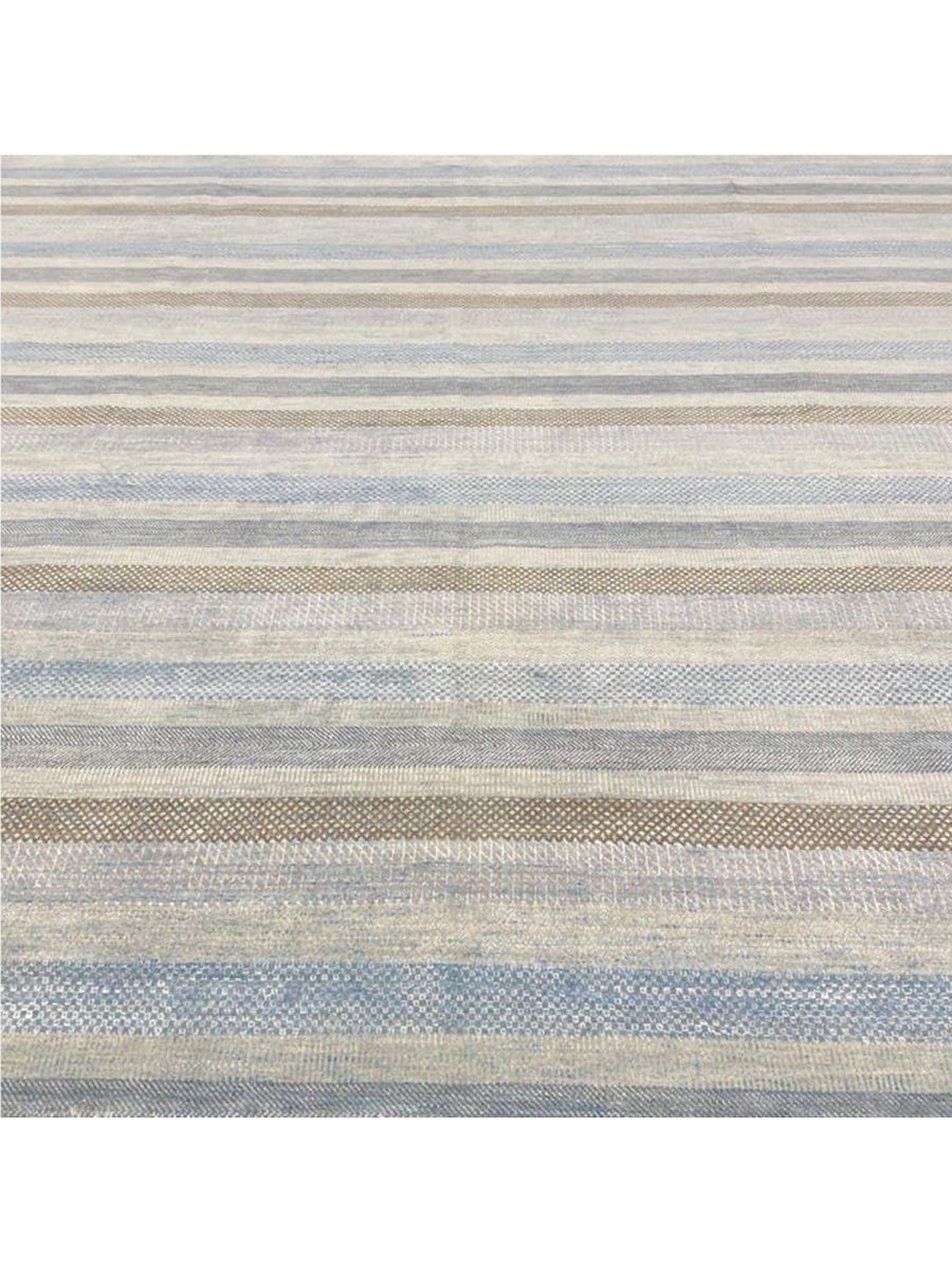 Transform your space with the commanding presence of this 10'1" x 14'2" modern area rug. Expertly hand-knotted in India from premium wool, this exquisite rug boasts a resilient texture and a sophisticated striped design that embodies contemporary aesthetics. The elegant color palette features a harmonious blend of light gray, blue, and brown tones, accented by serene bands of creamy off-white, adding depth, subtle texture, and refined modern elegance.