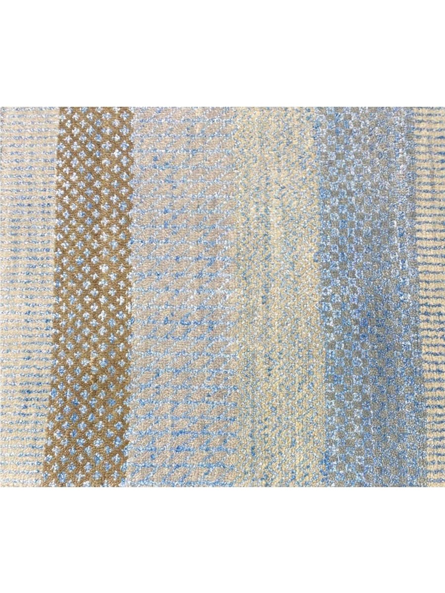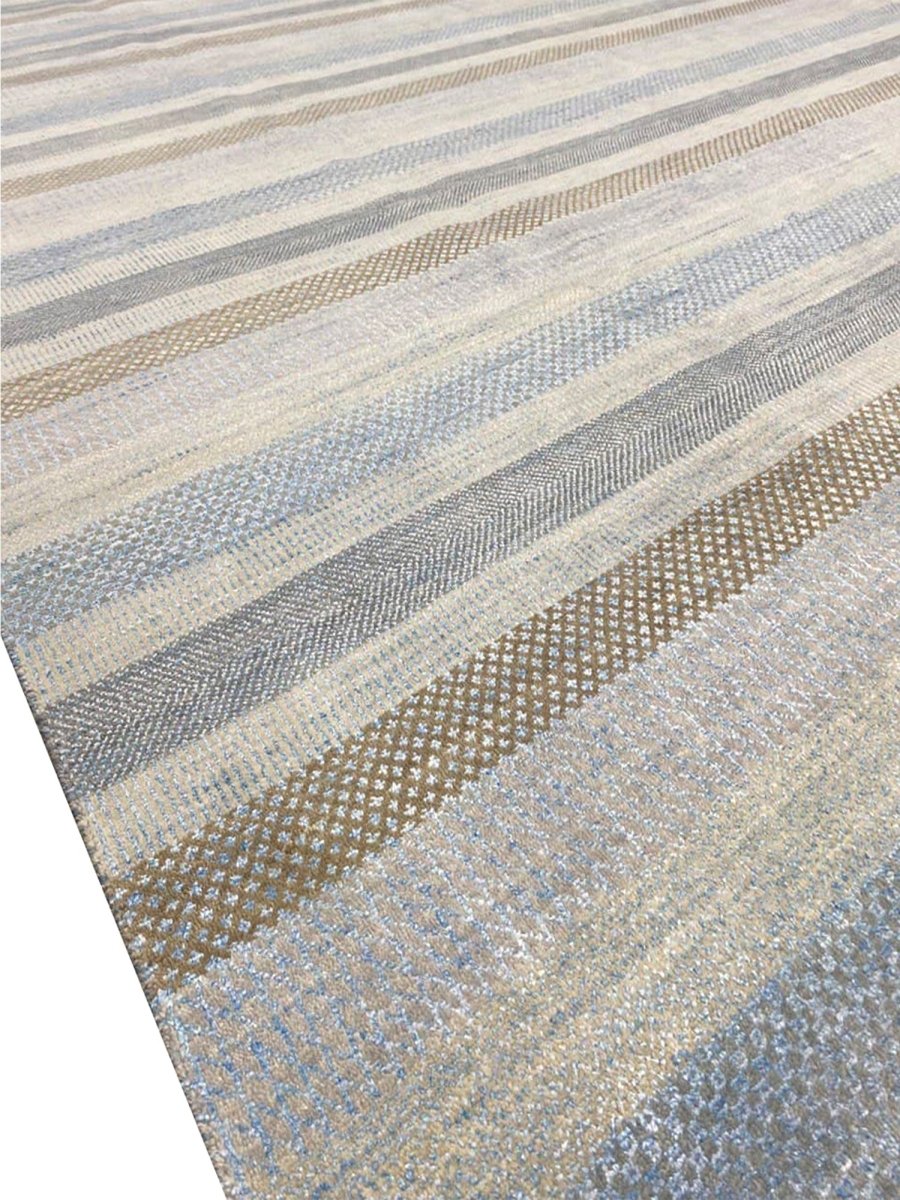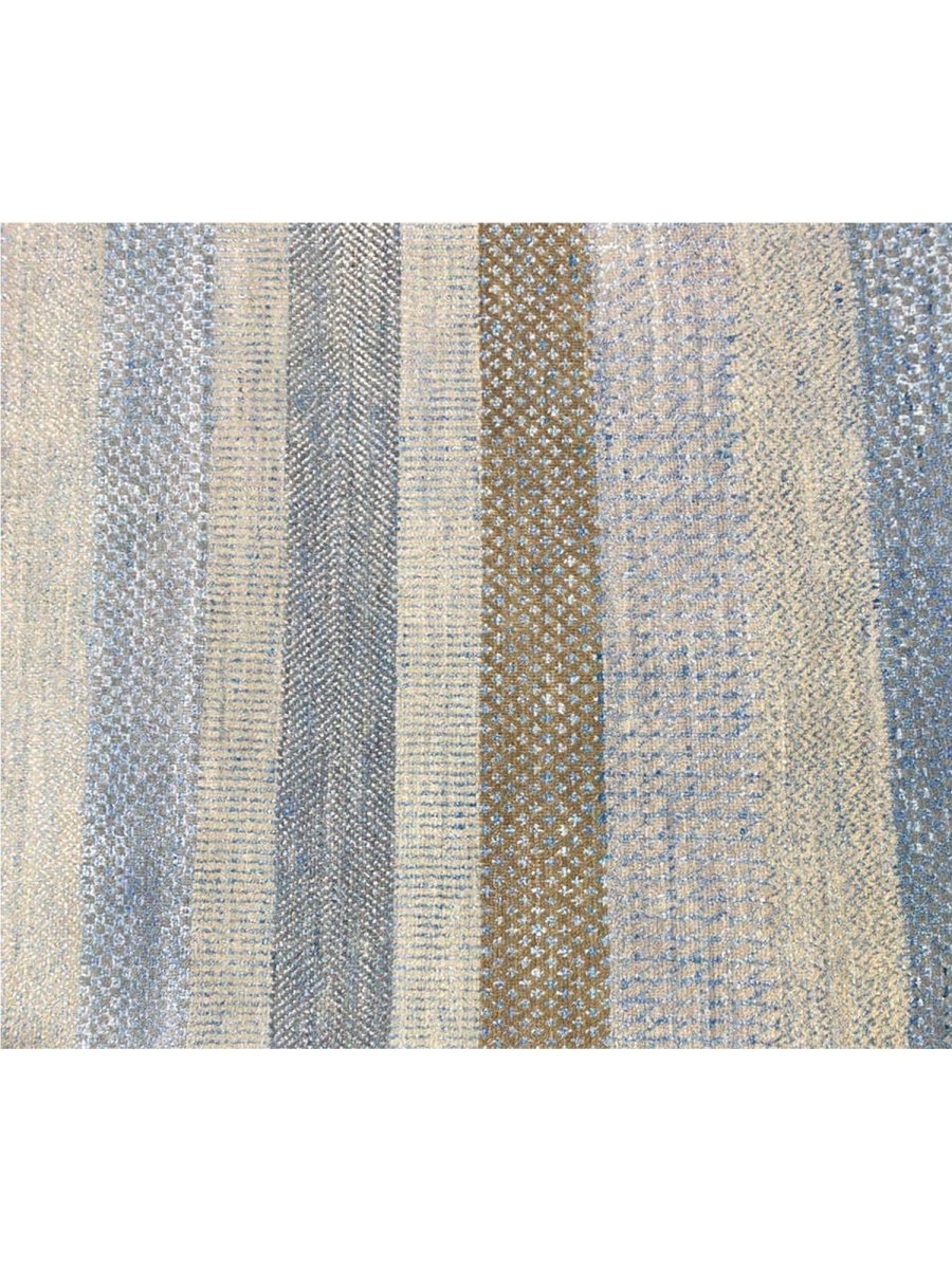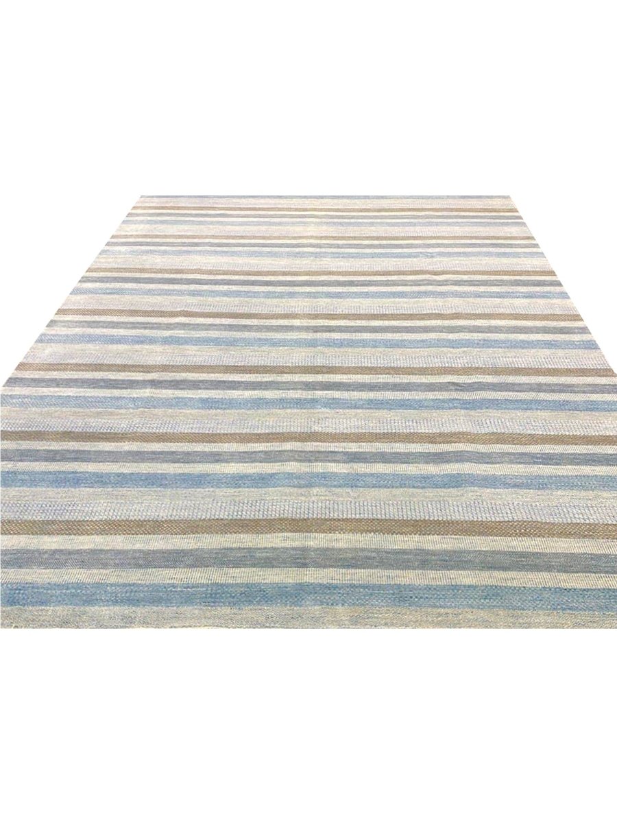 Transform your space with the commanding presence of this 10'1" x 14'2" modern area rug. Expertly hand-knotted in India from premium wool, this exquisite rug boasts a resilient texture and a sophisticated striped design that embodies contemporary aesthetics. The elegant color palette features a harmonious blend of light gray, blue, and brown tones, accented by serene bands of creamy off-white, adding depth, subtle texture, and refined modern elegance.