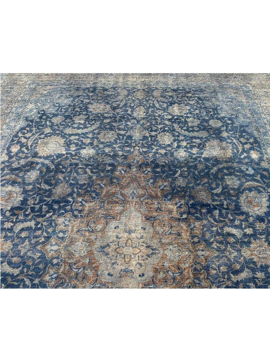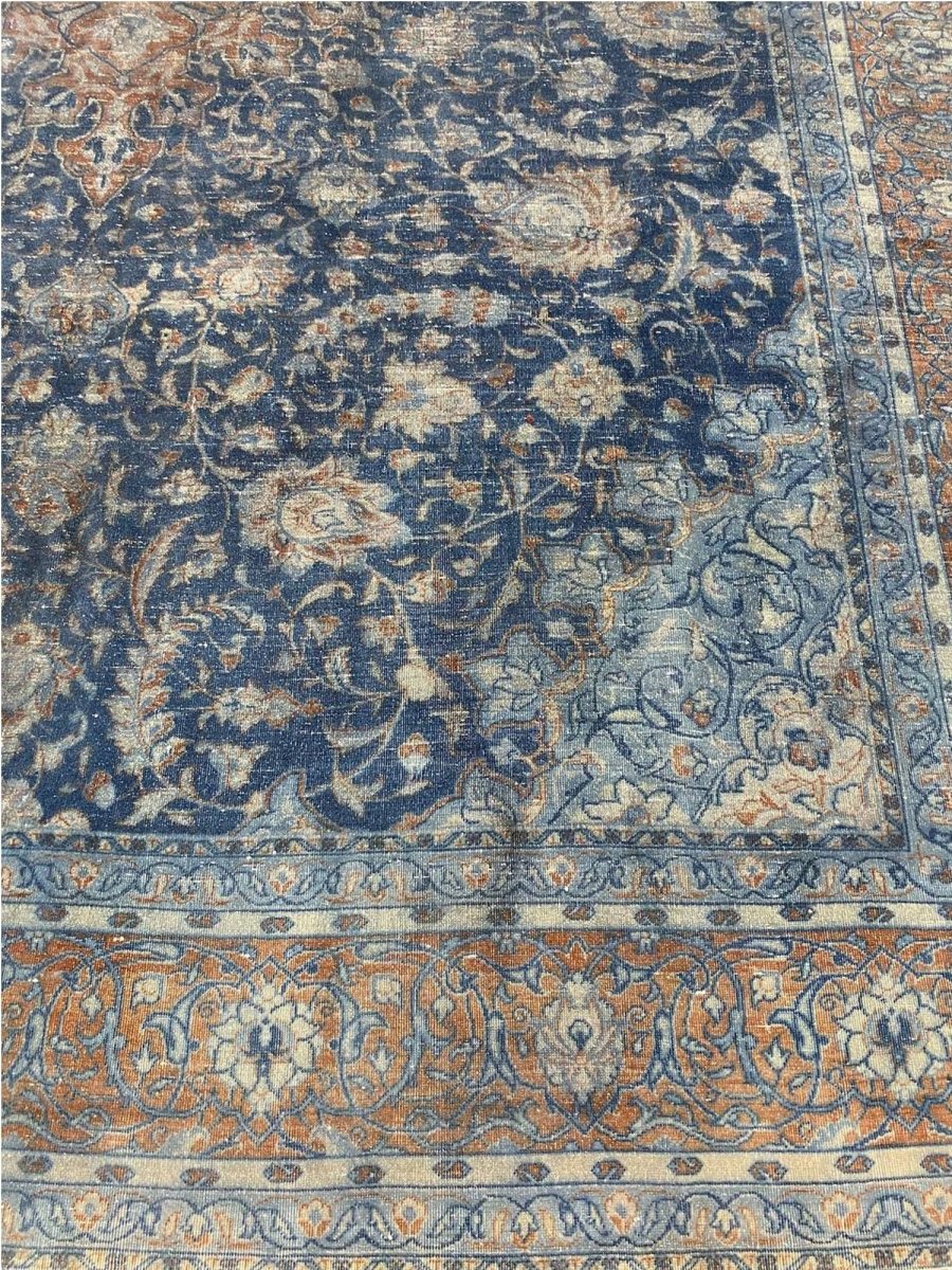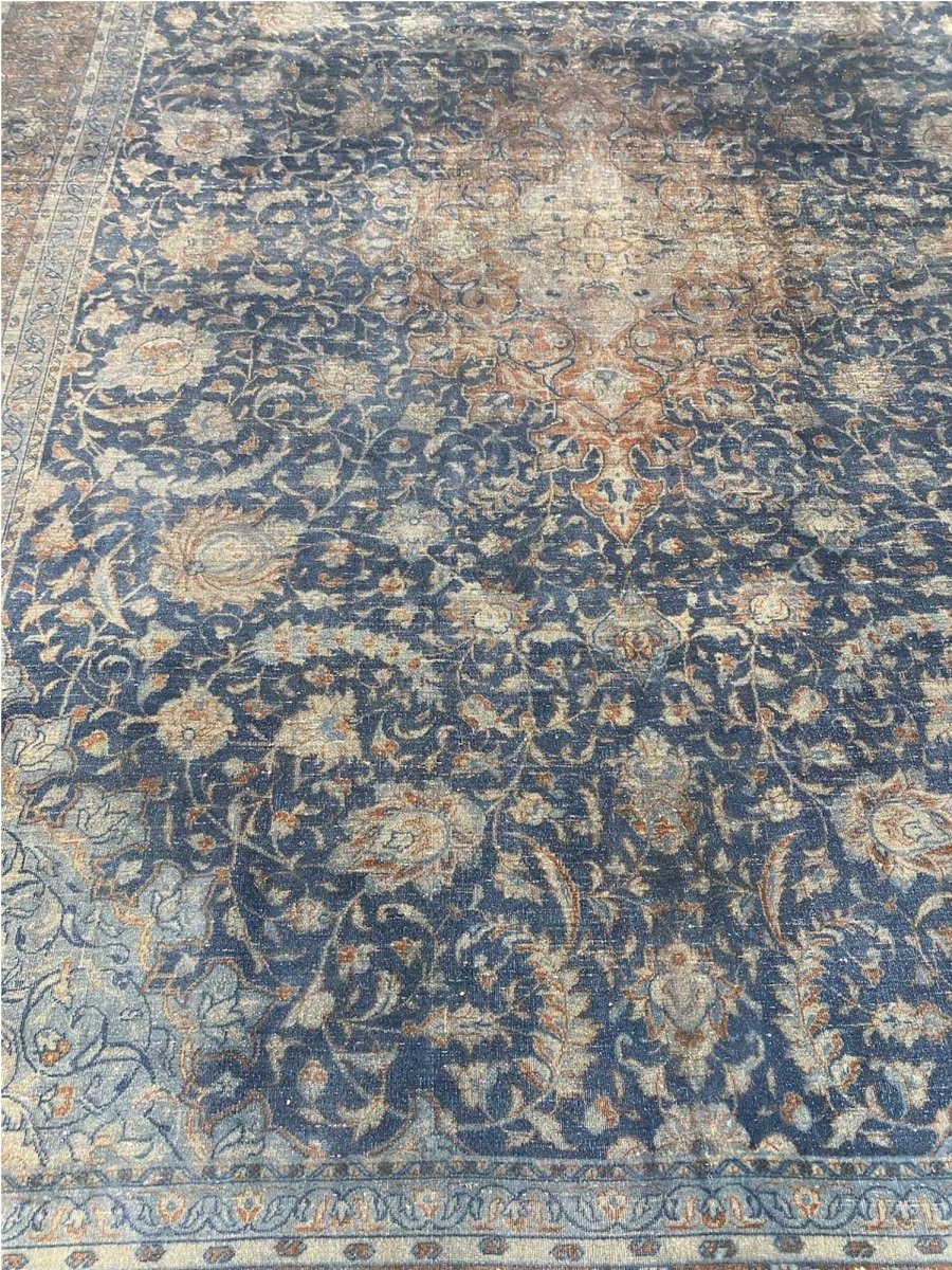 Discover the beauty of this 10x14 Old Persian Tabriz Area Rug. Handwoven in Persia, this rug showcases skilled artistry. The detailed medallion pattern gives it a sophisticated feel. The color palette features deep blue as a primary tone, complemented by shades of brown, beige, and light blue within the floral motifs and borders. These tones work together to create an elegant and calming ambiance. Made from durable wool, this rug is more than just a floor covering; it's a work of art that will enhance your home decor for years. Enjoy the lasting charm of a handwoven rug, plus free shipping within the United States.