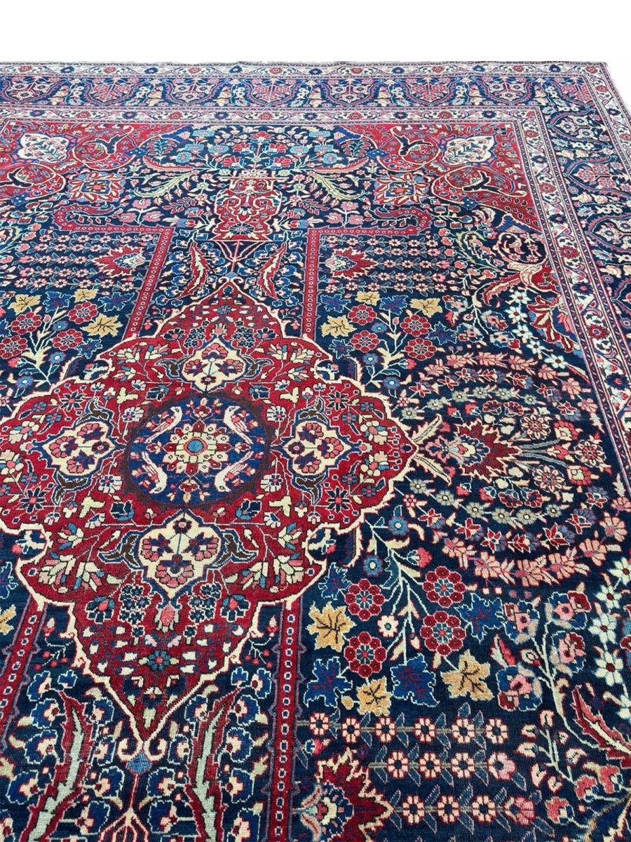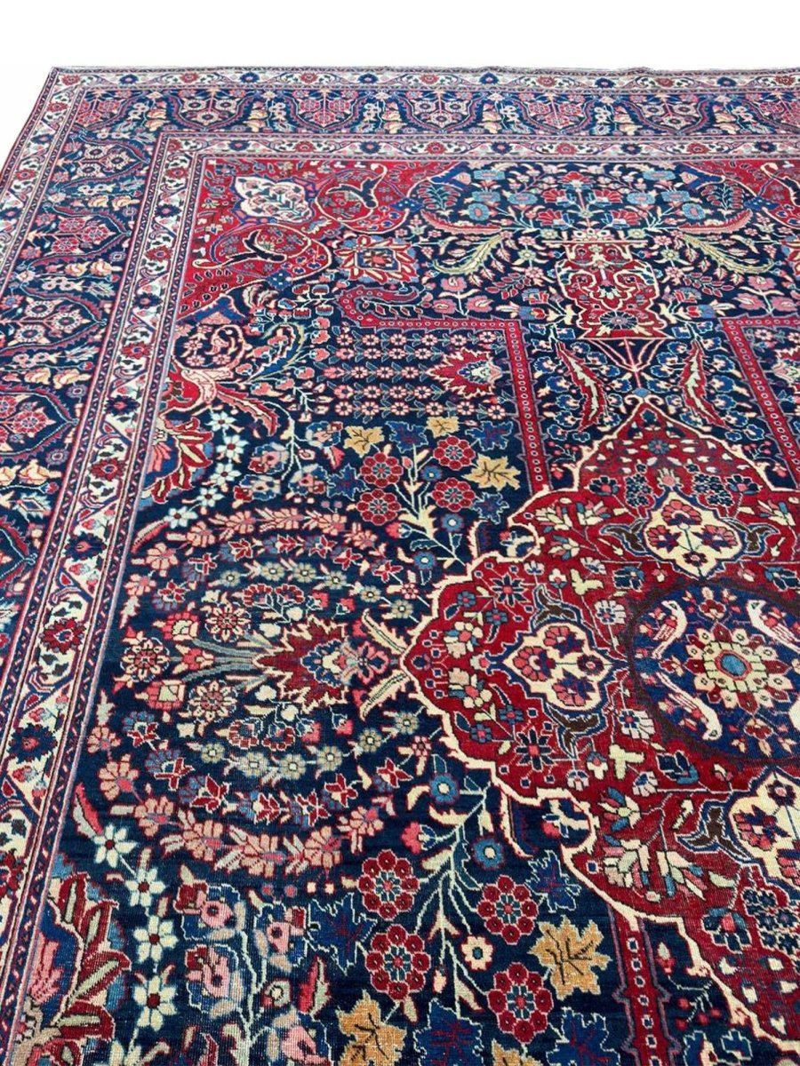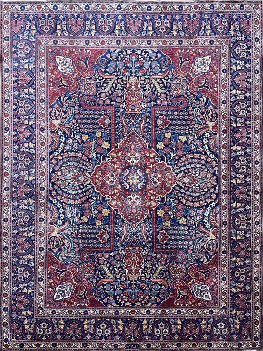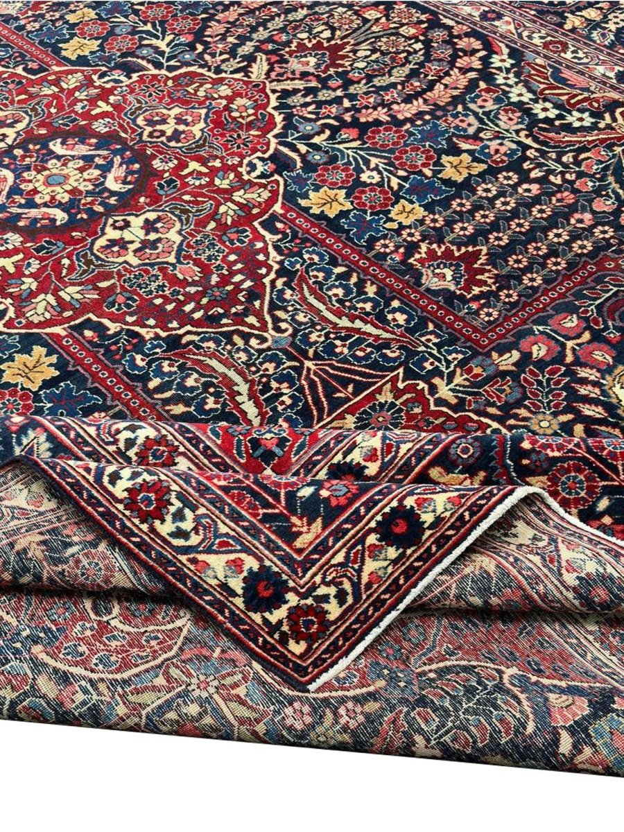 Decorate your space with the striking beauty of this 10x14 Old Persian Tabriz area rug. Handmade in Persia from wool, the magnificent rug showcases a commanding central medallion design. The background presents a beautiful, deep navy blue tone, providing the classic backdrop to the intricate design. Rich and elaborate design, featuring floral motifs, has a color palette of red, light blue, warm beige, gold, pink, and green. This generously sized piece is perfect for anchoring spacious bedrooms, living rooms, or dining areas. Crafted with traditional hand-making techniques, this wool rug offers enduring durability and a soft touch underfoot. Enjoy the convenience of free and fast delivery within the United States.