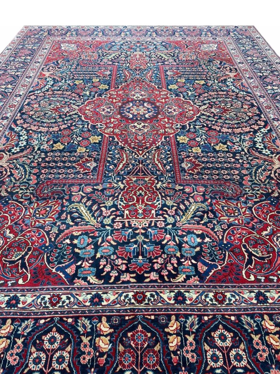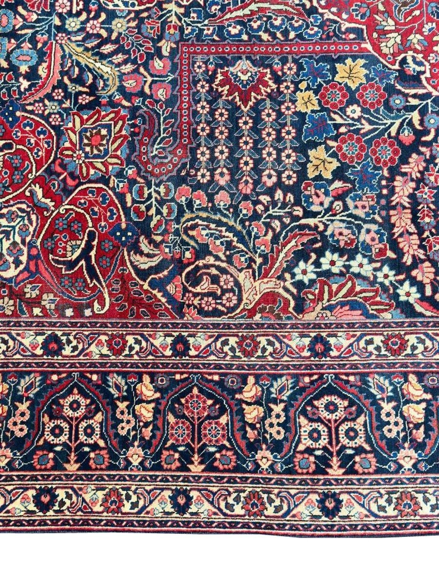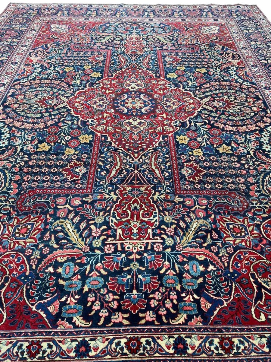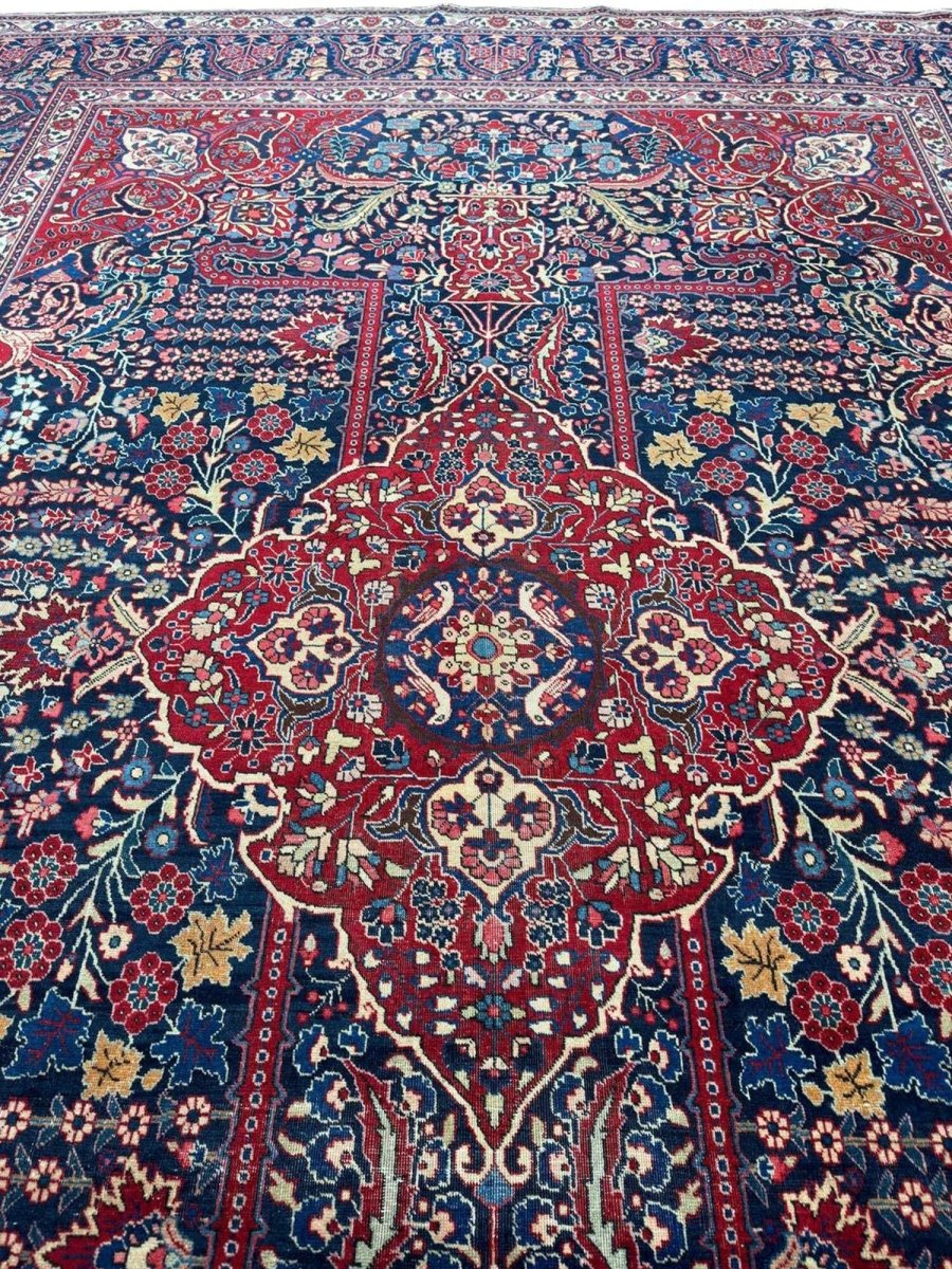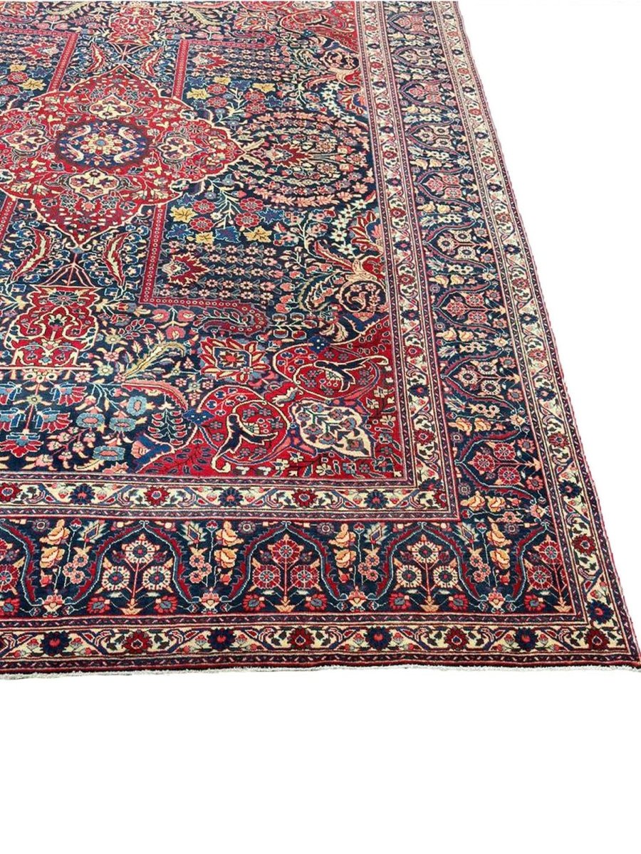 Decorate your space with the striking beauty of this 10x14 Old Persian Tabriz area rug. Handmade in Persia from wool, the magnificent rug showcases a commanding central medallion design. The background presents a beautiful, deep navy blue tone, providing the classic backdrop to the intricate design. Rich and elaborate design, featuring floral motifs, has a color palette of red, light blue, warm beige, gold, pink, and green. This generously sized piece is perfect for anchoring spacious bedrooms, living rooms, or dining areas. Crafted with traditional hand-making techniques, this wool rug offers enduring durability and a soft touch underfoot. Enjoy the convenience of free and fast delivery within the United States.