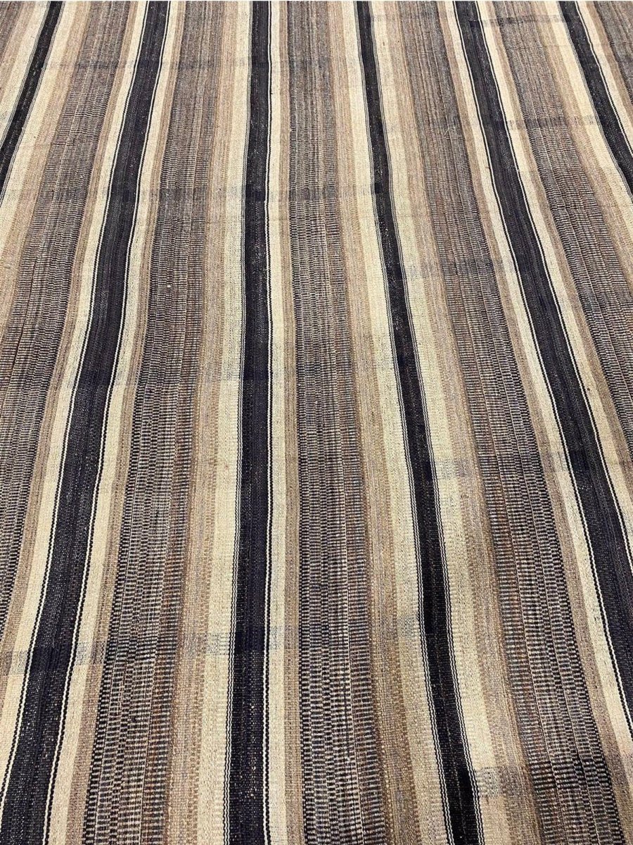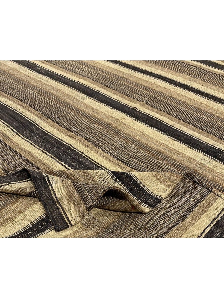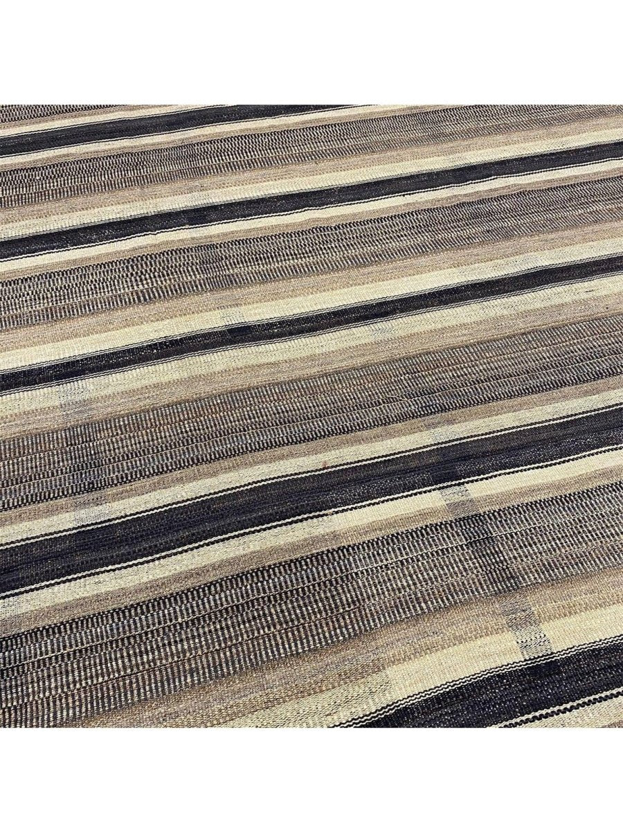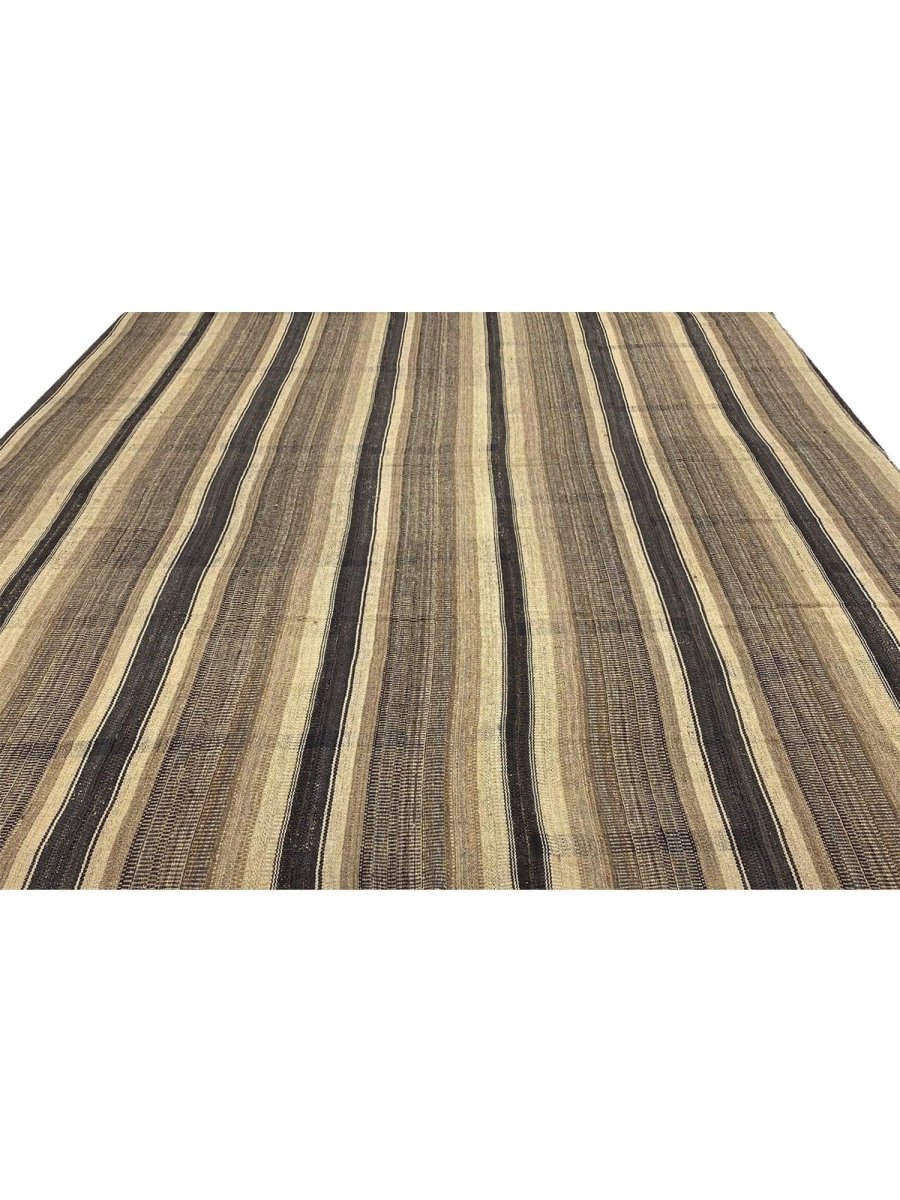 This 11x13 Handwoven Persian Kilim Rug is a true testament to classic craftsmanship, featuring a classic striped pattern in beige, brown and black hues. Woven in Persia, this rug is hand-knotted from high-quality wool, ensuring a soft yet durable surface that withstands daily use. Its flat-weave construction provides a lightweight texture, making it ideal for layering or as a standalone statement piece.