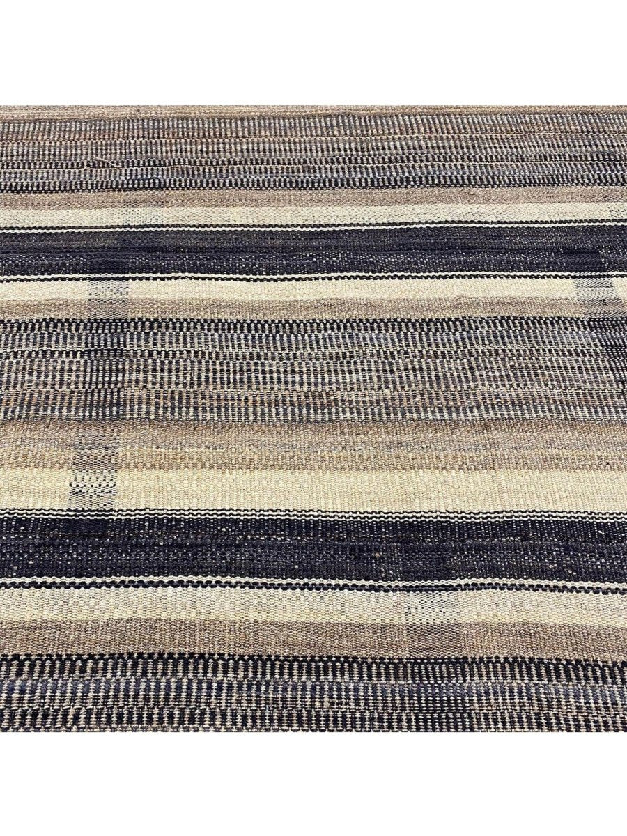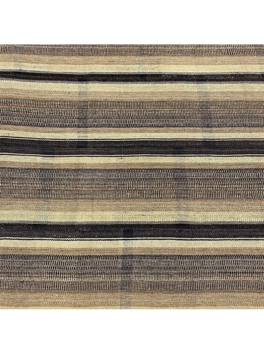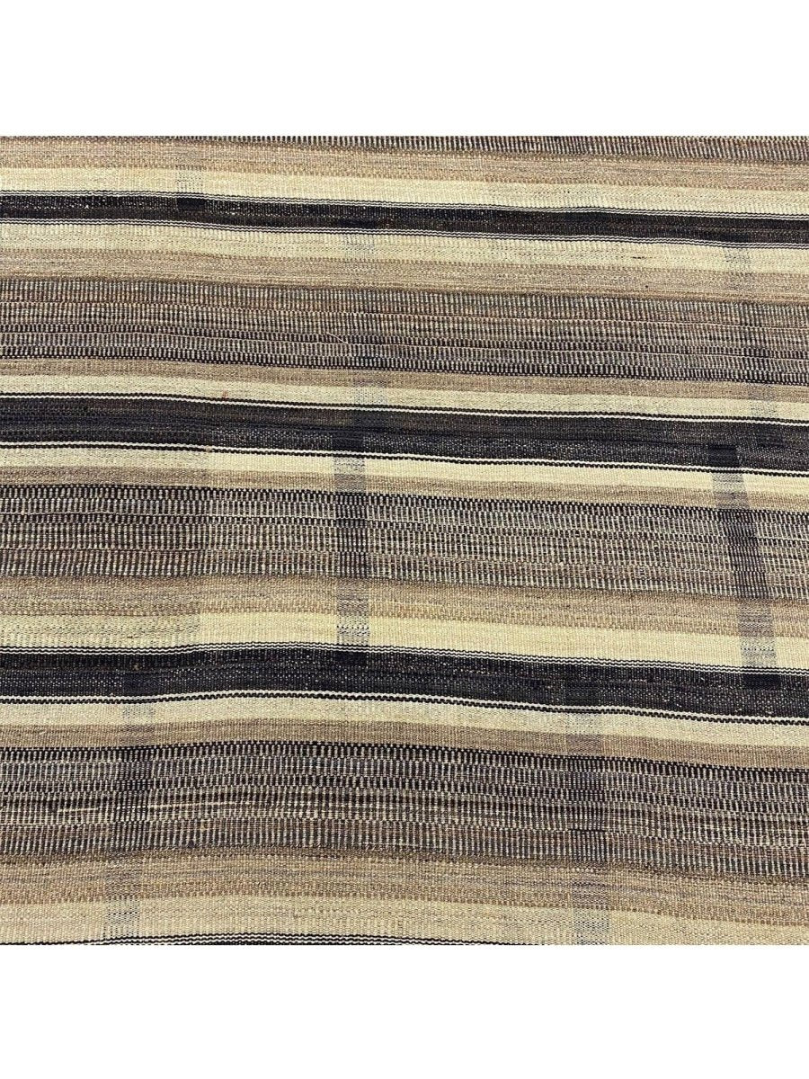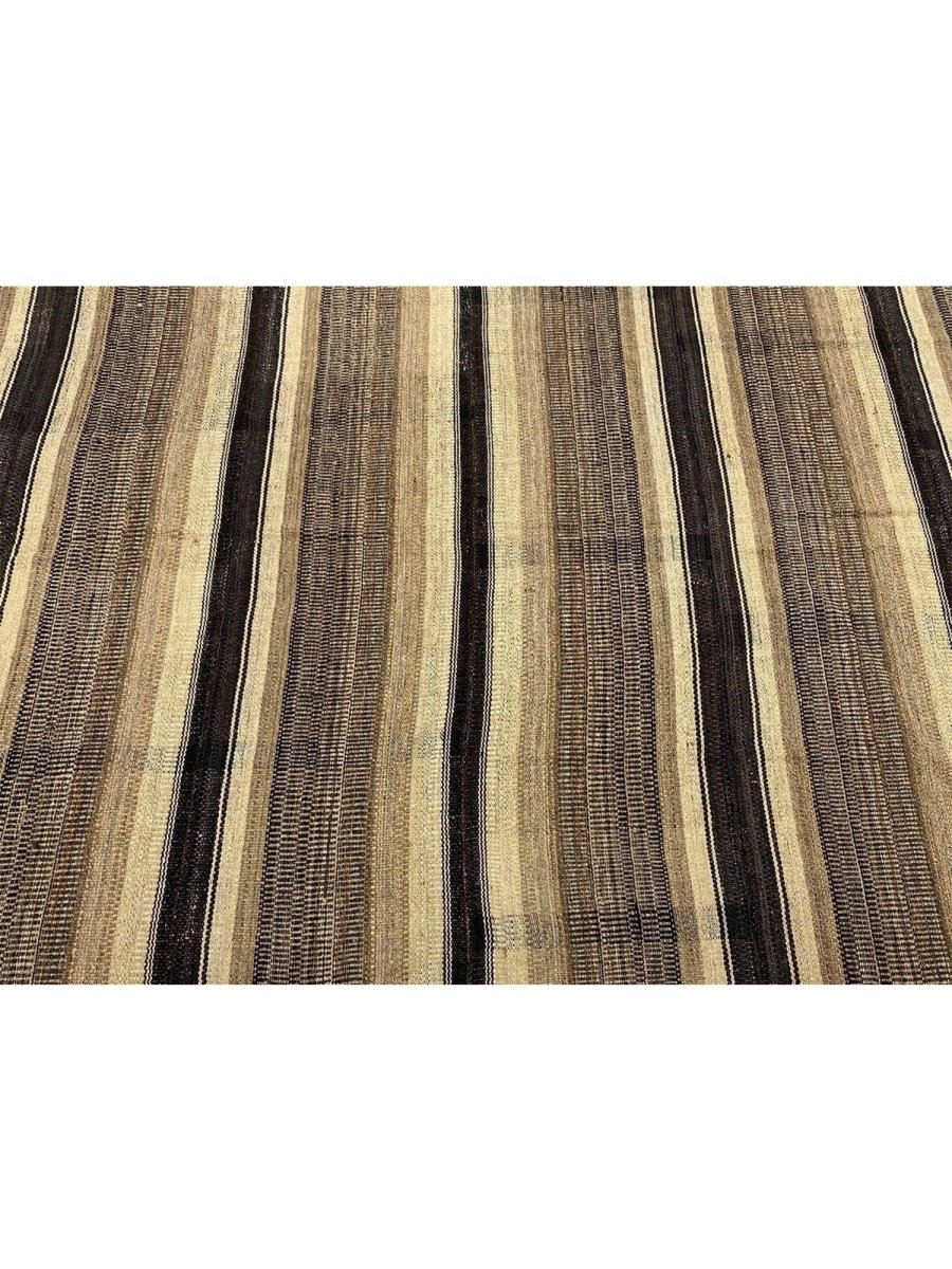 This 11x13 Handwoven Persian Kilim Rug is a true testament to classic craftsmanship, featuring a classic striped pattern in beige, brown and black hues. Woven in Persia, this rug is hand-knotted from high-quality wool, ensuring a soft yet durable surface that withstands daily use. Its flat-weave construction provides a lightweight texture, making it ideal for layering or as a standalone statement piece.