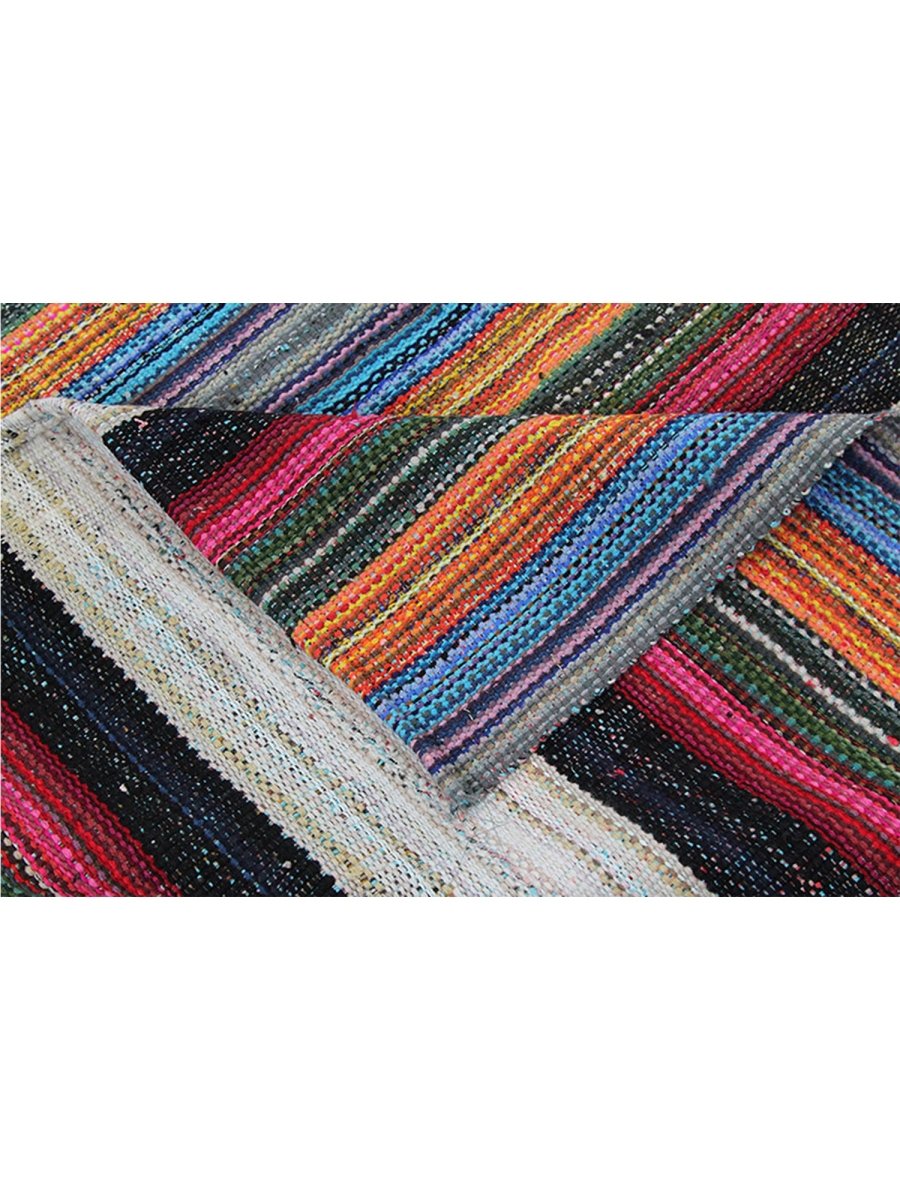This 11x13 Handwoven Persian Kilim Rug is a stunning example of cultural craftsmanship. It blends black, red, blue, orange, and gray in a vibrant striped pattern. Woven in Persia, this rug is crafted from a high-quality cotton blend, ensuring a soft yet durable surface that enhances any space with its unique charm. The flat-weave construction provides a lightweight and flexible texture, making it ideal for layering or as a standout centerpiece.