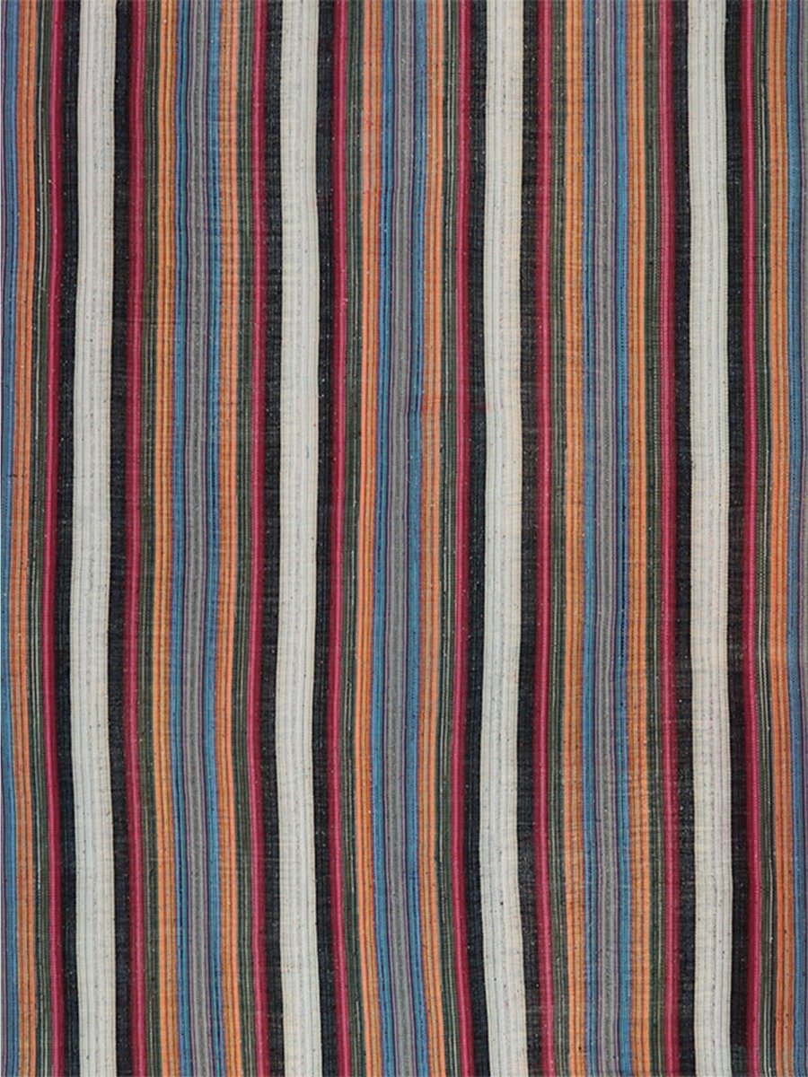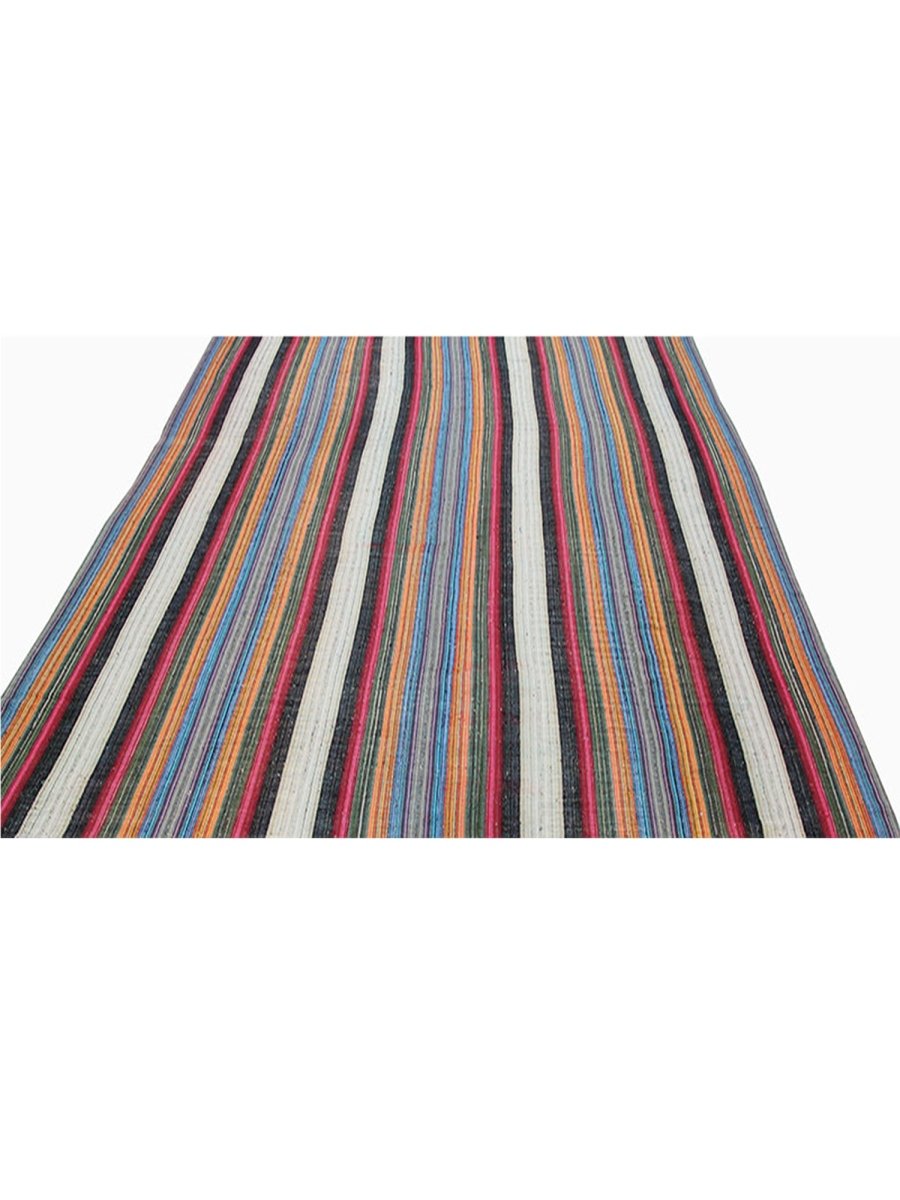 The bold, colorful striped design adds movement and energy to sleek, bohemian, and eclectic interiors. This Persian Kilim rug effortlessly combines cultural artistry with visual appeal.