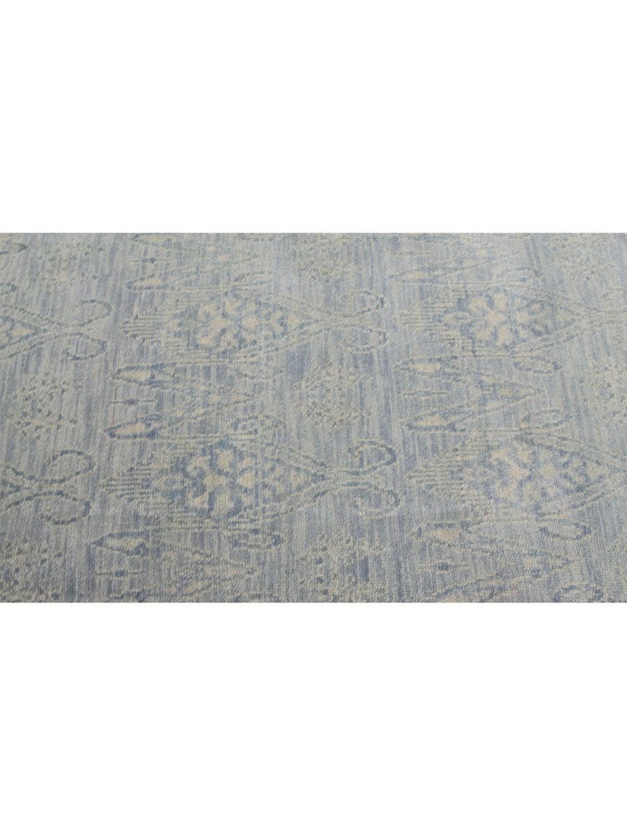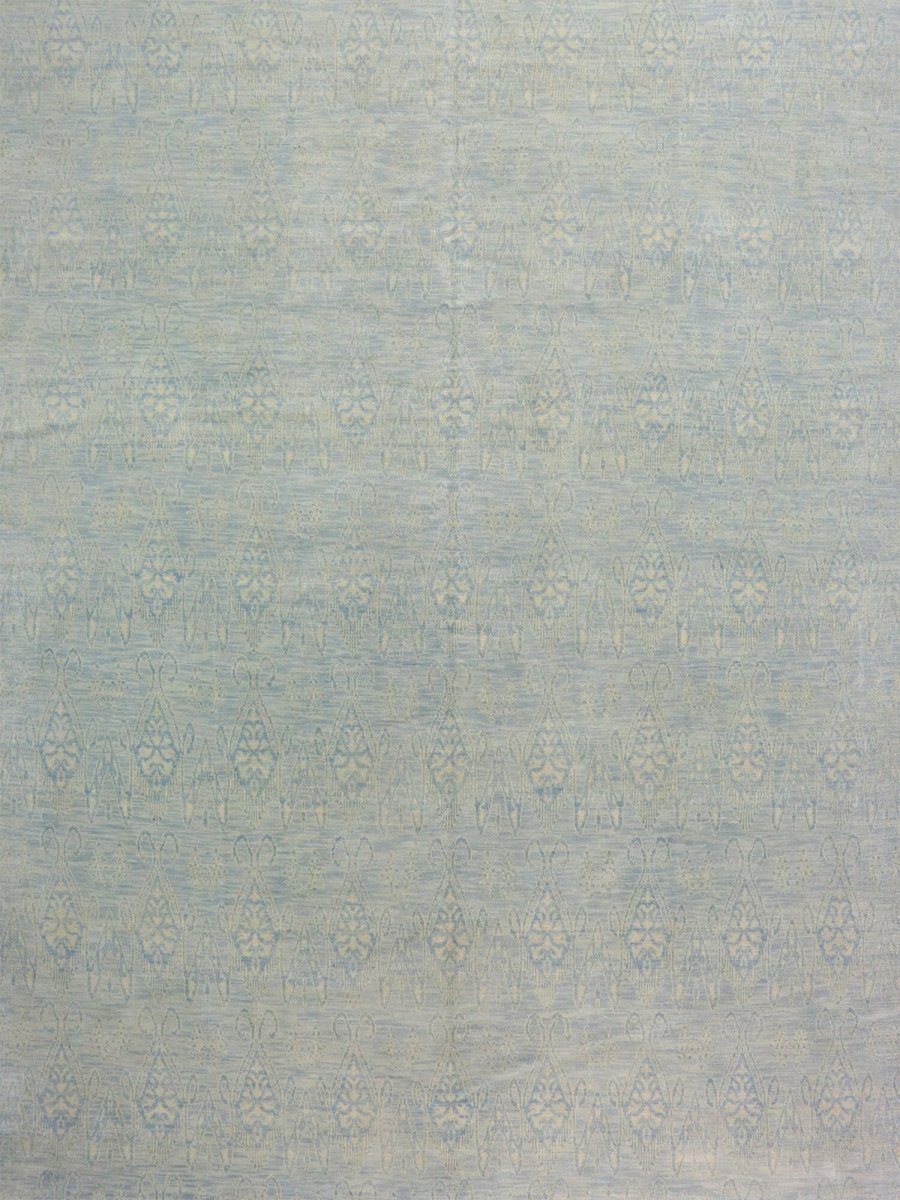 Immerse your space in the unique allure of this magnificent 12x15 Indo Ikat Area Rug. Hand-knotted by skilled artisans in India from premium wool, this new rug offers a soft underfoot feel and exceptional durability. The captivating Ikat pattern features subtle, distressed motifs in gentle tones of light blue, gray, and cream, creating a sophisticated and calming visual appeal that effortlessly enhances any room.
