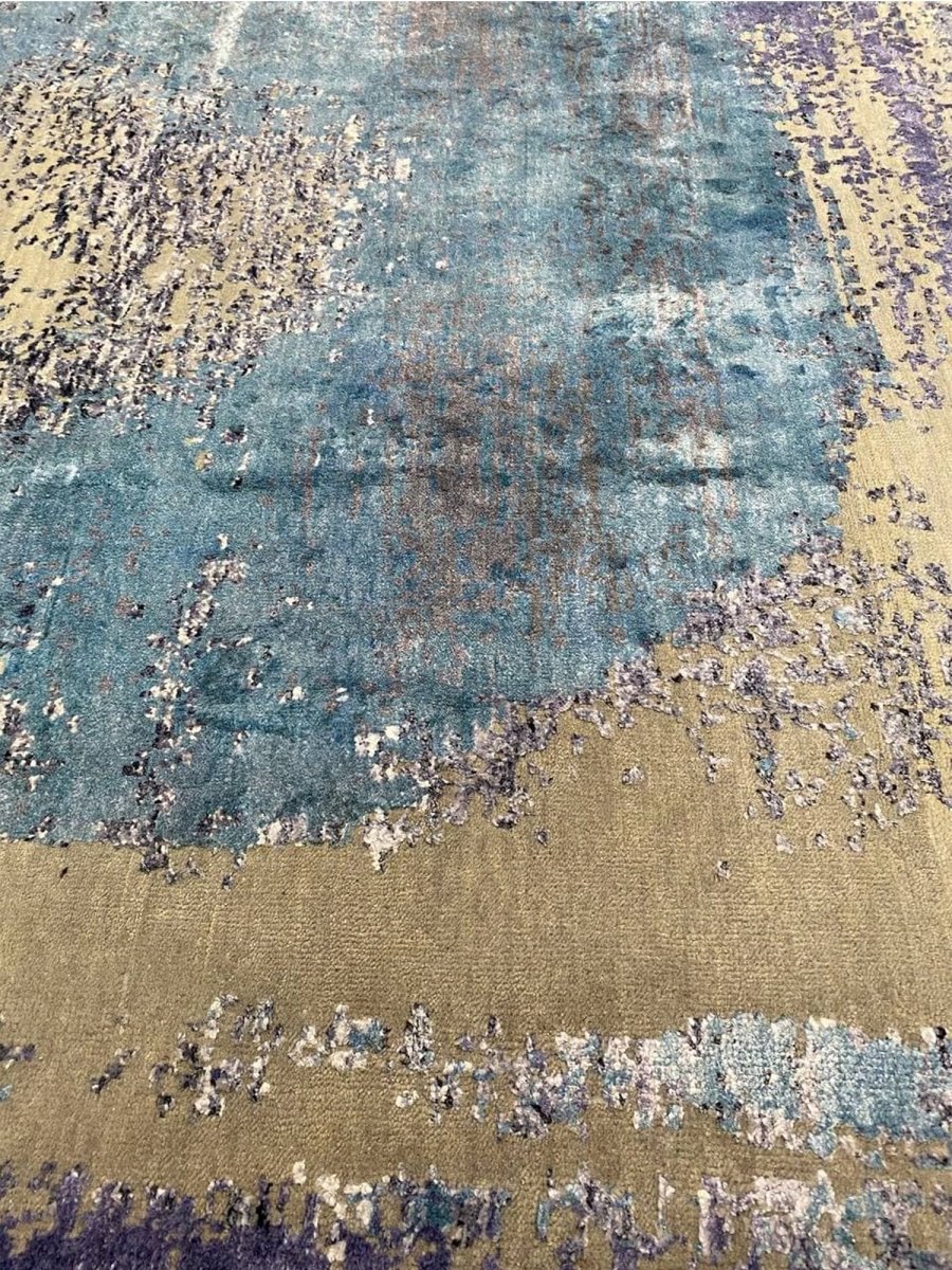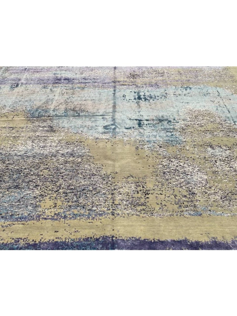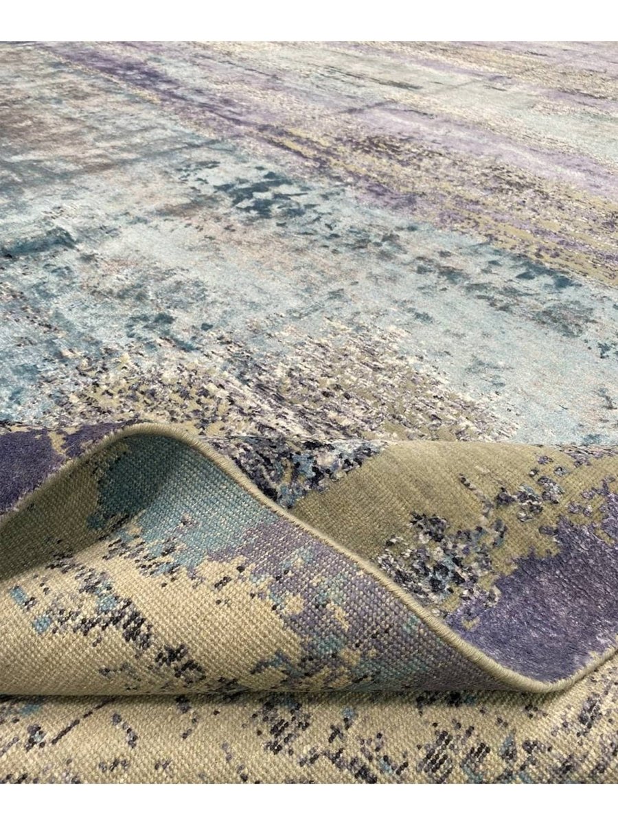 Infuse your grand living space with a burst of artistic energy with this captivating hand-knotted 12x15 area rug, meticulously crafted in India. This generously sized rug features an expressive abstract pattern, where a dynamic interplay of deep purple, teal, and warm beige tones creates a visually stunning landscape. The design evokes a sense of fluid movement and rich texture, offering a compelling vibrant and refined aesthetic.