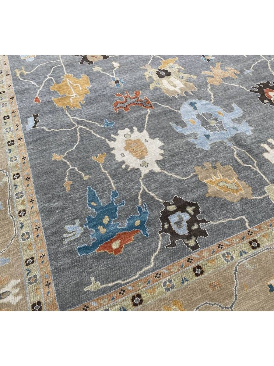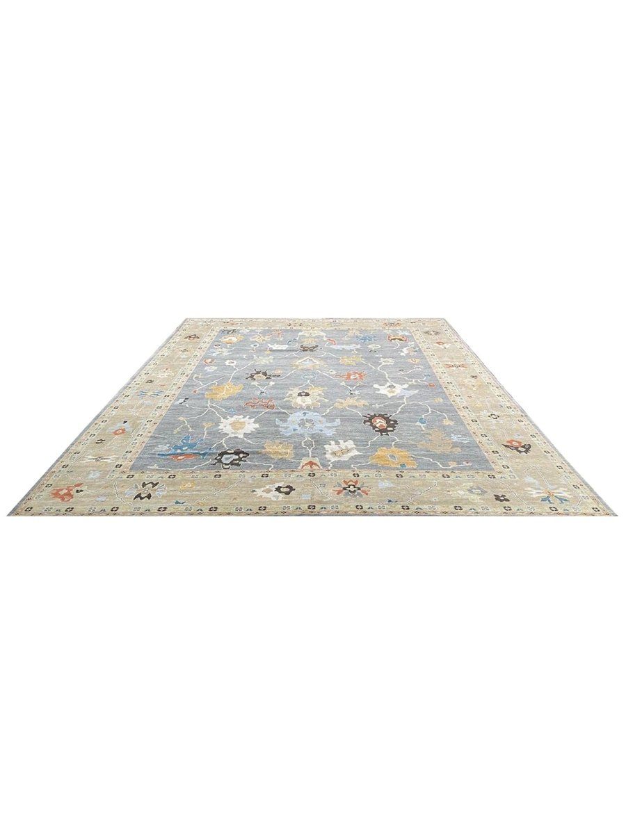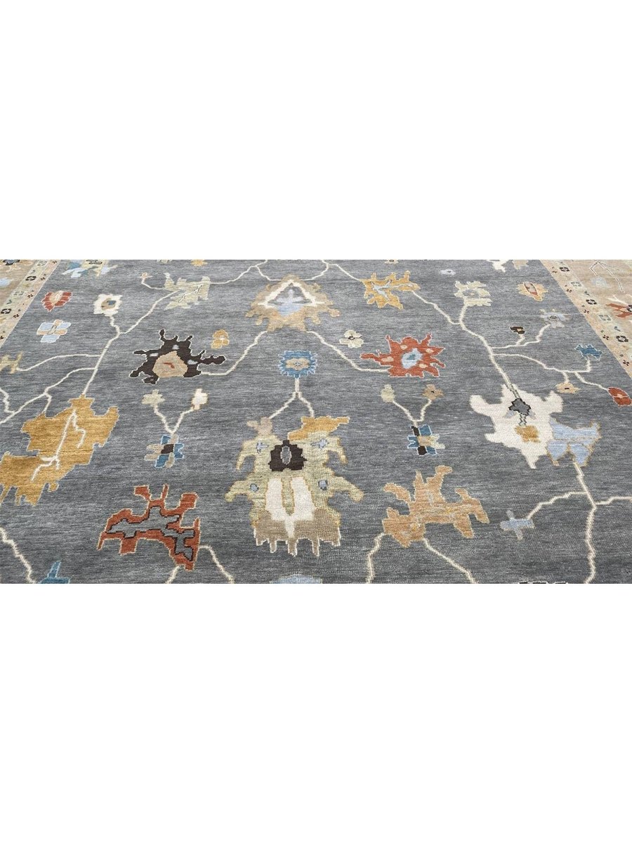 Experience the beauty of traditional Indian craftsmanship with this exquisite 12x15 Oushak area rug, expertly hand-woven from high-quality materials. This new rug boasts exceptional quality and a unique, one-of-a-kind design. The rug's beautiful gray base provides a calm and serene backdrop for the stunning sandy border and geometric pattern, featuring a captivating combination of white, gold, blue, beige, brown, gray, and peach hues. The peach tones add a touch of softness and elegance, while the blue accents provide a lively pop of color and energy. The timeless design and rich color palette make this rug perfect for adding sophistication and warmth to any room. With its durable construction and premium materials, this rug is sure to remain a treasured possession for years to come.
