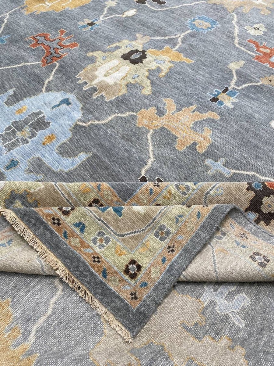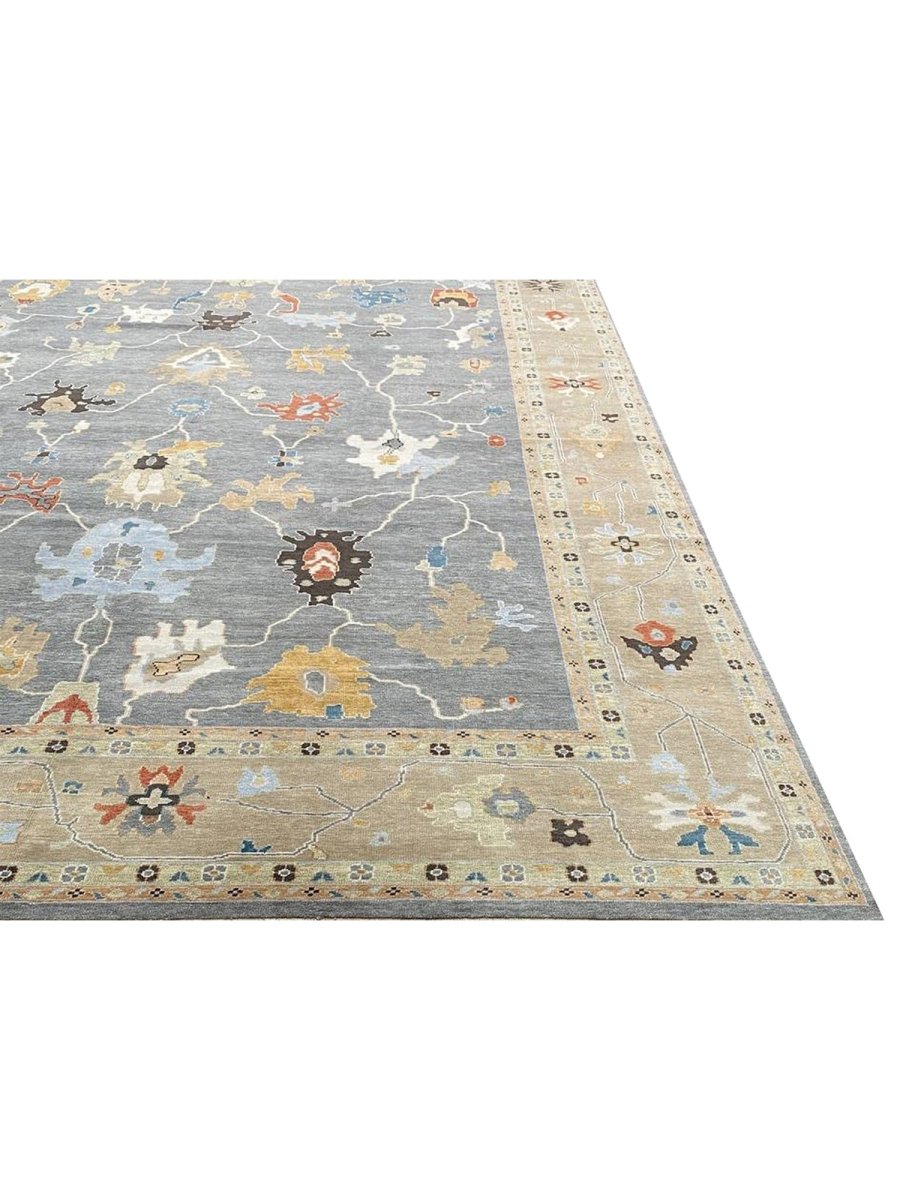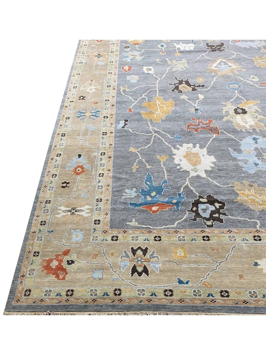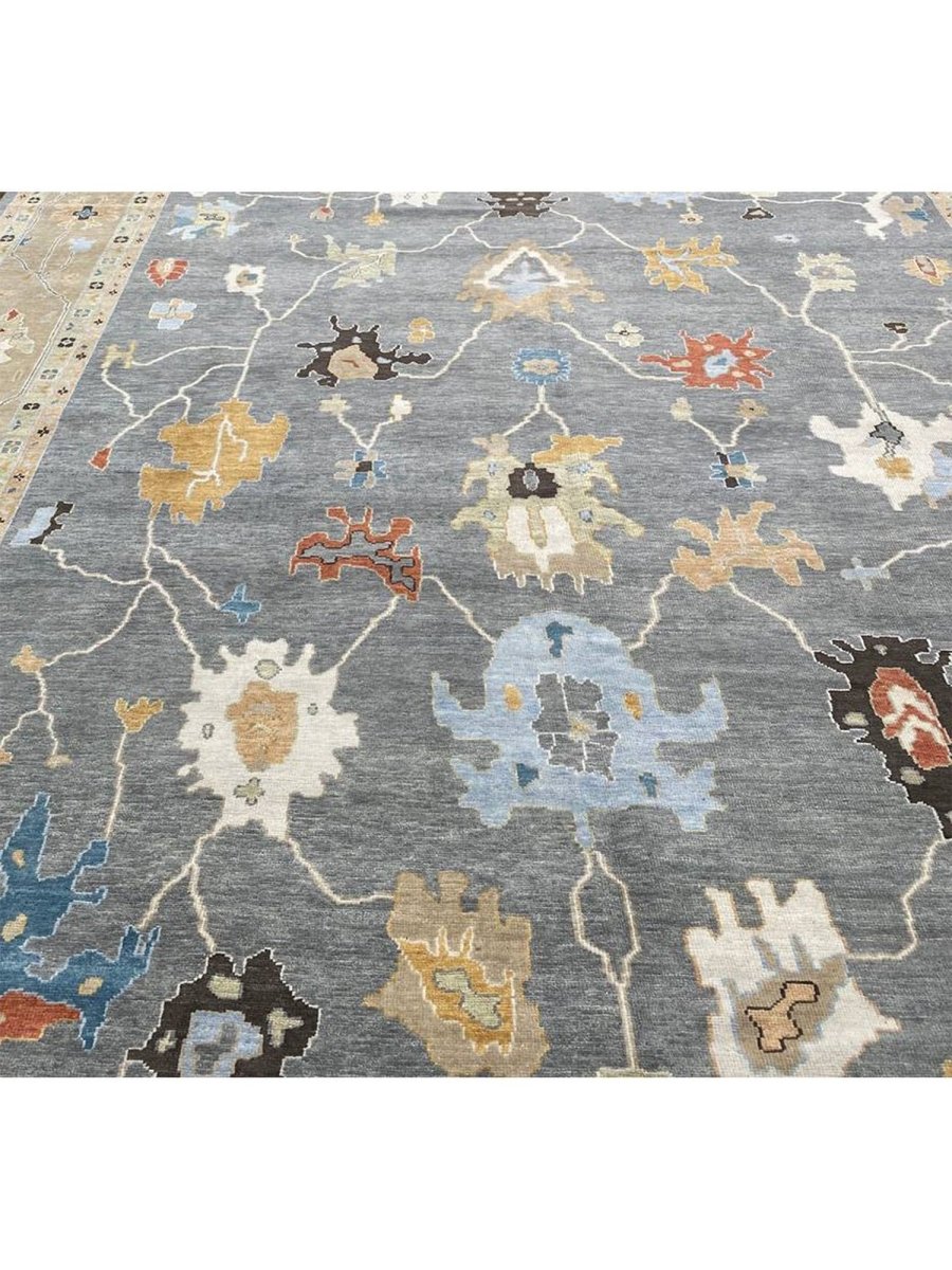 Experience the beauty of traditional Indian craftsmanship with this exquisite 12x15 Oushak area rug, expertly hand-woven from high-quality materials. This new rug boasts exceptional quality and a unique, one-of-a-kind design. The rug's beautiful gray base provides a calm and serene backdrop for the stunning sandy border and geometric pattern, featuring a captivating combination of white, gold, blue, beige, brown, gray, and peach hues. The peach tones add a touch of softness and elegance, while the blue accents provide a lively pop of color and energy. The timeless design and rich color palette make this rug perfect for adding sophistication and warmth to any room. With its durable construction and premium materials, this rug is sure to remain a treasured possession for years to come.