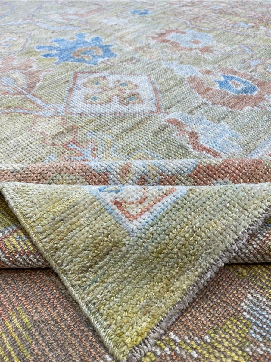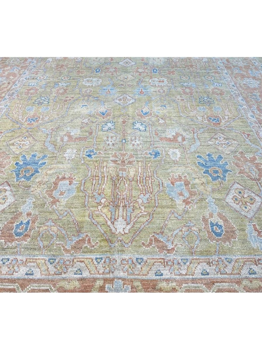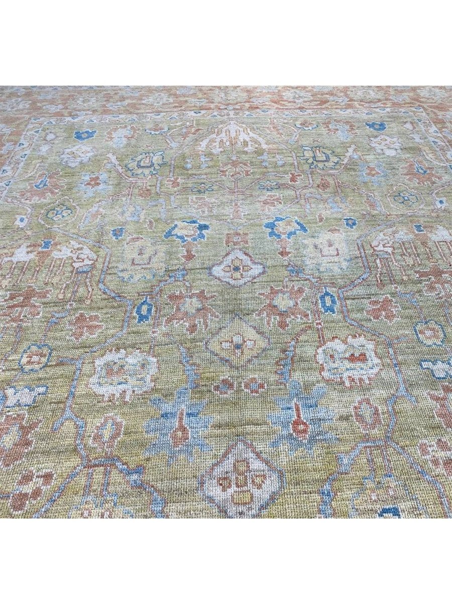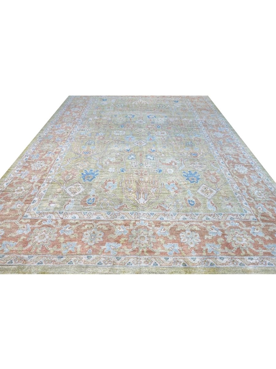 Discover the captivating appeal of the 12x17 Turkish Oushak Area Rug, a unique accent that adds classic style to your home. This gorgeous traditional rug, hand-knotted from premium wool, features a beautiful design with geometric motifs that brings personality to any room. It creates a cozy and welcoming ambiance and is ideal for dining tables, living rooms, or as a focal point in your foyer. Its beautiful blend of green, rust, beige, and blue hues makes it a versatile choice for various designs. This outstanding piece serves as a stunning work of art while enhancing your decor. Take advantage of free US delivery.