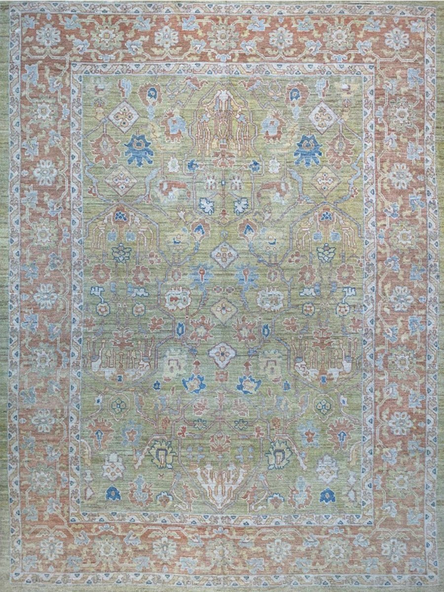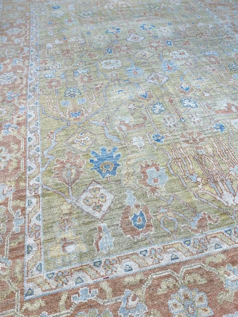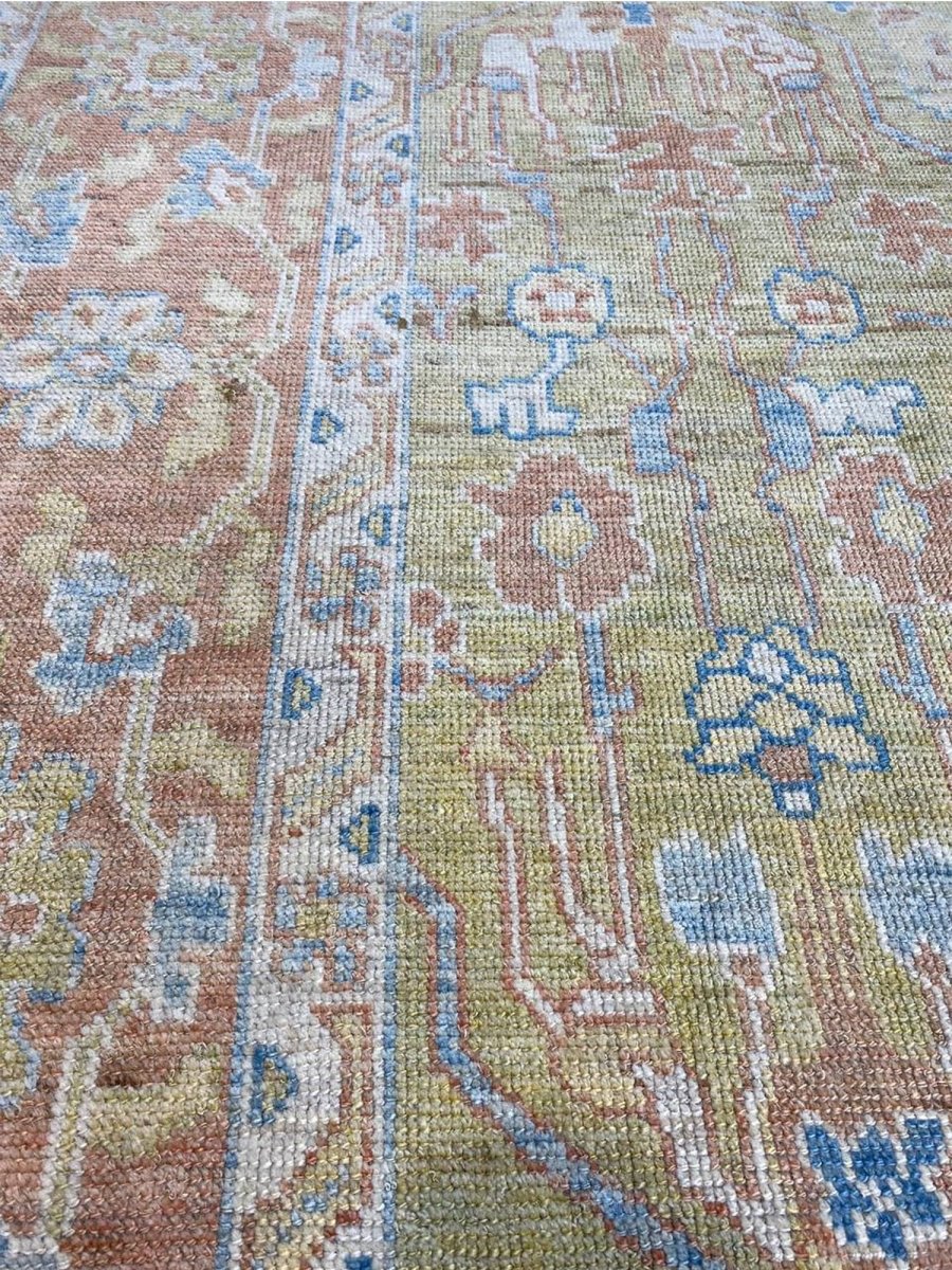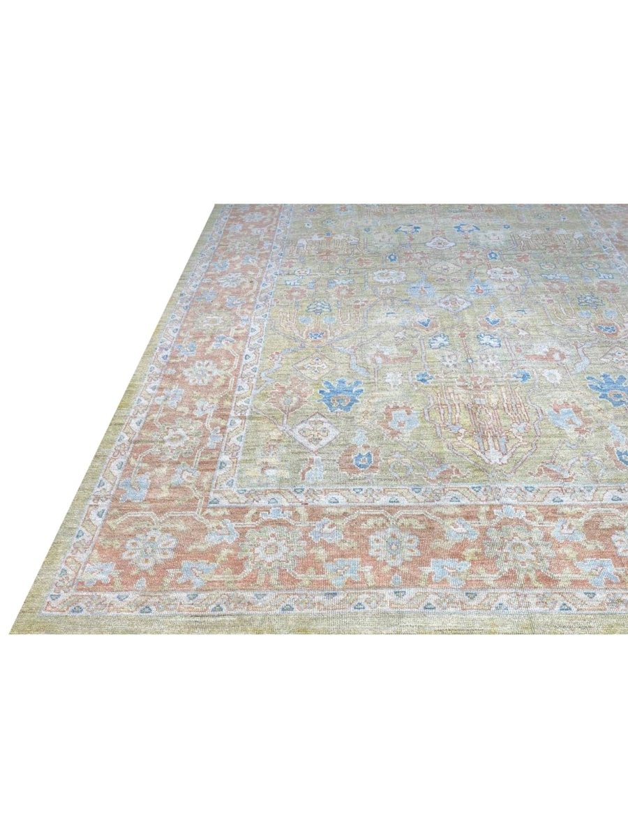Discover the captivating appeal of the 12x17 Turkish Oushak Area Rug, a unique accent that adds classic style to your home. This gorgeous traditional rug, hand-knotted from premium wool, features a beautiful design with geometric motifs that brings personality to any room. It creates a cozy and welcoming ambiance and is ideal for dining tables, living rooms, or as a focal point in your foyer. Its beautiful blend of green, rust, beige, and blue hues makes it a versatile choice for various designs. This outstanding piece serves as a stunning work of art while enhancing your decor. Take advantage of free US delivery.