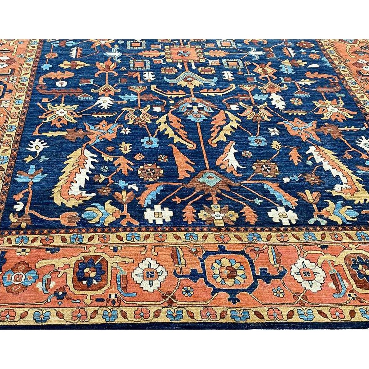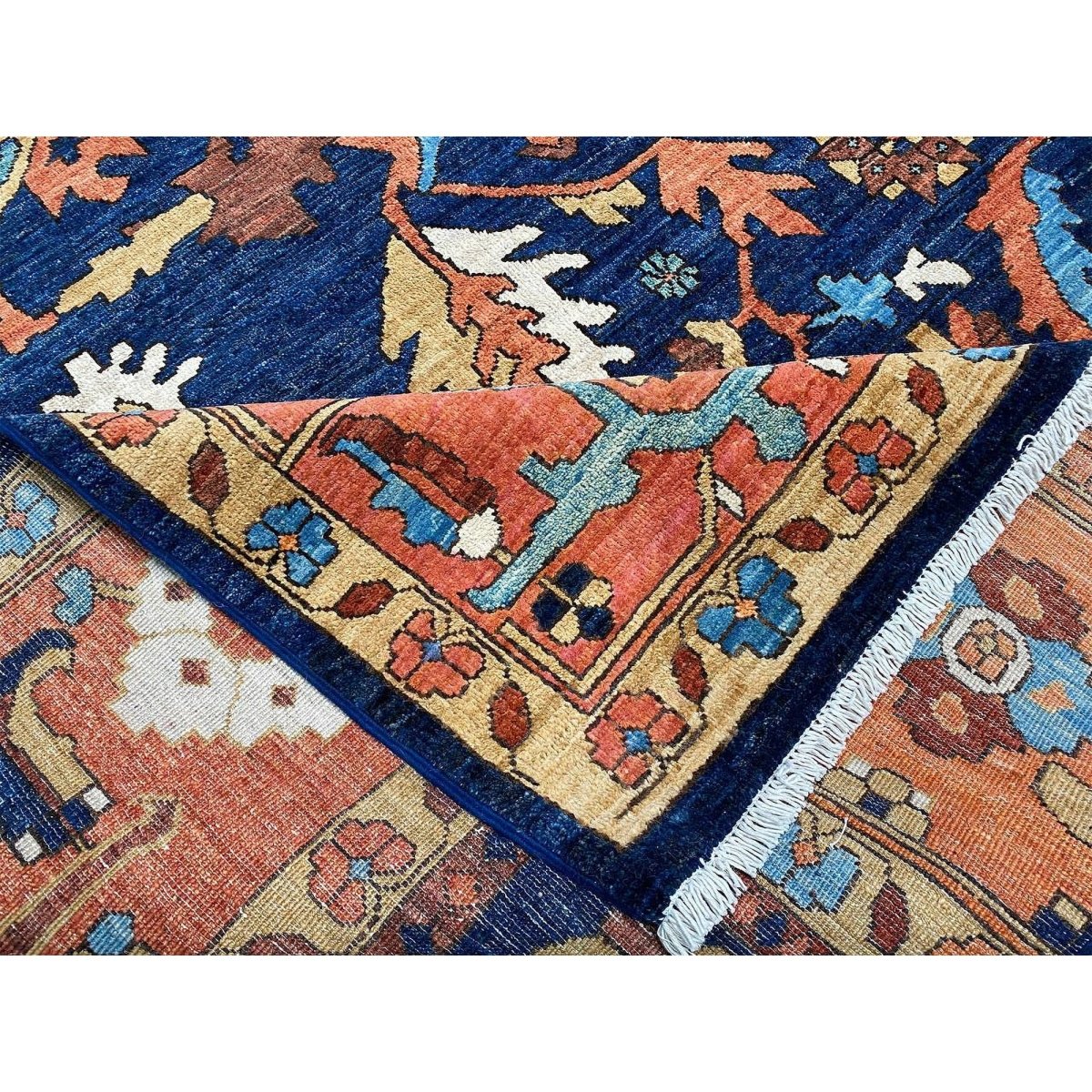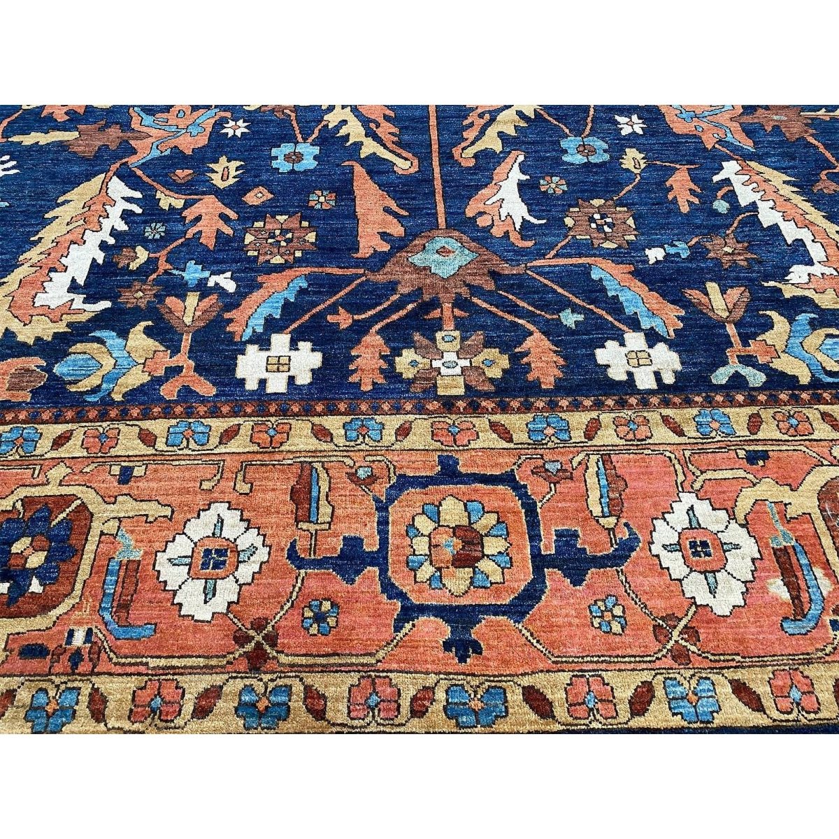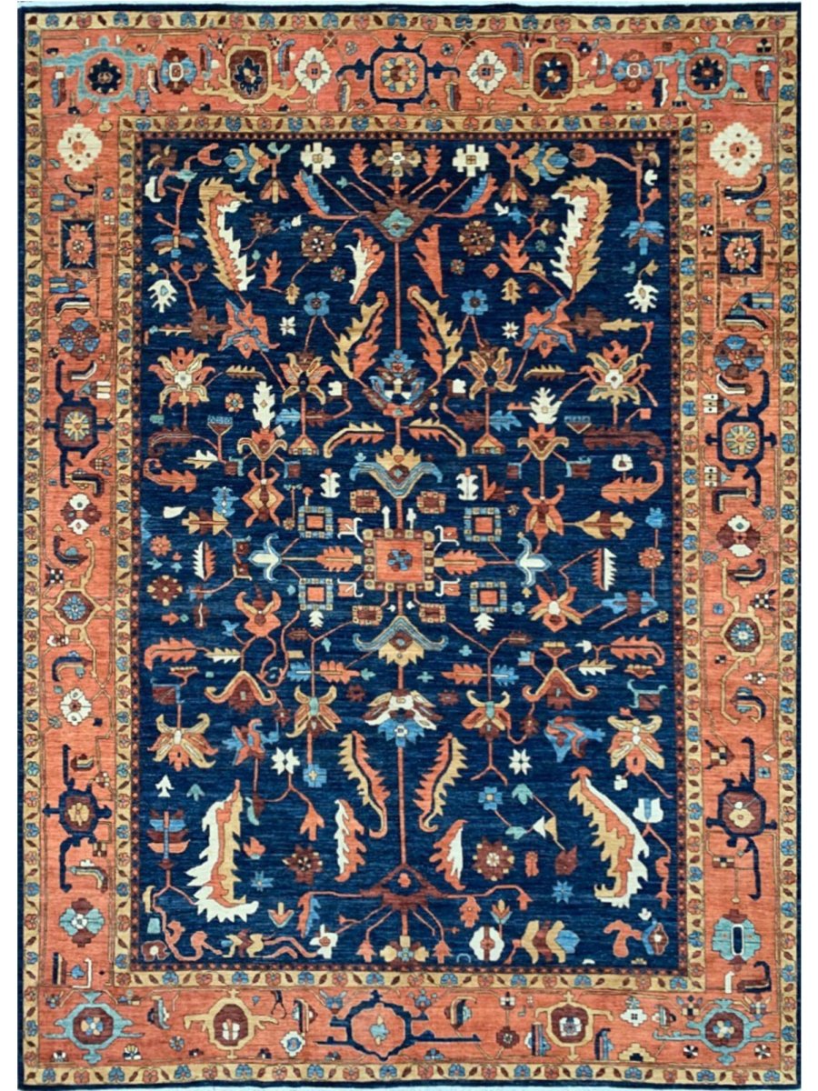 Experience the beauty of the 10x14 Handwoven Serapi Style Area Rug, a unique piece that brings classic sophistication to your home. Hand-knotted with high-quality wool, this exquisite rug features a geometric pattern that adds charm to any room. Perfect for large living rooms, dining rooms, or as a focal point in your entryway, it brings warmth and hospitality to your home. The lovely navy blue, peach, beige, brown, and ivory shades make it a versatile choice for various styles. This remarkable traditional piece not only enhances your decor but also serves as a stunning work of art. Enjoy free shipping within the US.
