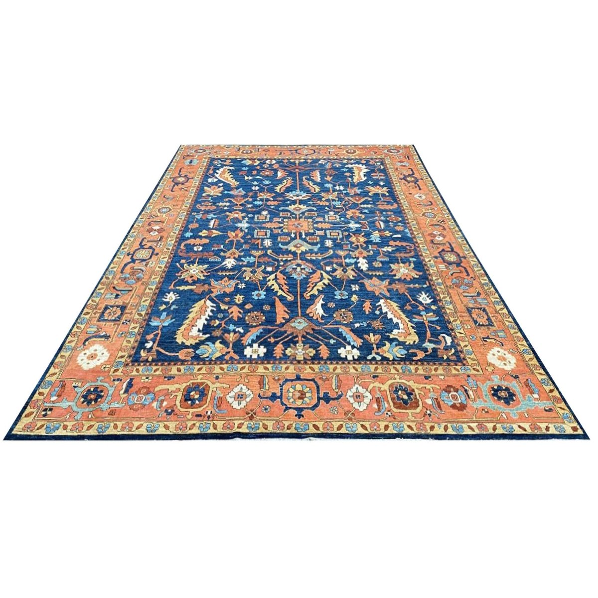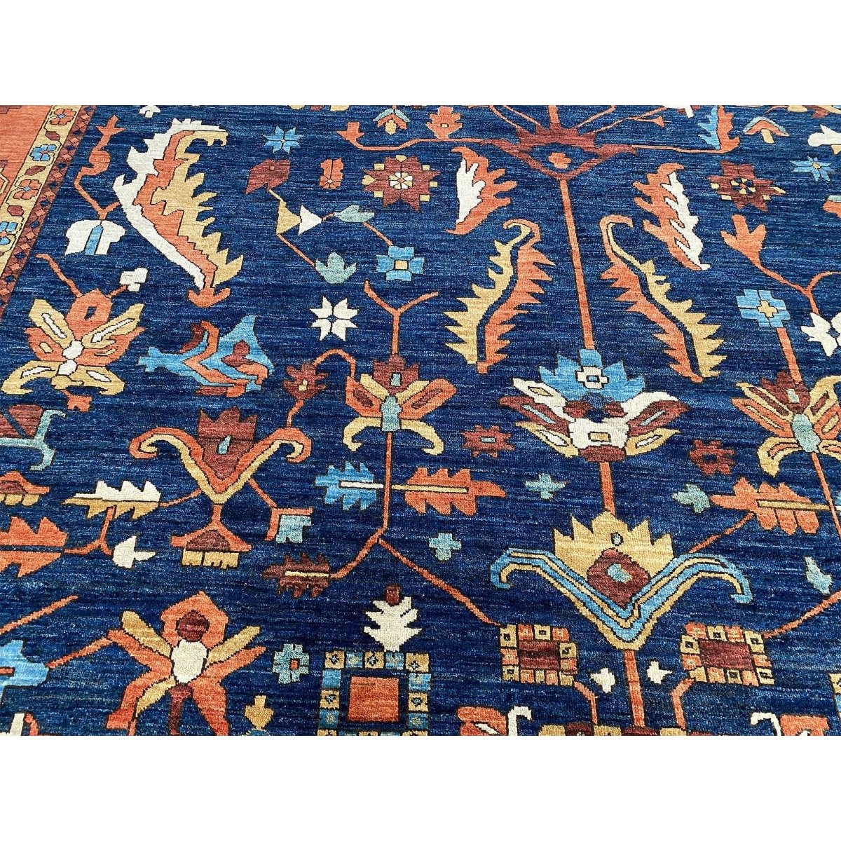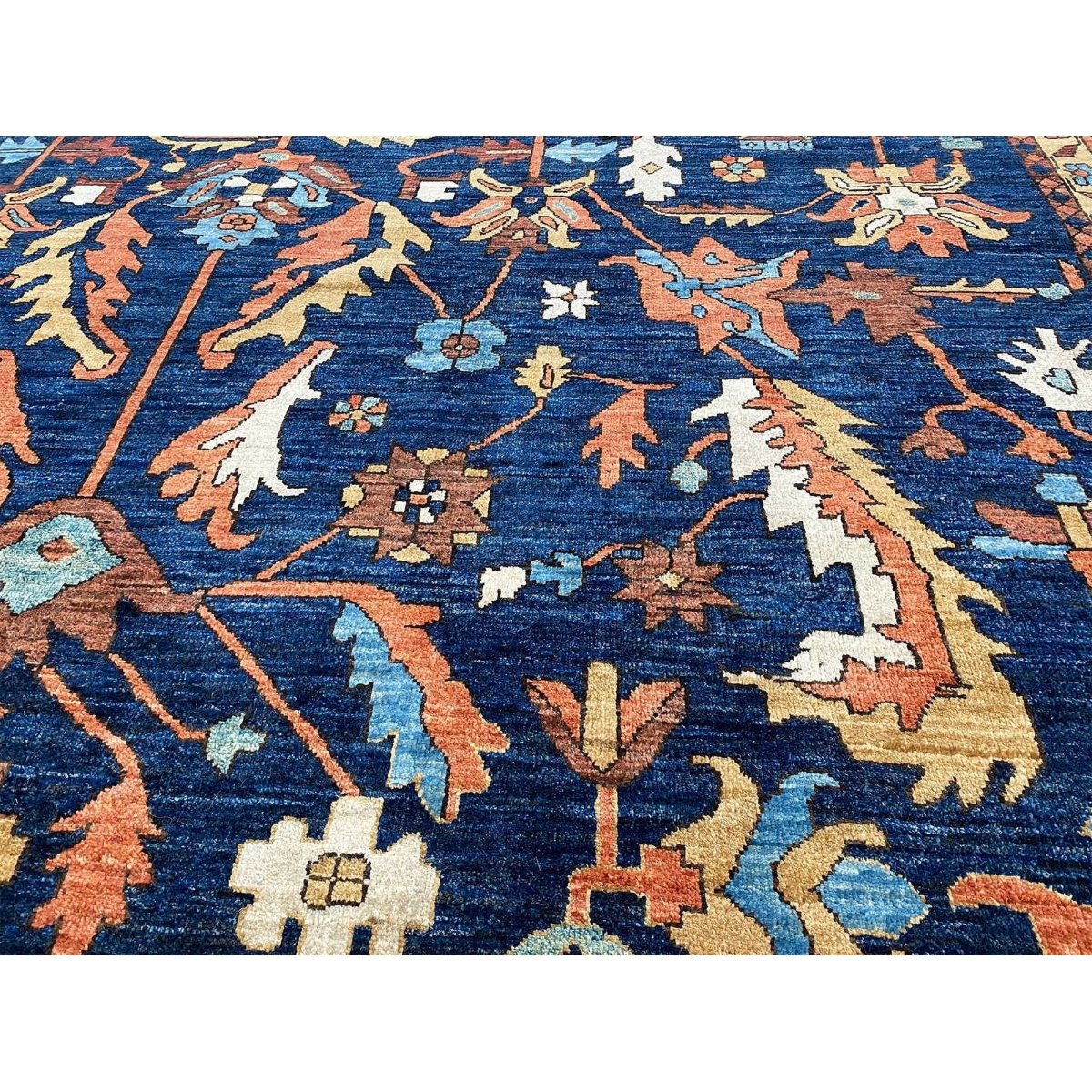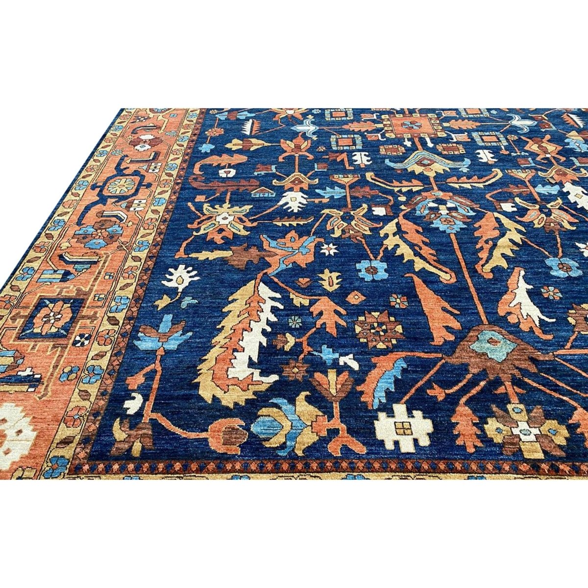 Experience the beauty of the 10x14 Handwoven Serapi Style Area Rug, a unique piece that brings classic sophistication to your home. Hand-knotted with high-quality wool, this exquisite rug features a geometric pattern that adds charm to any room. Perfect for large living rooms, dining rooms, or as a focal point in your entryway, it brings warmth and hospitality to your home. The lovely navy blue, peach, beige, brown, and ivory shades make it a versatile choice for various styles. This remarkable traditional piece not only enhances your decor but also serves as a stunning work of art. Enjoy free shipping within the US.