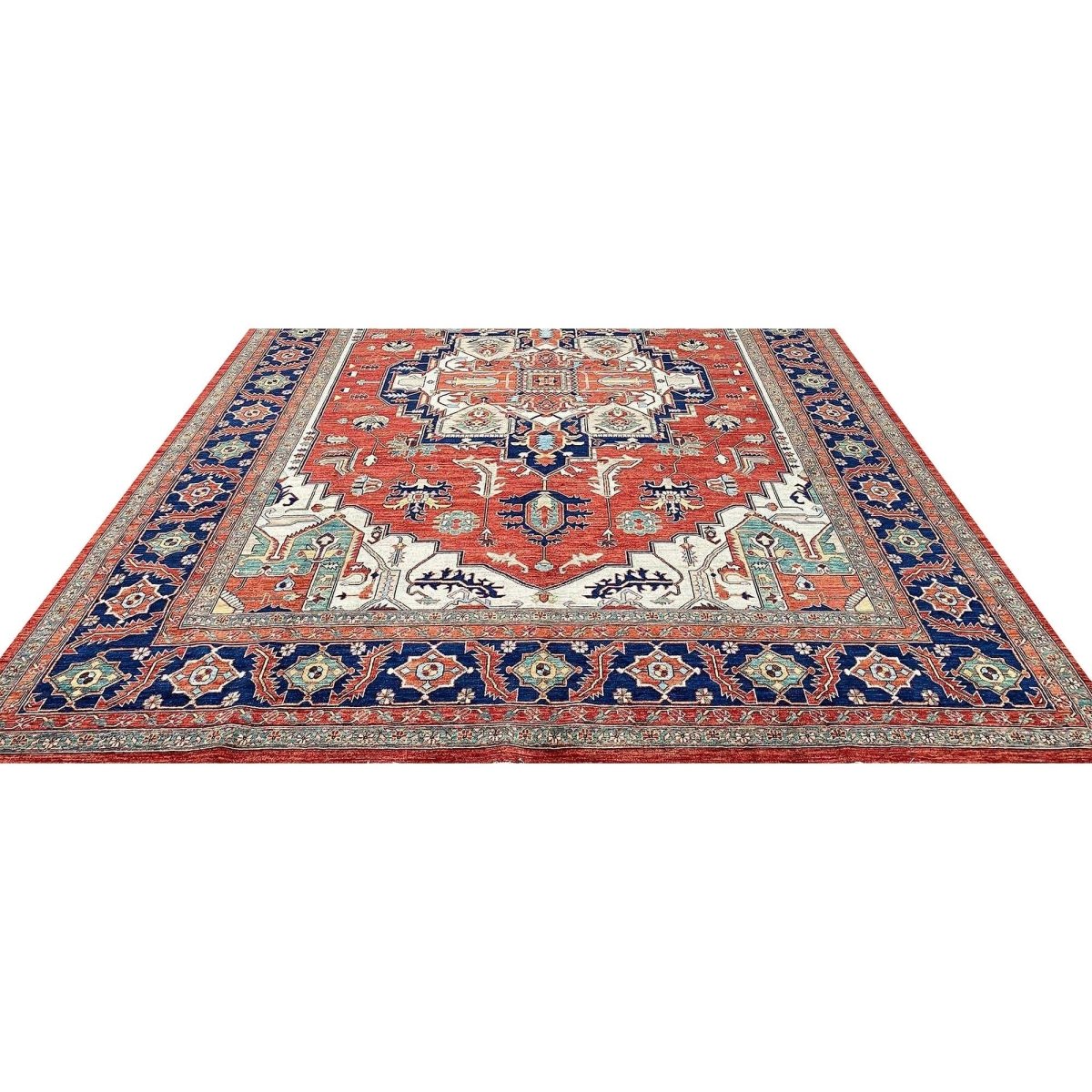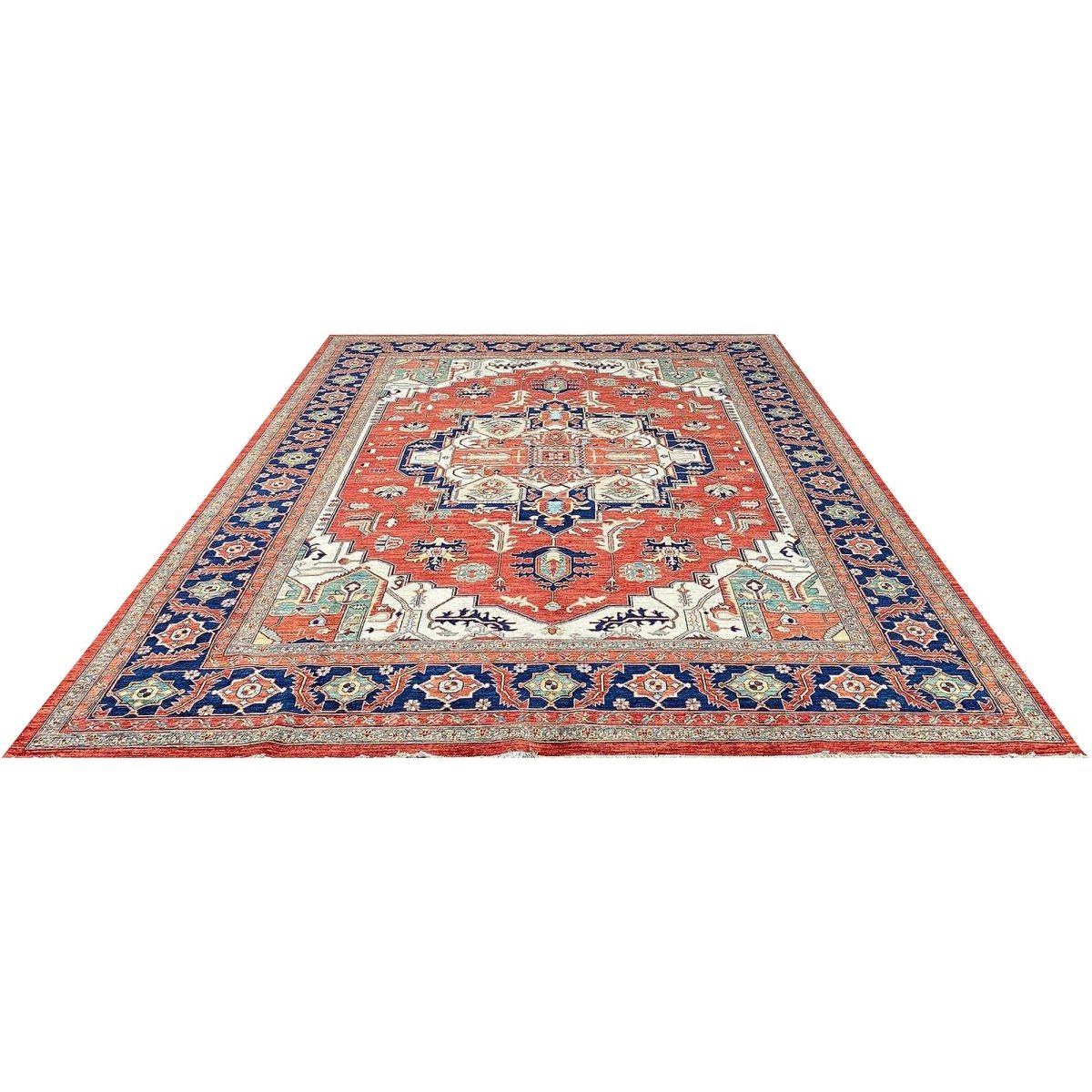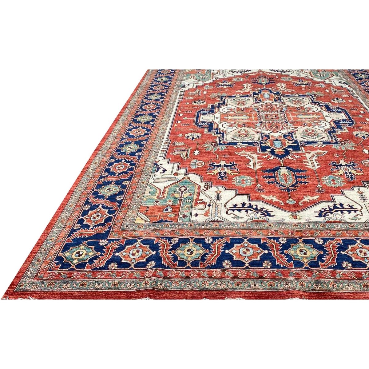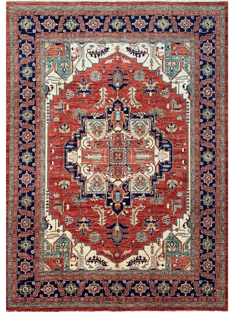 Discover the allure of this 10x14 Handwoven Serapi Style Area Rug, a unique accent that adds classic style to your house. This gorgeous traditional rug, which is hand-knotted from premium wool, has a medallion design that gives personality to any room. It produces a cozy and welcoming ambiance and is ideal for bedrooms, living rooms, dining halls, or as a focal point in your foyer. Its amazing combination of brick red, beige, gray, and navy blue tones makes it a great option for a variety of styles. This outstanding sculpture acts as a stunning piece of art in addition to enhancing your decor. Take advantage of free US delivery.