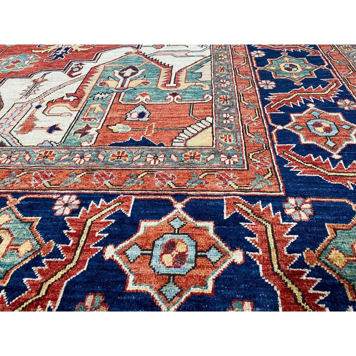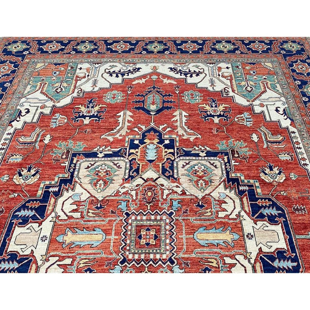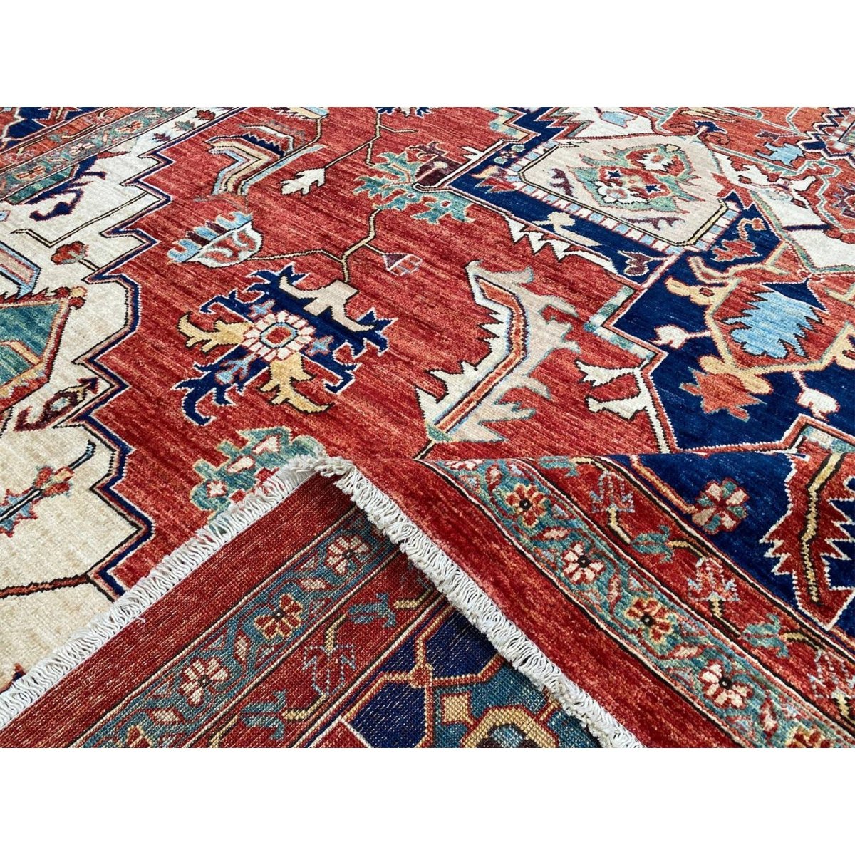 Discover the allure of this 10x14 Handwoven Serapi Style Area Rug, a unique accent that adds classic style to your house. This gorgeous traditional rug, which is hand-knotted from premium wool, has a medallion design that gives personality to any room. It produces a cozy and welcoming ambiance and is ideal for bedrooms, living rooms, dining halls, or as a focal point in your foyer. Its amazing combination of brick red, beige, gray, and navy blue tones makes it a great option for a variety of styles. This outstanding sculpture acts as a stunning piece of art in addition to enhancing your decor. Take advantage of free US delivery.