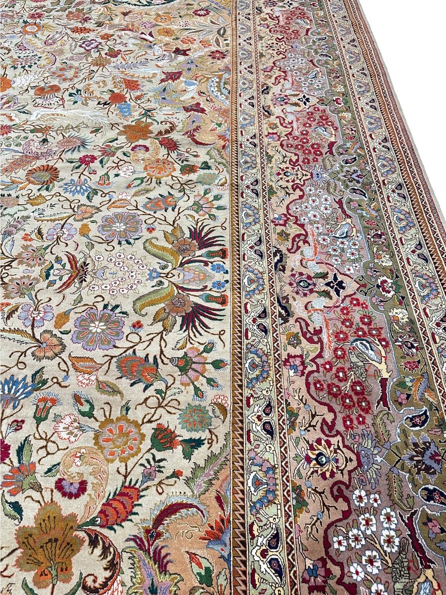 Step into elegance with this magnificent 13' x 20' Old Persian Tabriz rug. Hand-knotted in Persia from fine wool, it showcases an exquisite central medallion pattern. The design unfolds with intricate floral motifs across a captivating gold field and rich borders, detailed in red, blue, green, and orange. This substantial size is perfect for anchoring extremely large spaces, such as grand living rooms or ballrooms, adding timeless beauty and luxurious comfort. The meticulous craftsmanship ensures lasting quality. Bringing this rug into your home adds a piece of art and history, a true testament to Persian weaving tradition. Enjoy its enduring charm.