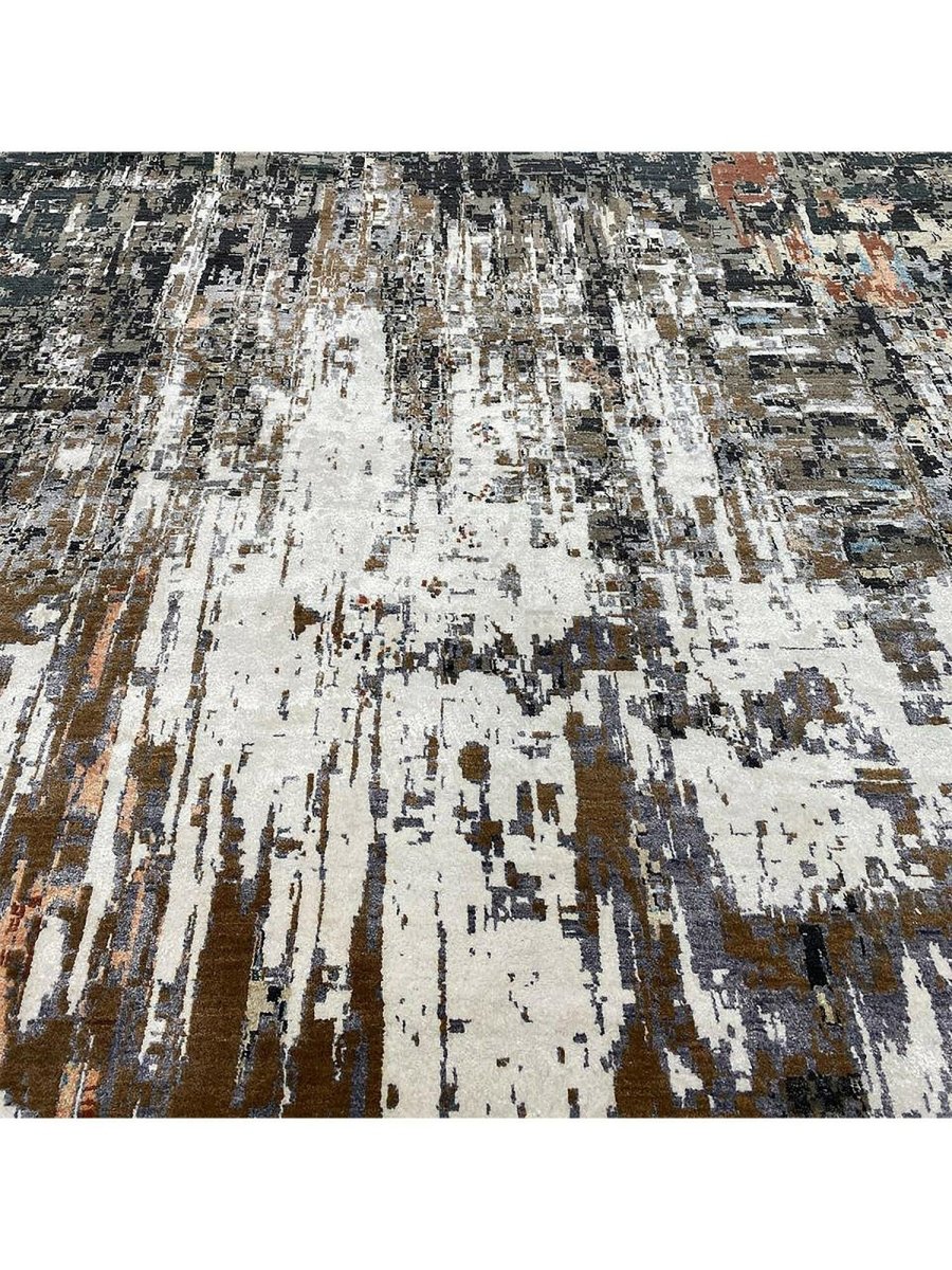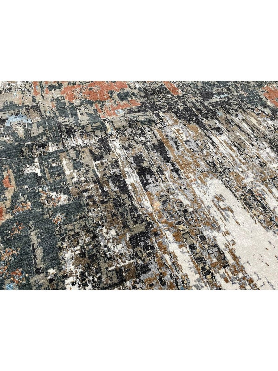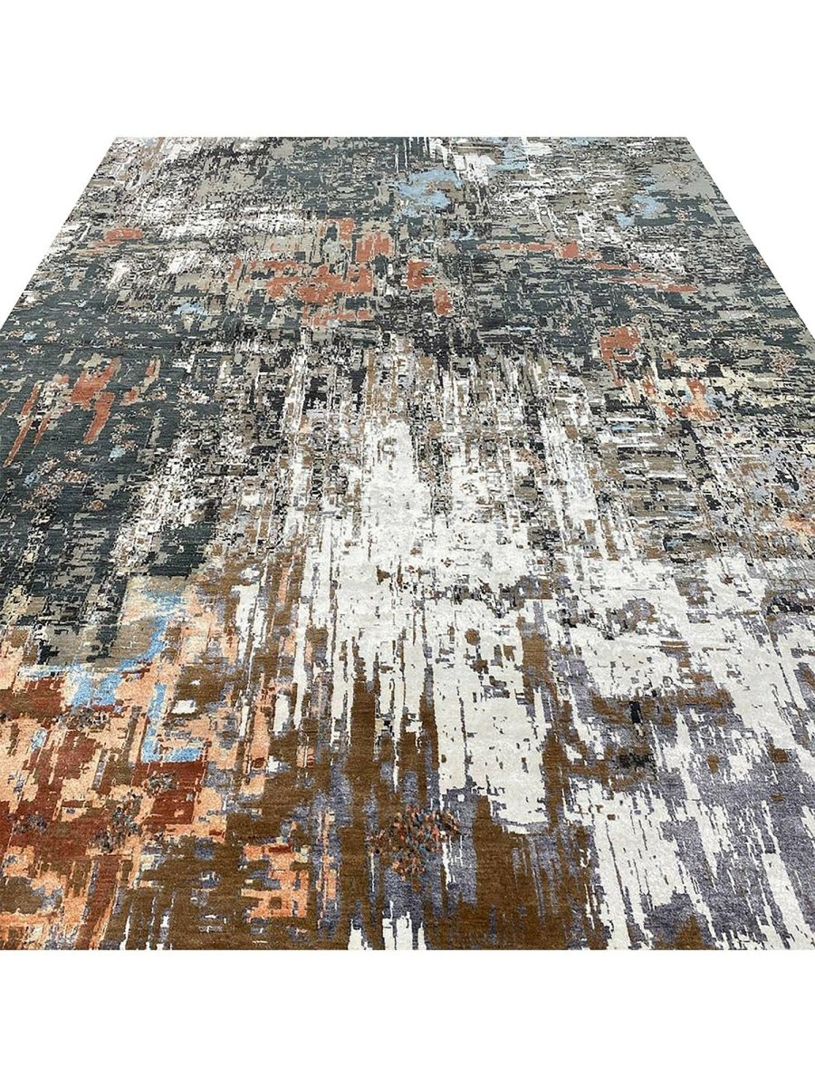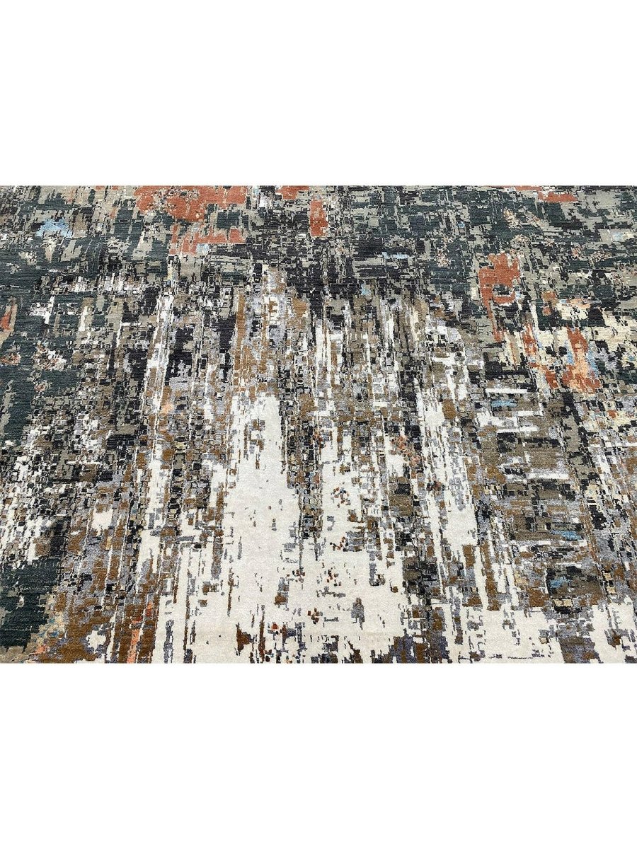 Experience the luxury of this 10x14 Modern Abstract Area Rug, a unique treasure that embodies the rich history of Indian weaving and will transform your space. Made from high-quality wool and bamboo silk, this gorgeous rug features an abstract design that blends seamlessly with any interior style. Its stunning design and exceptional craftsmanship make it a piece that will be treasured for years to come. The striking blend of ivory, charcoal, gray, peachy orange, blue, red, and brown adds depth and character, creating a warm and inviting atmosphere. Take advantage of free U.S. delivery.