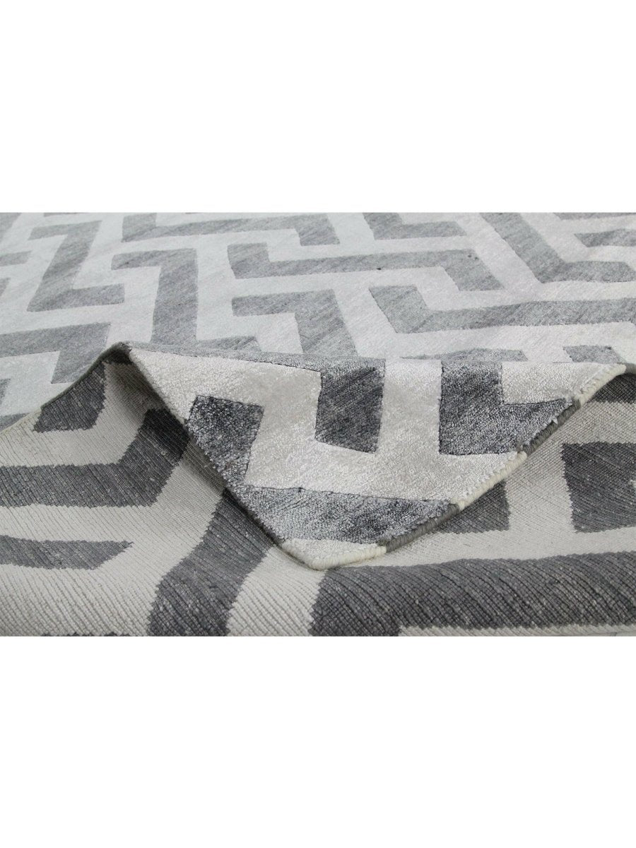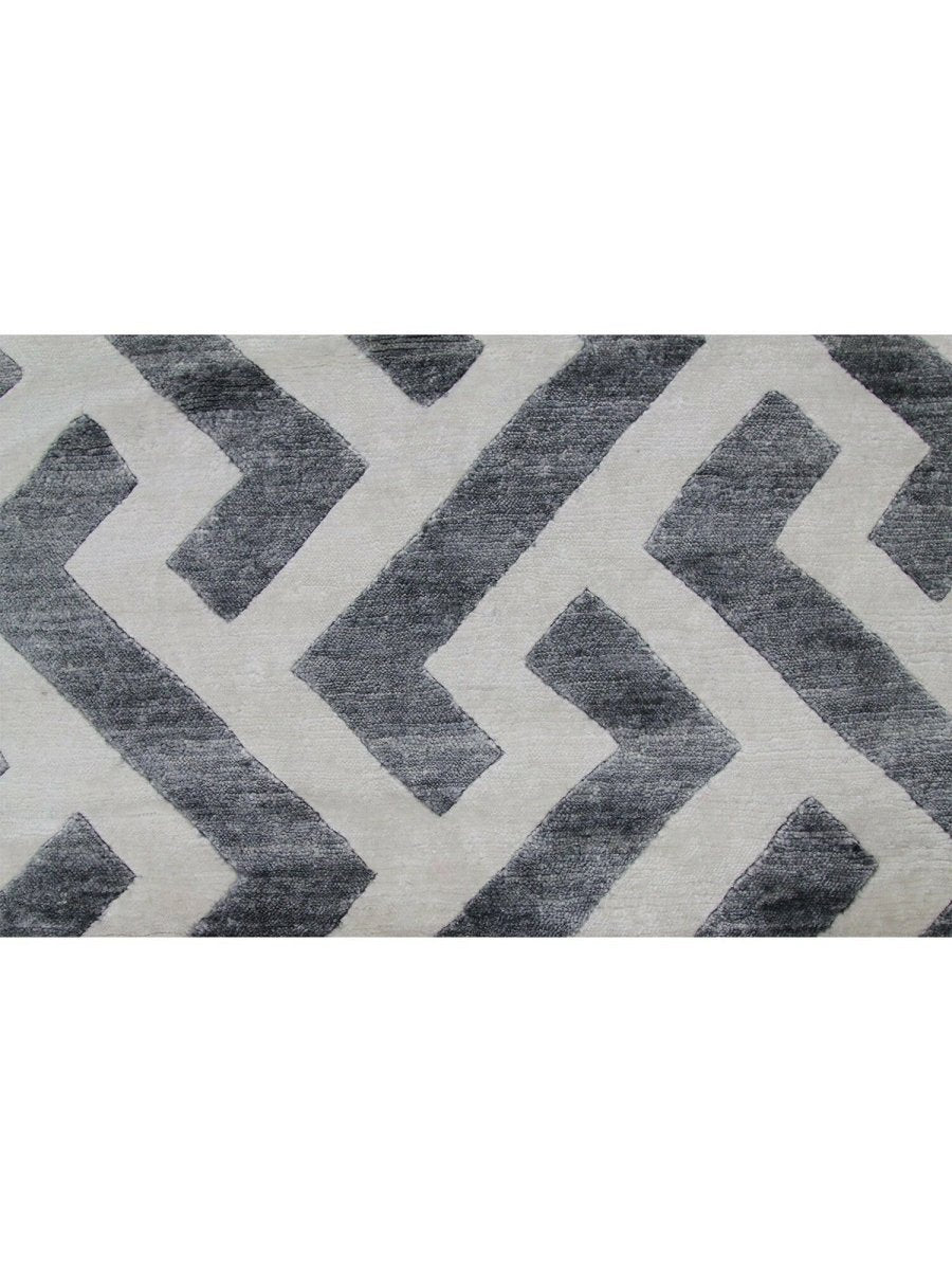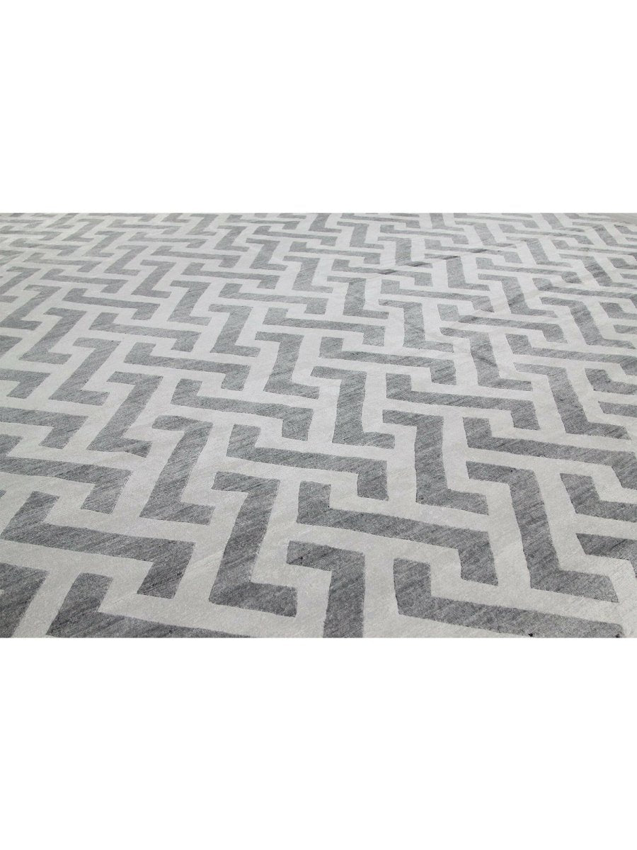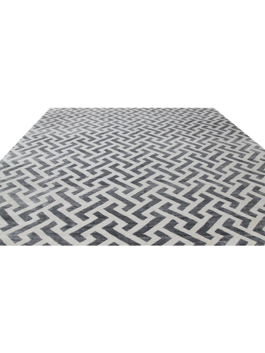 Immerse your space in the sharp artistry of this magnificent 12x15 Contemporary Area Rug. Hand-knotted by skilled artisans in India from a luxurious blend of premium wool and bamboo silk, this new rug offers a soft underfoot feel coupled with exceptional durability. The captivating geometric pattern features bold, interlocking lines in shades of gray against an off-white background, creating a visually striking and modern appeal that effortlessly enhances any room.