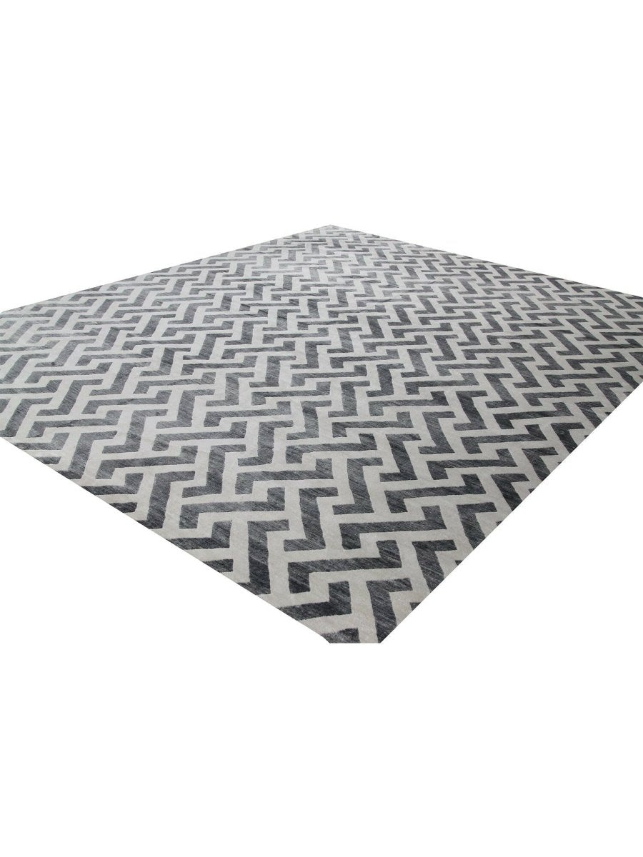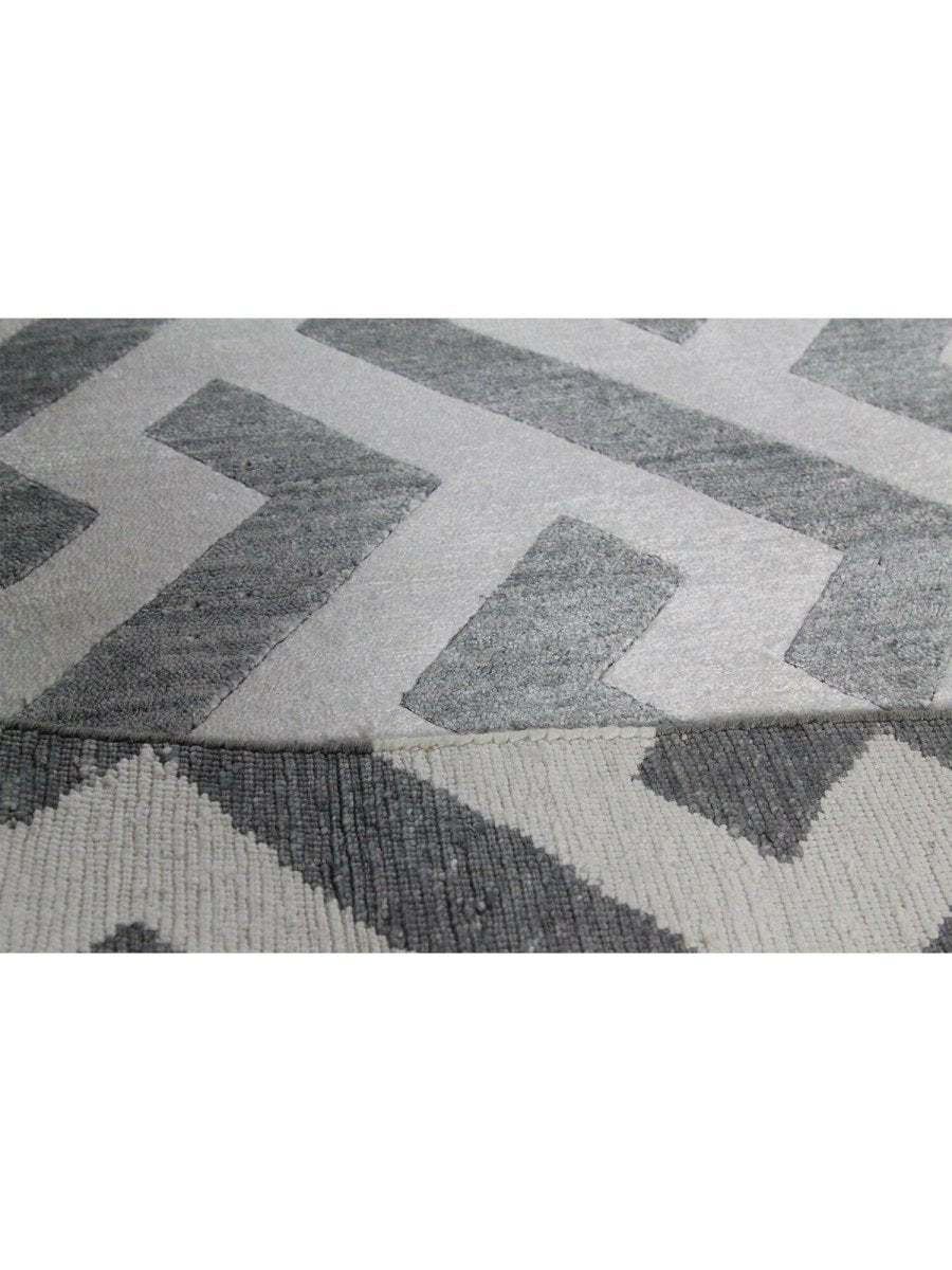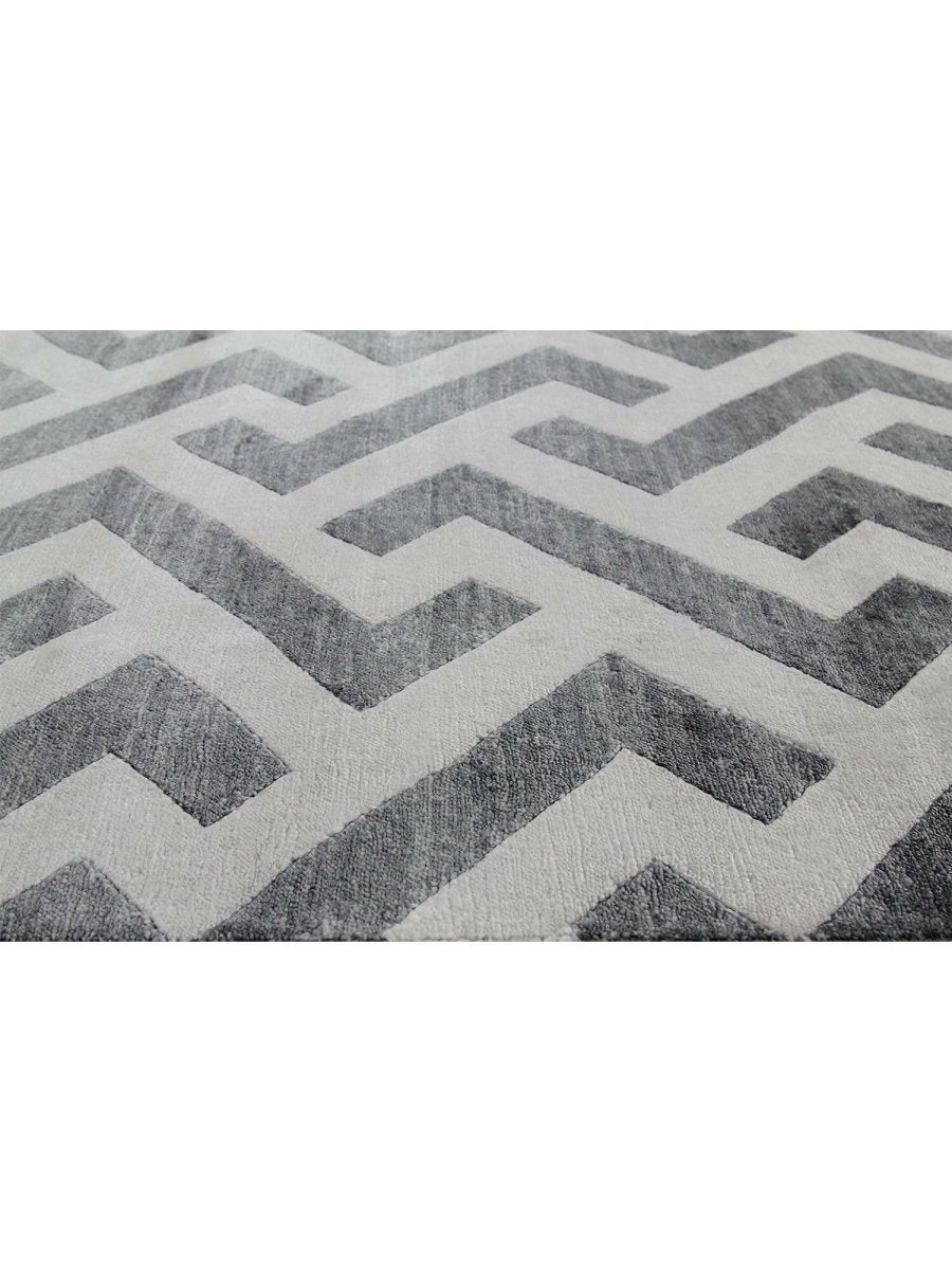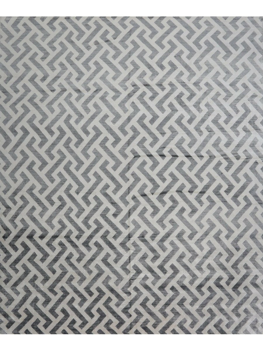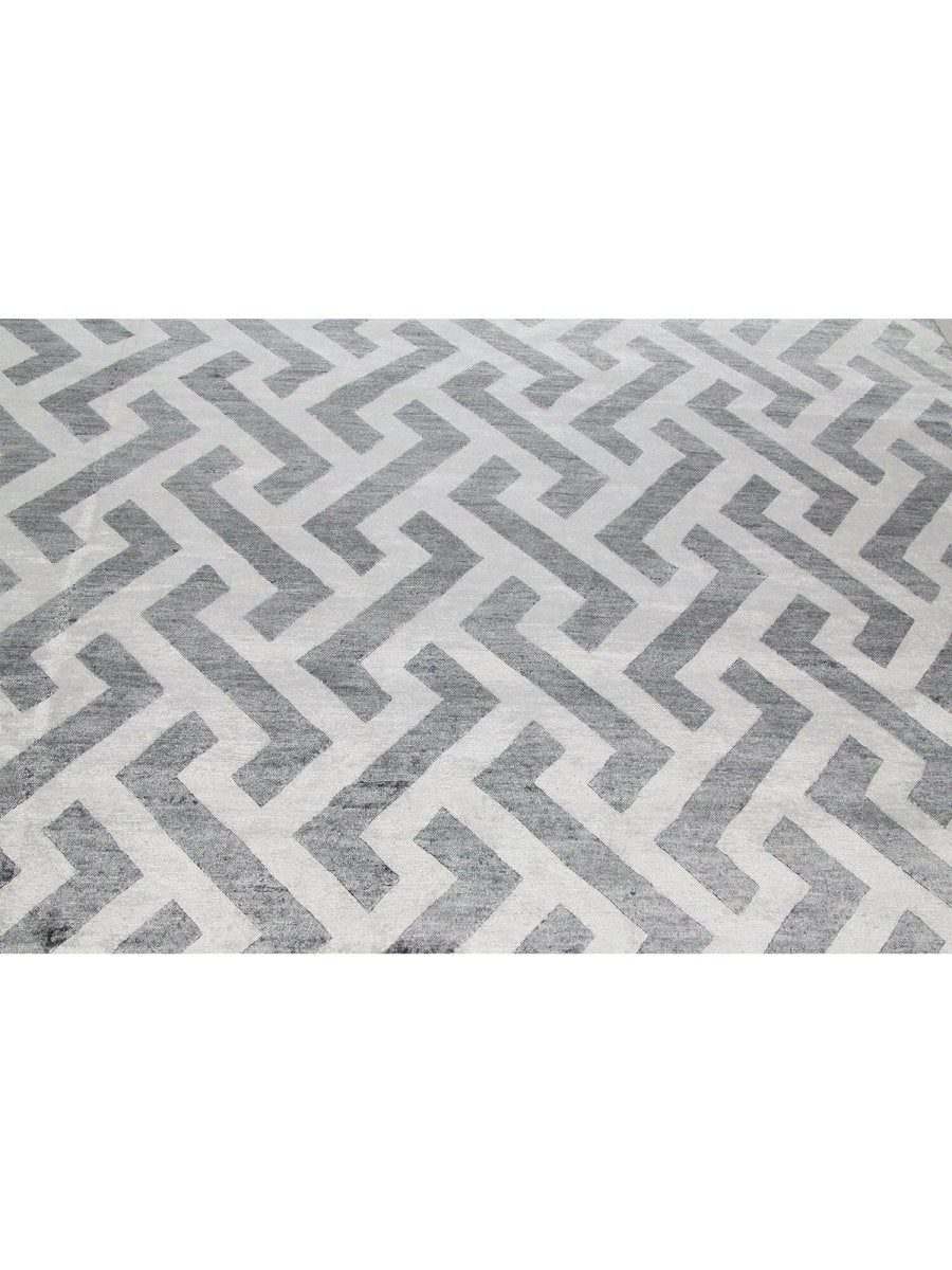 Immerse your space in the sharp artistry of this magnificent 12x15 Contemporary Area Rug. Hand-knotted by skilled artisans in India from a luxurious blend of premium wool and bamboo silk, this new rug offers a soft underfoot feel coupled with exceptional durability. The captivating geometric pattern features bold, interlocking lines in shades of gray against an off-white background, creating a visually striking and modern appeal that effortlessly enhances any room.