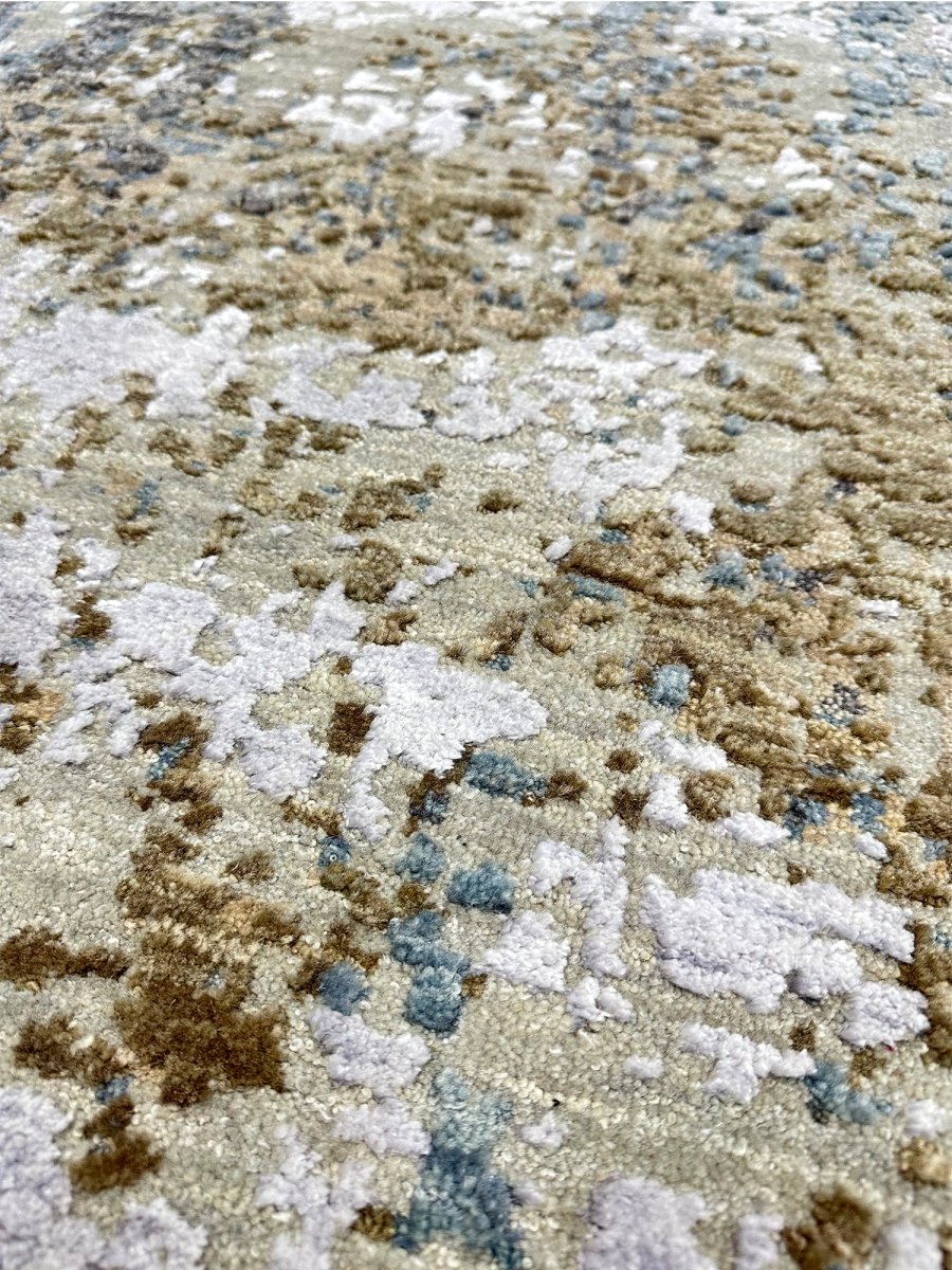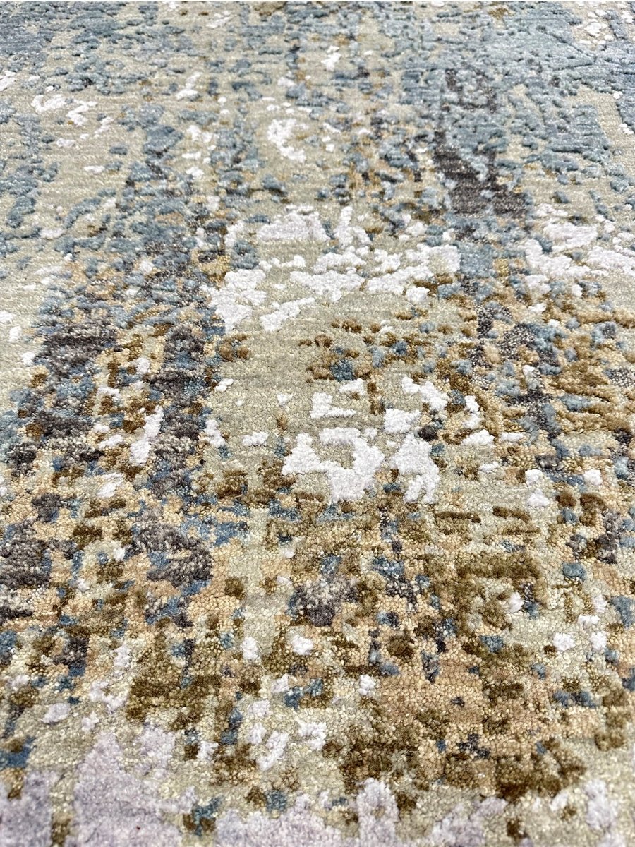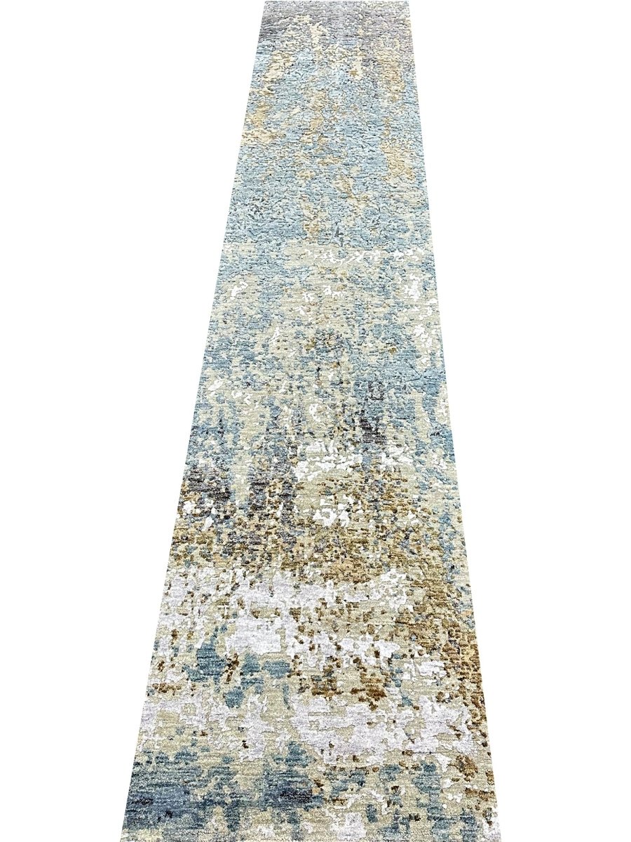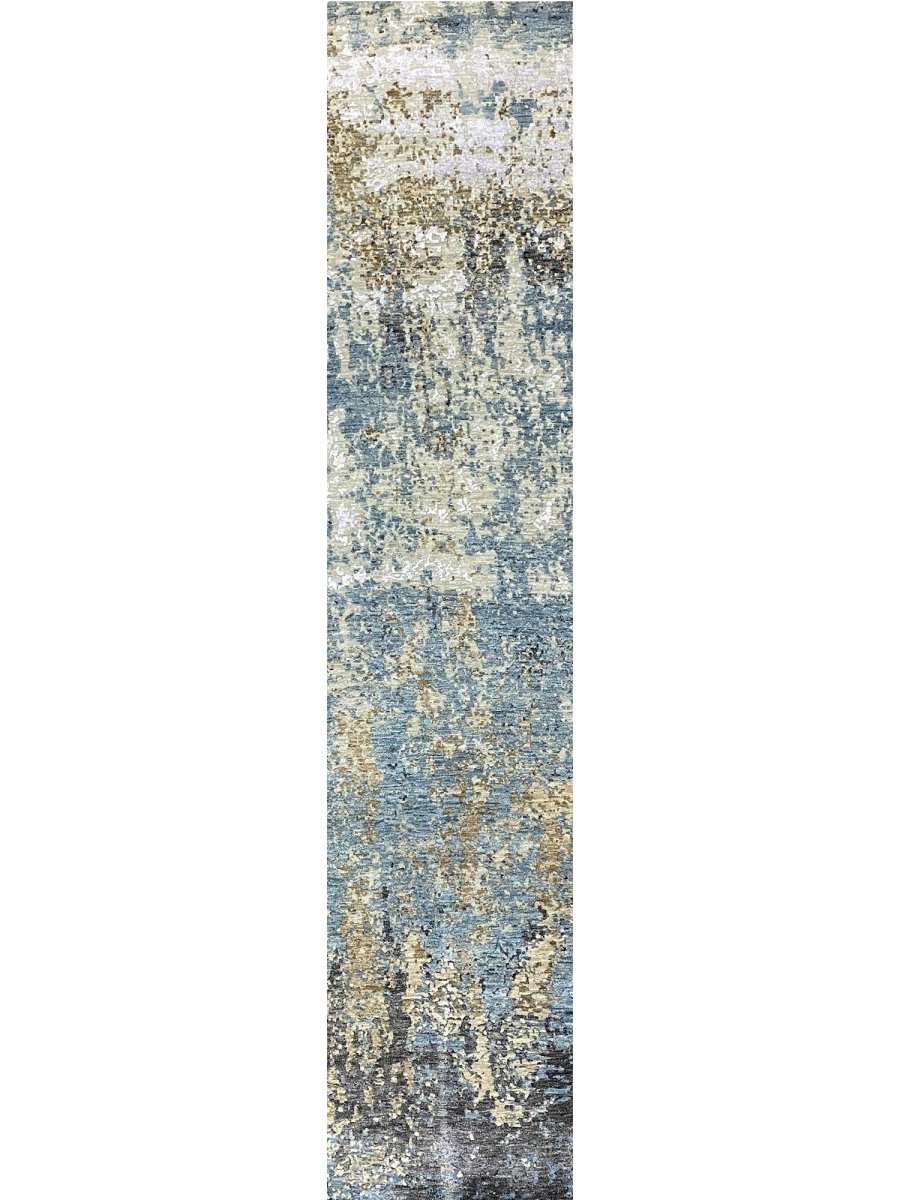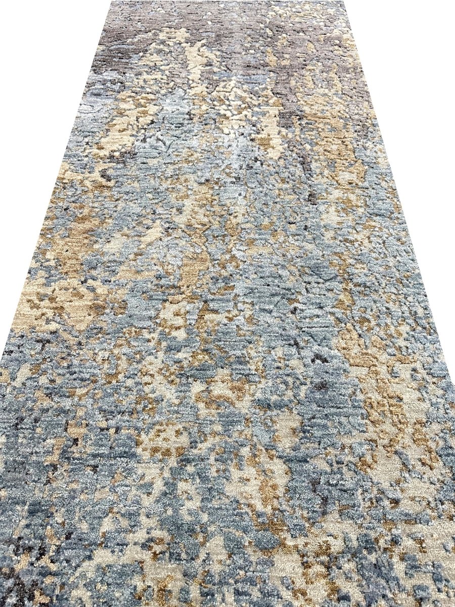 Transform your space with this 3x12 modern abstract runner rug, a striking fusion of art and functionality. Expertly hand-knotted in India using a premium wool and bamboo silk blend, this rug features a dynamic abstract pattern with fluid movement, adding a contemporary flair to any interior. The thoughtfully curated color palette of blue, bold black, artistic beige, and gold accents ensures versatility for modern or any other decor style. Designed for both style and durability, this rug is stain-resistant and soft to the touch. Shop now to get the benefit of free shipping in the United States.